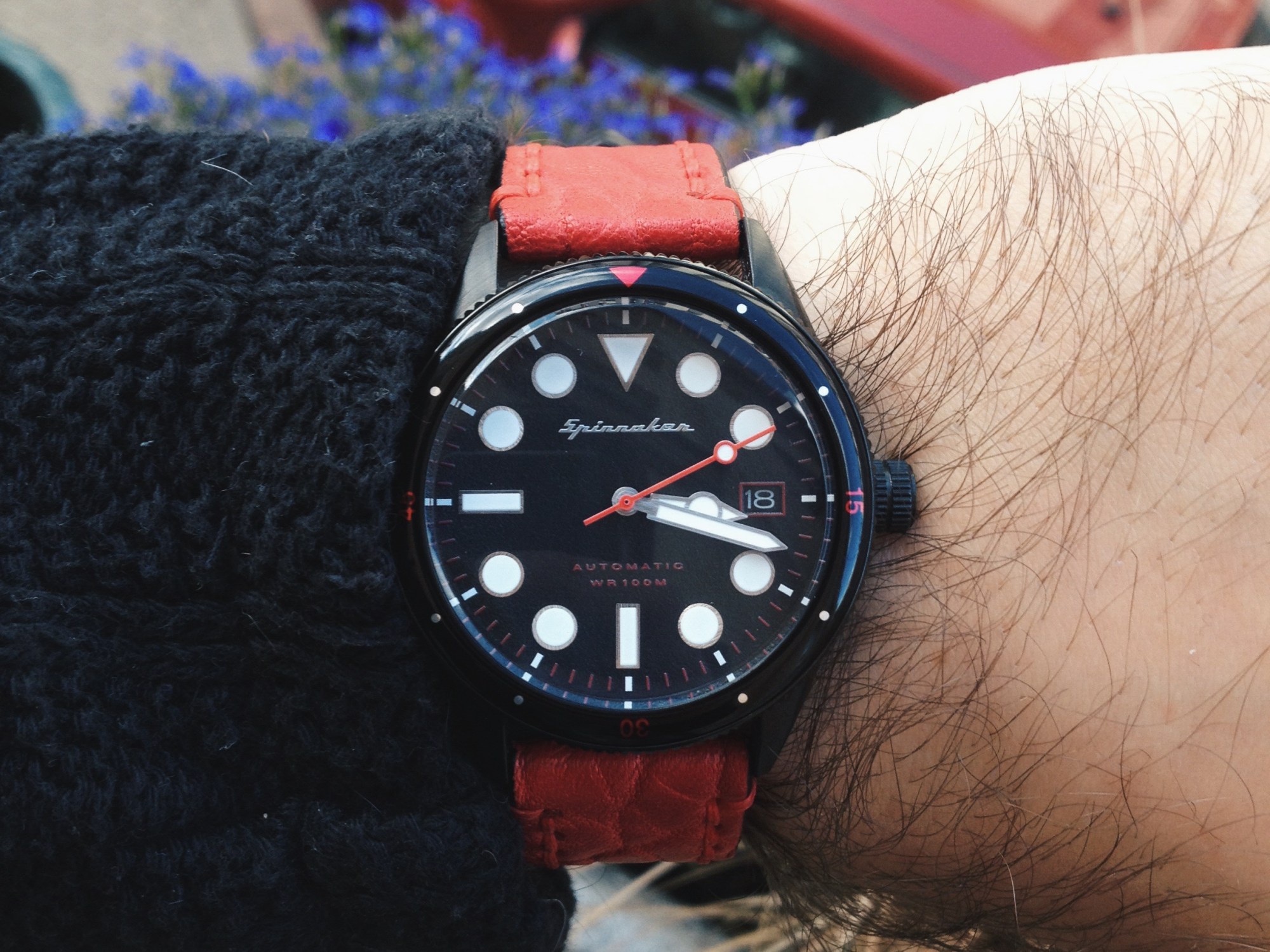 The movement inside is a Japanese Seiko 24 Jewels NH35A which is quite a popular movement that many micro brand use. This movement I have in several of my watches and it has been running great. As with all Japanese movements, they all are workhorses. It runs at about +10 seconds a day. It is automatic, but you can also hand-wind it with a crown. Overall a nice movement. But just as I was writing this I saw something that disappointed me a bit. On the rotor we have this wavy pattern and on a couple of them, you can see something black stuck in. I don’t know if it happened in the factory but to me, that is a bad quality control. But that isn’t something that effects it mechanically so no worries. The strap it came with is a really nice suede one. It is in bright red colour with black stitching. The strap is quite thick, but it looks good. The buckle is just regular one also in black colour and also signed with Spinnaker. But as I have too much watches on suede I swapped it for Strap Bandits leather strap that is also in the same red colour.