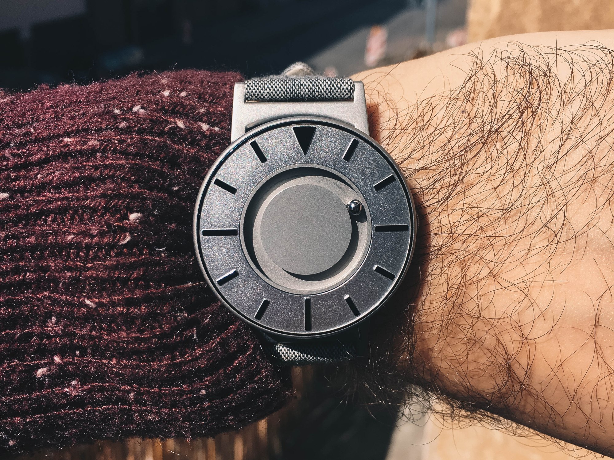 Inside the Eone Bradley is a Ronda Swiss quartz movement that has been modified in a way so that it comprises two small but rather powerful magnets that carry the two balls around their course. The movement is very precise and very robust. The battery life is around 2-3 years. The strap that came with the watch suits it really well. It looks nice with those salt and pepper tones and the white leather underlining makes the strap very comfortable to wear. At first, the strap will be very stiff, but after some wearing time, it will get supple. The tang-style buckle is signed with the Eone logo and is also finished in that bead blasted finish. Overall the watch is really cool and it was everything I hoped it to be. The design and idea of the watch is really something for the price. This watch also made me understand how people with no eyesight read time and how much I depend on sight at the expense of touch. If you liked the watch, go check them out at eone-time.comPrice: €265 @ eone-time.com