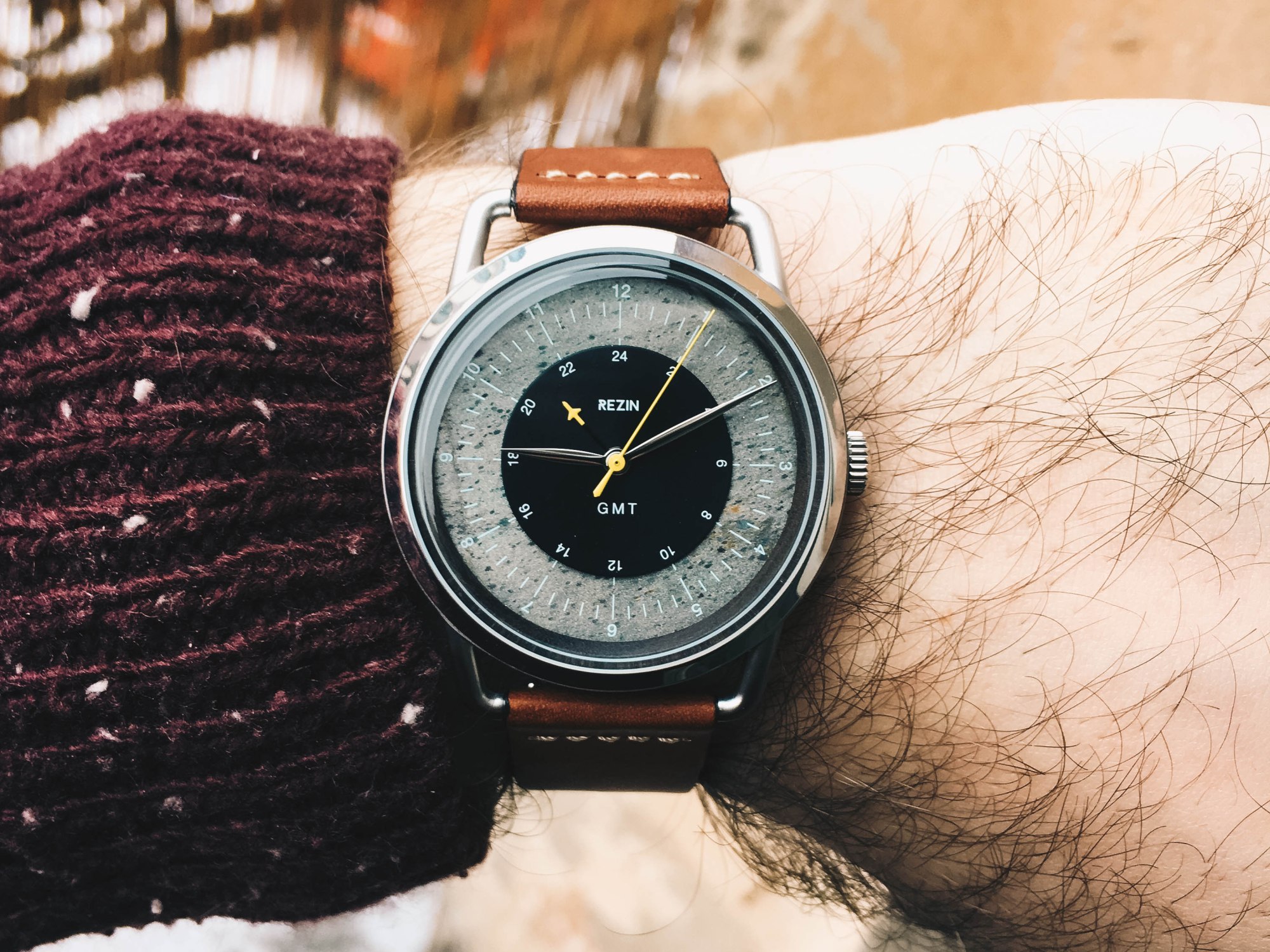 Today we are gonna look at another Kickstarter watch, but with a very cool thing going on from each watch they sell. The company is called Rezin and they were funded through Kickstarter with 210 backers who pledged €27,006. The company was funded in 2014 by three friends and they actually at first started making sunglasses from wood. The brand itself is French. In 2018 they designed a watch collection and they use wood, concrete and other materials for the dials. In the collection, they have three different lines. The one we are taking a look at today, in my opinion, is the best looking and I like that it has the GMT hand. All their watches are hand assembled in Besancon (France).