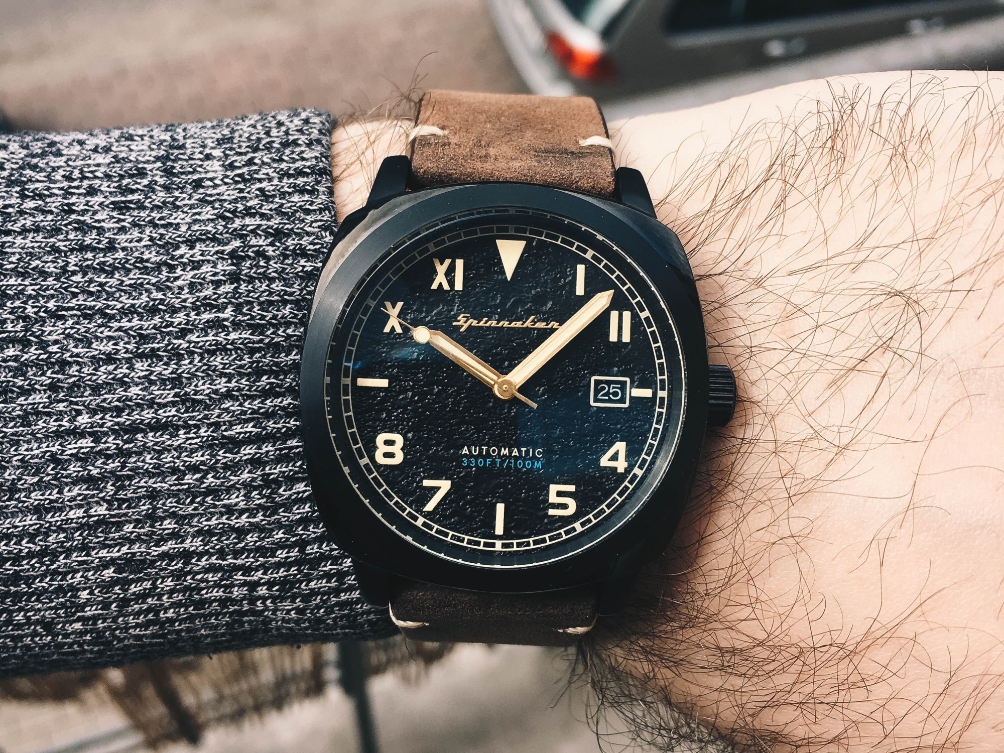 The dial is really cool on this Hull. It has this granite, very rough texture in black with a matte finish. Around the dial, we have the railroad style minute track in white. The dial, of course, is California style which means on top we have the Roman numerals and on the bottom Arabic. All the indexes have this creamy coloured vintage lume on them and I just love it! Some hate the faux-patina, but I love it as it gives the watch vintage look without sacrificing the durability of it. The index style hour and minute hands are in gold colour with lume in the middle. The lollipop style seconds hand is also in gold colour with a little dot of lume. The lume Spinnaker used is the Swiss Super-Luminova and it has a decent green glow. At 3 o’clock we have a date window with white outline framing it and the black date wheel is matched with the dial colour. I also like that the Spinnaker logo at 12 o’clock is also in the gold colour.
