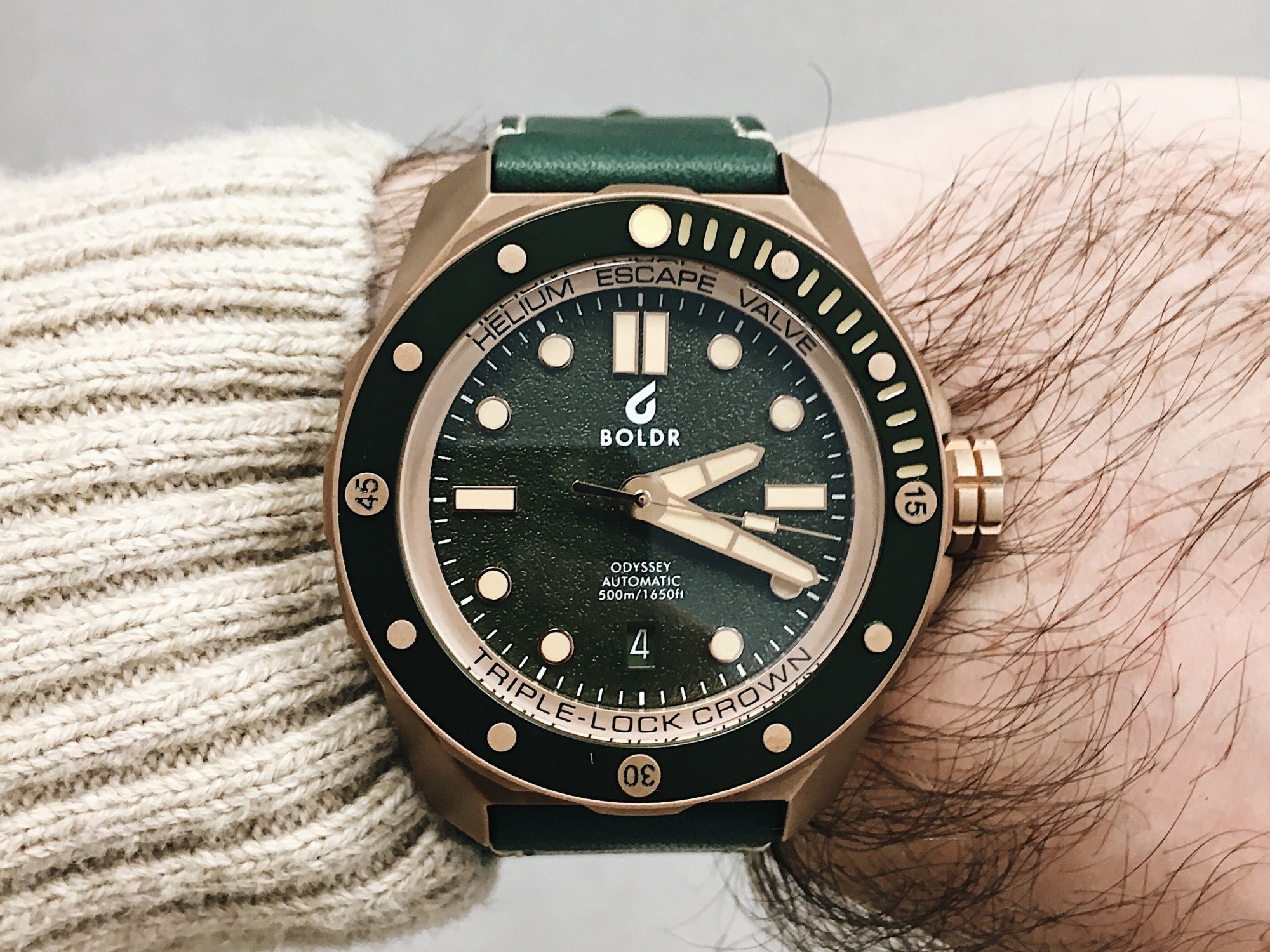 Today we are gonna look at another Boldr watch and this time it is from the Odyssey series. I actually wanted to review one of the watches from these series as it is the most successful model of Boldr. And I have to tell you that photos on their website don’t do justice for this watch, also at first I didn’t like the look of them, but after seeing the watch in flesh it kind of grows on me, and it is stunning! Boldr already had this watch in the Bronze case, but it had bezel without the aluminium insert. Boldr released two new models, the one we see here with green accents called Serpentine and another one with blue accents. The Green, in my opinion, looks the best out of the two as green colour goes really well with the bronze case.