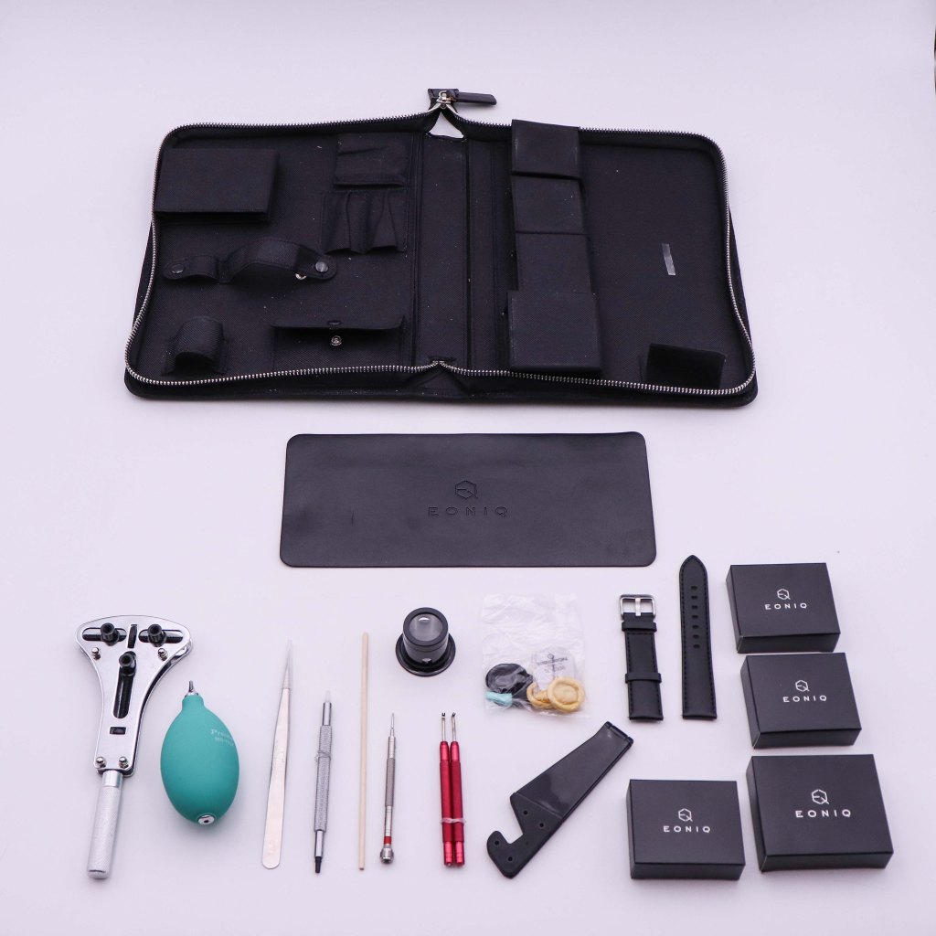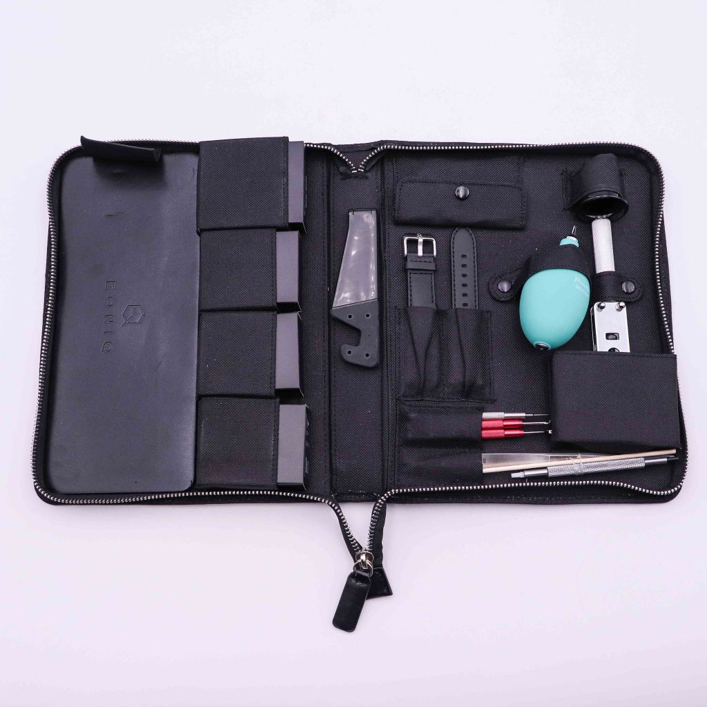 The watchmaking tool kit arrived in a very neat cardboard box. Inside you will have a zip pouch with all the tools and watch parts inside. I chose the skeleton model with a blue dial. So inside the kit you get: