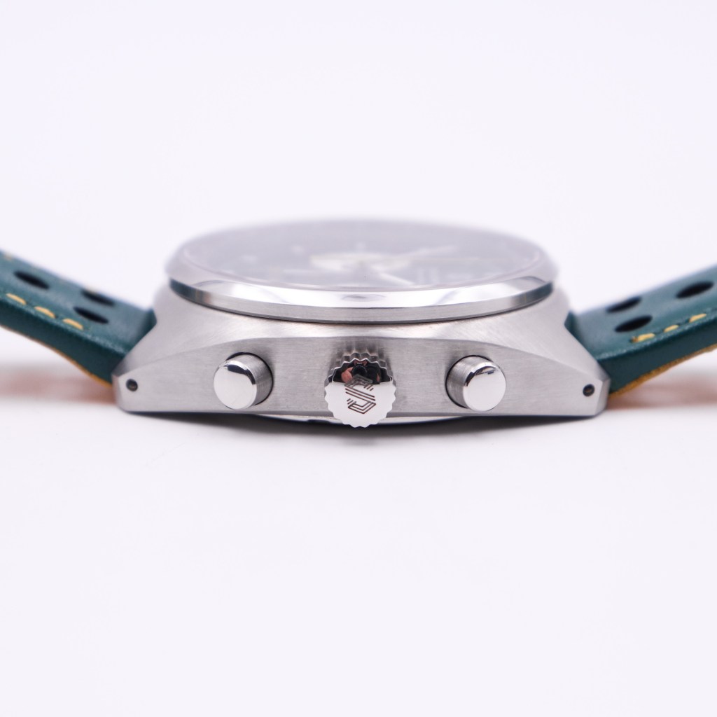 The case of the Green Forty Nine is made of 316L. The case is made in the 70s style with the barrel-like shape. The CNC is amazingly well done on the case. The lines and angles are sharp. The finishing is also really good, the satin-brushed surfaces are smooth and the finishing is consistent. I also really like that the solid stainless steel bezel is polished as it makes the watch pop more. The case is 42mm wide, the thickness is 14mm, from lug to lug it measures at 50mm. The case on the paper sounds big, but on the wrist, the watch wears smaller, the only thing is that it sits high on the wrist, but that is typical for mechanical chronograph at this price range. At 3 o’clock we have a push-pull crown which is signed on top with Soldat logo. At 2 and 4 o’clock, we have a pump pushers for the chronograph functions (start/stop & reset). The crown and pusher action is really good. Pushers push in smooth with that pleasant mechanical “click”. The solid screw-in case back is kept simple with the middle part brushed and the outside polished. In the middle, we have the Soldat logo with some specifications and model number. I wish made this watch with a see-through window as the movement is pretty good to look at as it isn’t just a simple time only movement. On top of the dial, we have a flat sapphire crystal. The water resistance is 5ATM (50m) which is the usual one for chronographs, but just remember, no swimming with this one! Maybe some light rain or handwash, but nothing more!