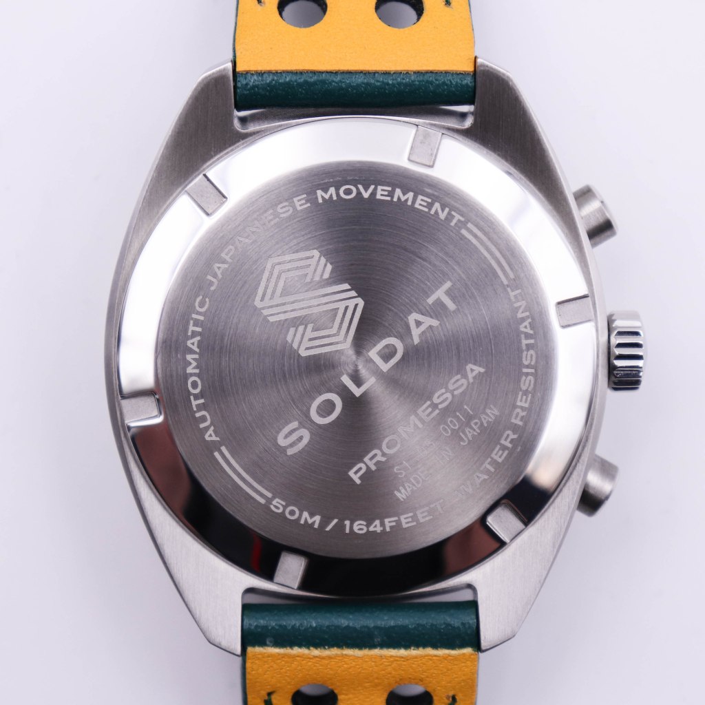 The company is called Soldat. Soldat is a new company out of Indonesia and founded by Jesse Prawiro, a watch enthusiast who, like many before him in the micro-brand world, wanted to turn his hobby into a career. Soldat’s first collection I called Promessa, and it consists of three retro-inspired chronographs (blue, red and green), all designed in Switzerland by Studio Divine and manufactured in Japan and powered by Seiko’s NE88 automatic chronograph calibre.
