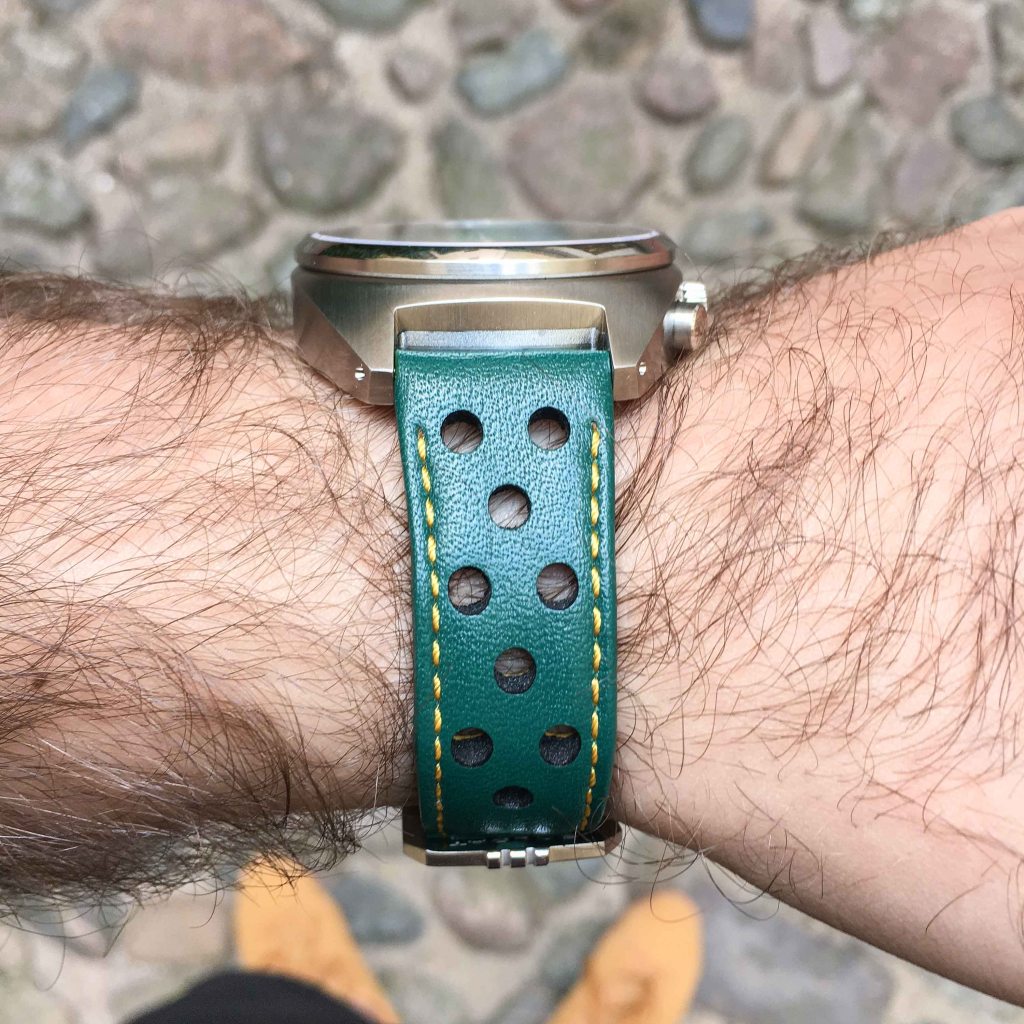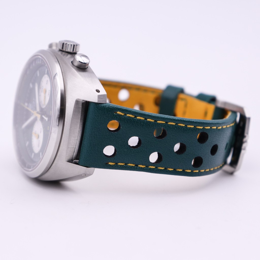 The perforated green leather strap is really nice. The top is green with contrasting yellow stitching and the underside is yellow with contrasting green stitching. The perforated leather gives the watch the racing watch look it deserves and also it makes it functional as your wrist breathes when wearing in hot temperatures. The strap is 20mm wide at the lugs and 17mm at the buckle. The stainless steel buckle is finished in brushed and polished finishes. The strap is actually pretty supple and wraps the wrist nicely right out of the box. The watch also wears very comfortably on the wrist.