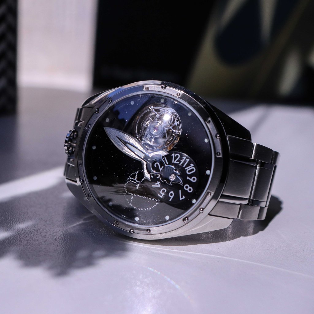 The dial is really something, it is a pure black Aventurine glass dial. It has sparkles and kind of purple haze in the sunlight. At 3 o’clock we can see the Tourbillon cage going in 360 degrees. At 9 o’clock we have the ERA logo which in my opinion looks very bad and I wish they stopped putting it on the dial as it kind of ruins it. Around the dial, we have white hour markers which are lumed. The most interesting part is how it shows time, it is called a wandering hours complications, so the rocket-shaped hand is for minutes and the wheel shows the hours in the round portion of the rocket. In my personal opinion, the rocket also was unnecessary detail as it kind of cheapens the watch. The dial actually has a lot of movement happening with the tourbillon going round and round and the big rocket hand moving and the disc too. It takes some time to get used to how to tell time, but it for sure is an interesting complication which is getting quite popular in the microbrand scene. But I saw some mistakes on the hour wheel, on their promotional photos and renders it hows much bolder font for the numbers and also there is a strange line under 6 an 9 which has no actual meaning, so it looks like a typo that QC of the factory missed.