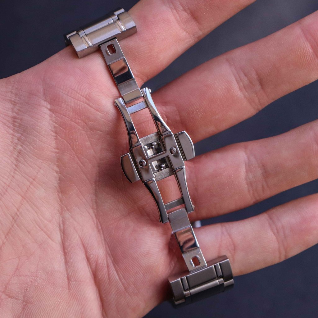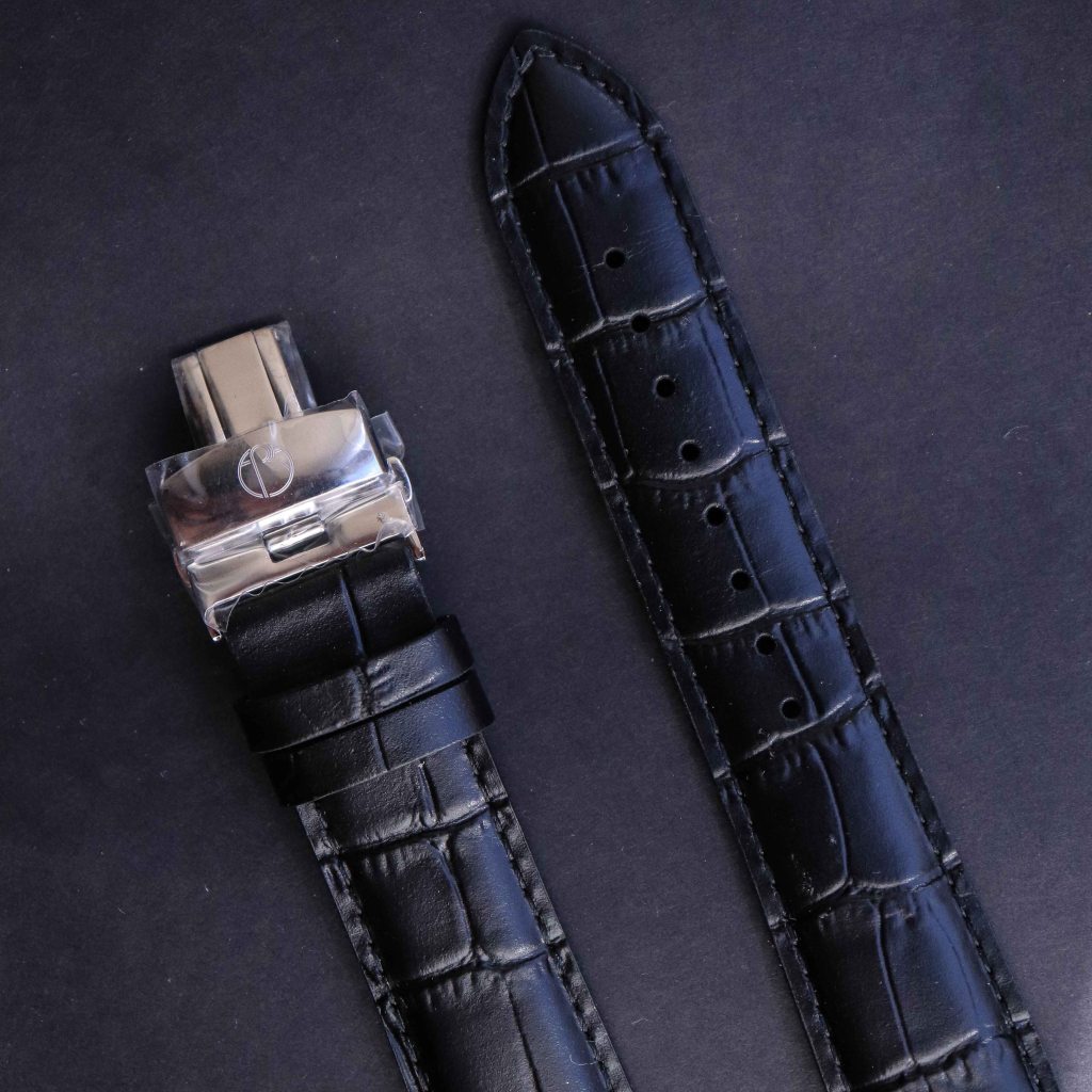 The bracelet on the watch is pretty good looking, but the quality is a bit questionable. As we know this watch had many delay problems as it needed to be shipped I think in March or even in January of 2020, but due to Covid 19 it got delayed and ERA changed the factory for certain parts so I guess this heavily reflected on the QC. And It looks like one of these things was the bracelet and case. The bracelet has solid end-links and links, the links are held on together with push pins. The finishing is satin brushed with polished links. It has a butterfly folding clasp that is hidden under the bracelet by the wrist. The problem is that some links aren’t wrapping the wrist properly and are to tight, that means the machine work isn’t very well done. But on the wrist it wears quite comfortable due to how the lugs slope down. It also doesn’t pull hairs like some other bracelets do sometimes. The clasp is pretty well made actually as it feels safe and looks like won’t open on it’s own like some Chinese ones do. ERA also included a crocodile print black leather strap with cutout for the crown at 12 o’clock. The strap comes with butterfly double fold clasp which is signed with ERA logo. While the strap is decent I wish they made a real alligator or crocodile strap as there are watches that cost two times less and have a real alligator leather strap.