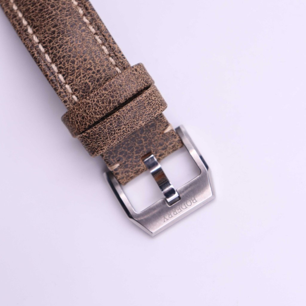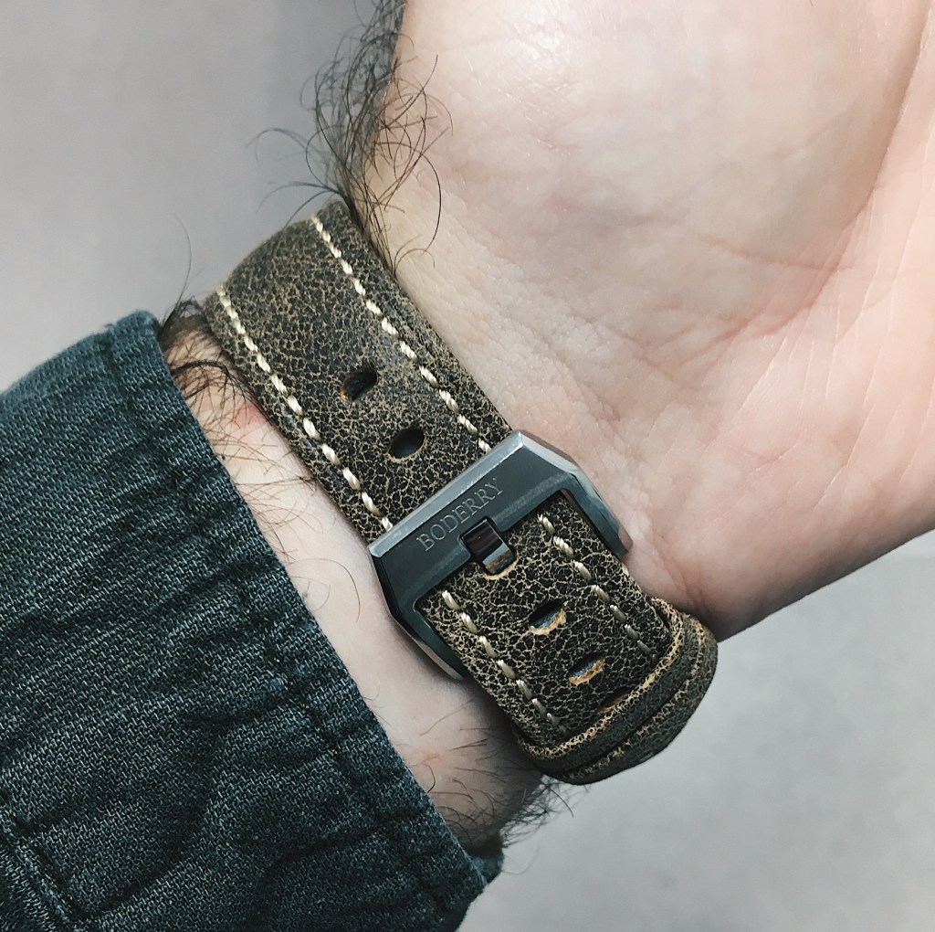 The strap that comes on the watch is kind of a let down, but it was expected at this price range, I guess all things can’t be good right? The strap is genuine leather from what it seems and the top seems to be aged a bit to look older. It also has contrasting white stitching. The tang style buckle from what it seems is made of stainless steel, but I may be wrong and it could actually be titanium. But it is well and and signed with Boddery logo.