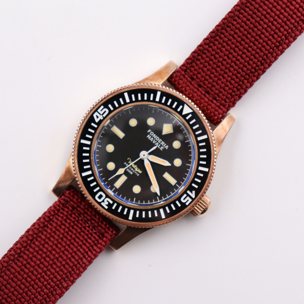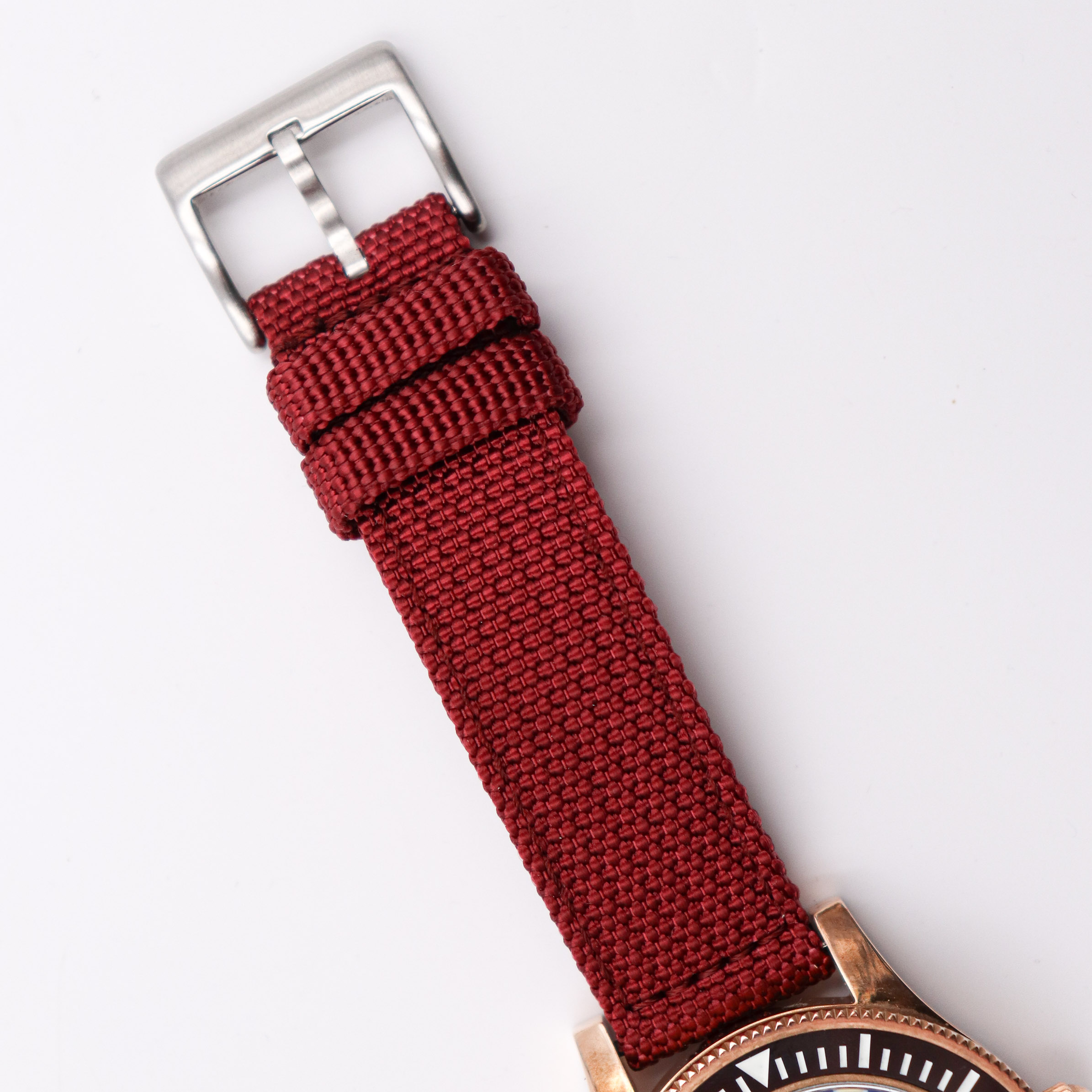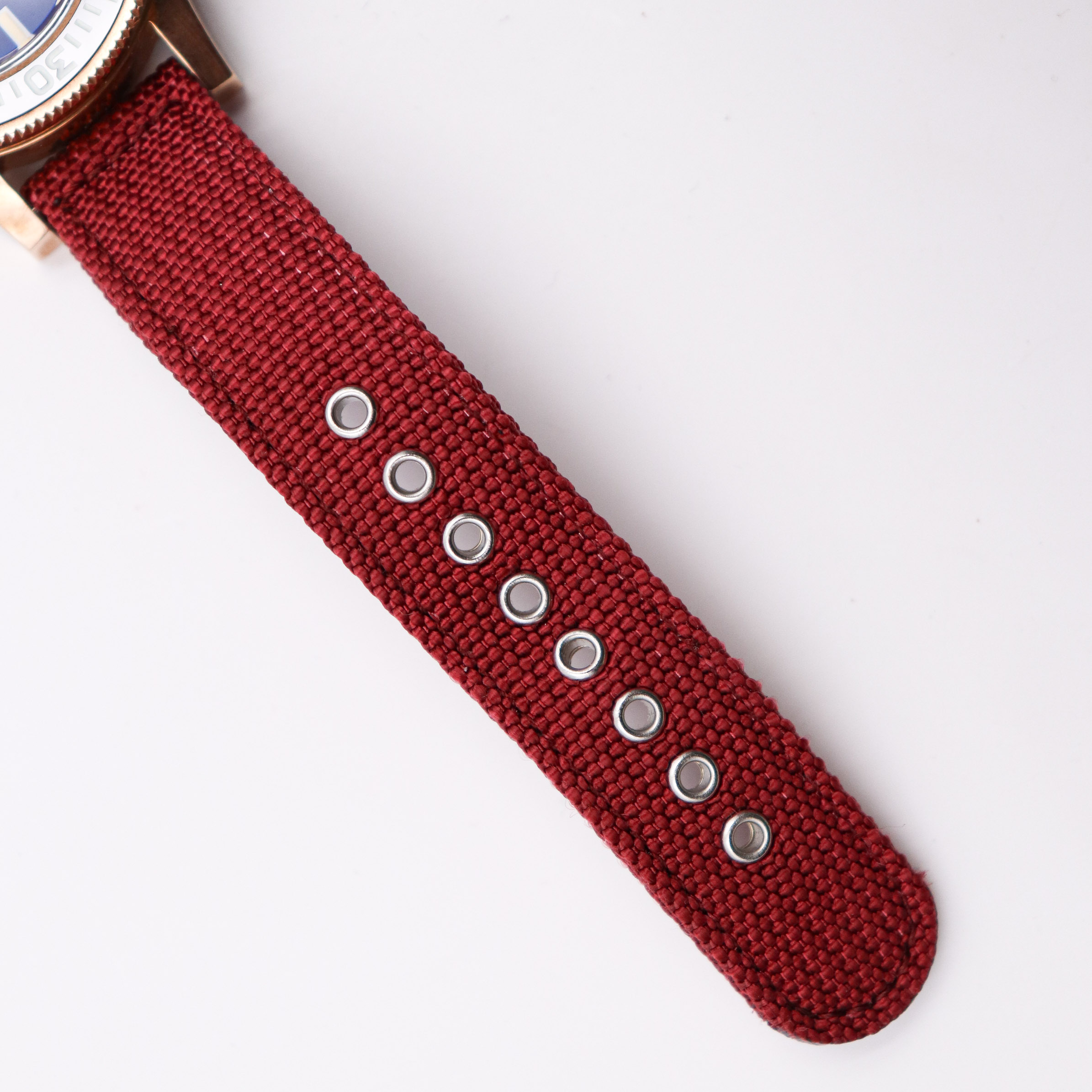 The military style canvas strap is really good on my opinion and it is one of my favourite of the bunch. It is in dark red colour and is actually very soft and comfortable on the wrist, which was a surprise at just 27$ as I have bought some other canvas straps and they weren’t that comfotable, they were usually very stiff! I also like that the holes have a steel rings around them so they don’t fray. The tang style buckle is quite good and thick. The strap also have built in quick release spring bars.