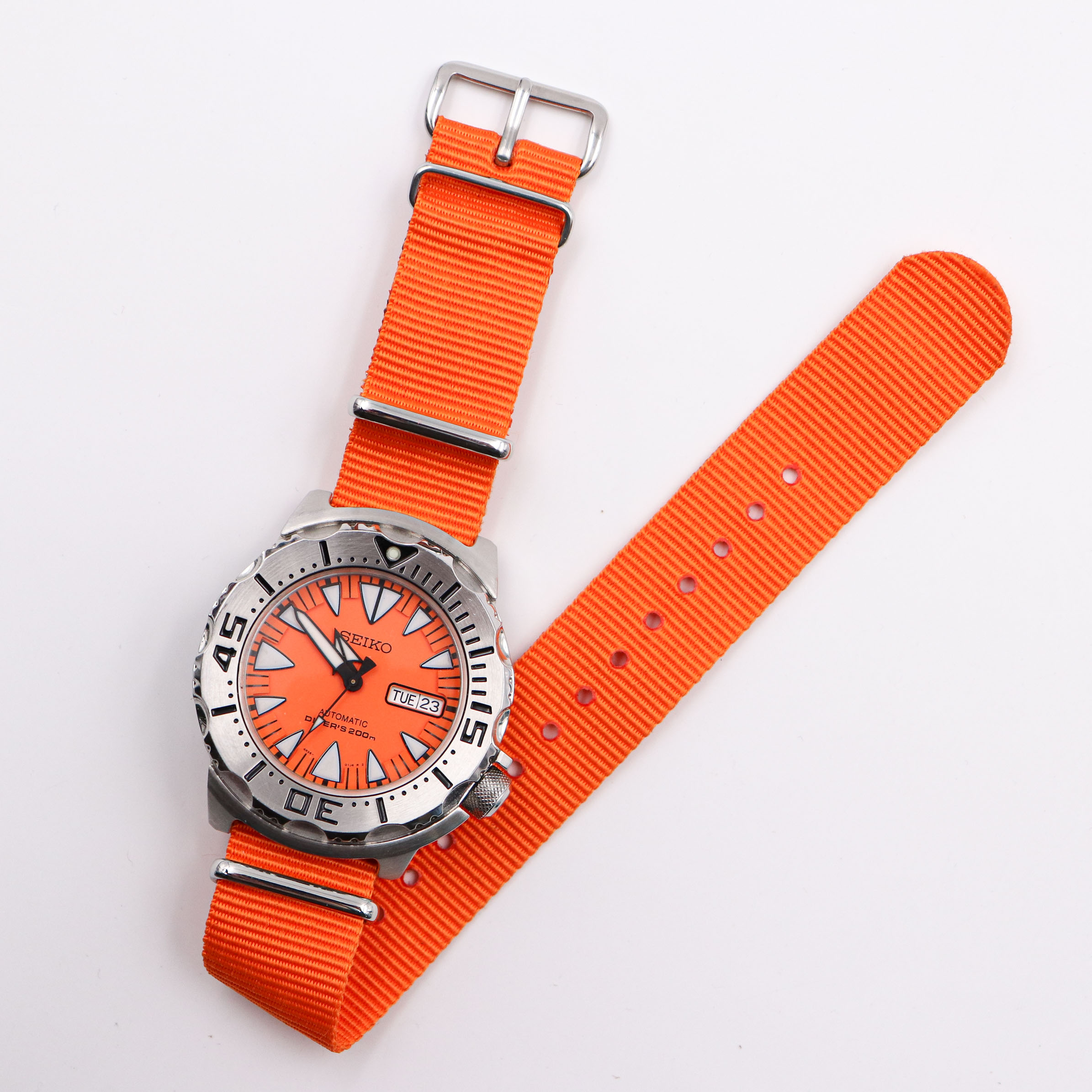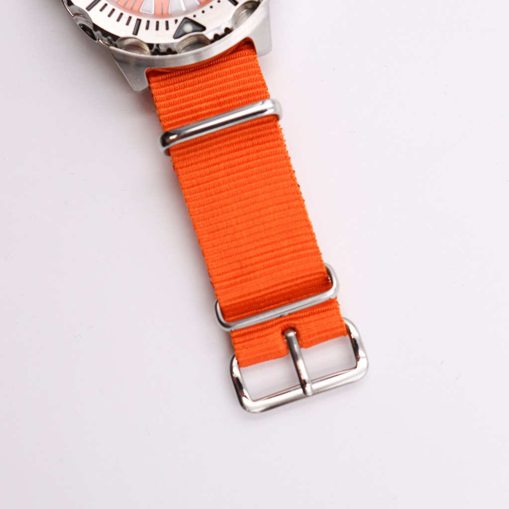 Let’s start with the nato strap. It is an orange nato strap, nothing serious. It has the regular hardware which is quite dissapointing. And also it was too short. I know that it costs only 12$ and that is cheap, but you can get a lot better nato straps for 15$ with premium hardware and seatbelt material. And it will be longer and fit more wrists. It should be atleast 4-5cm longer as I measured it with other of my nato straps from different brands and they all were longer.