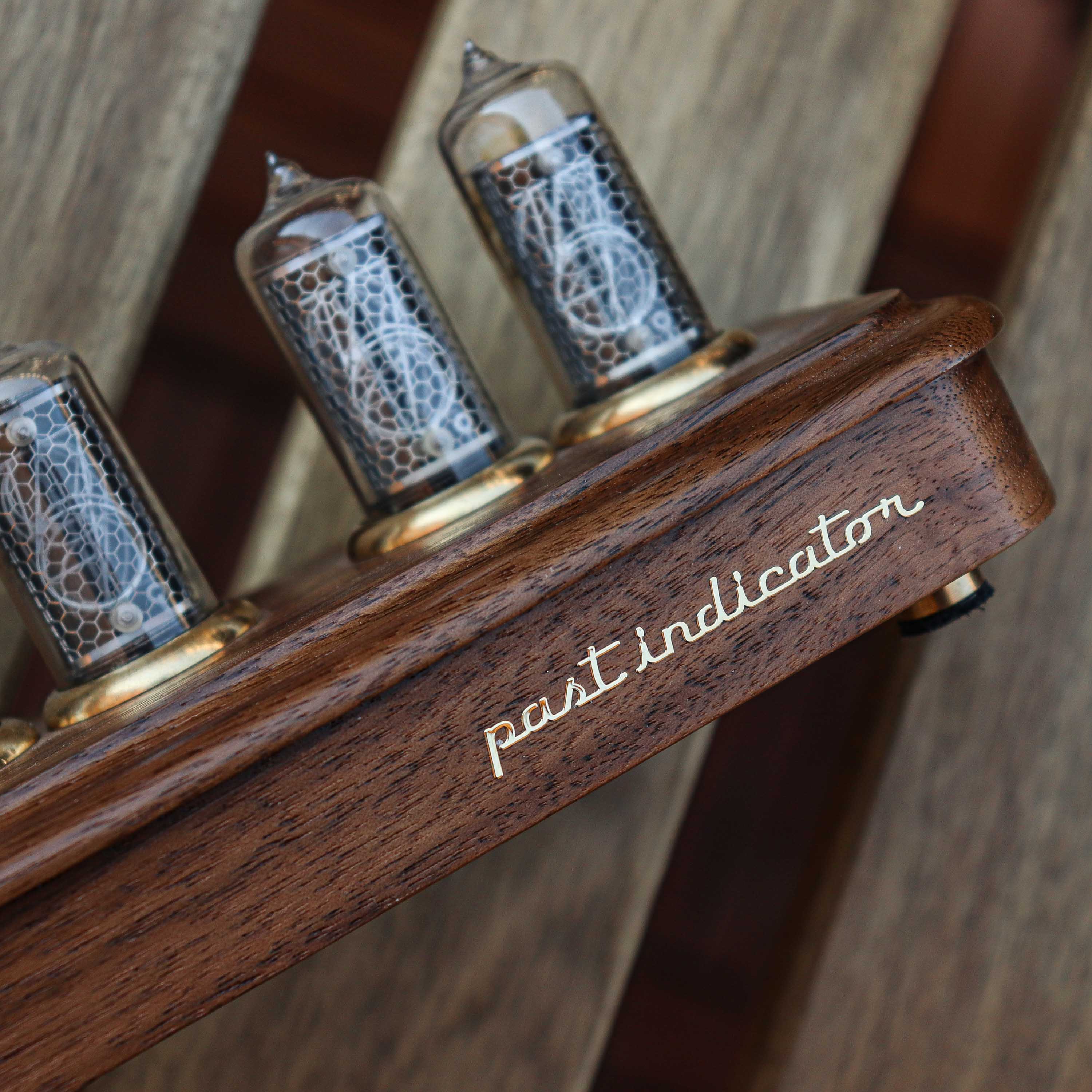 The main base is made of walnut wood which very nicely cnc’ed. Underside is mede from somekind of metal and it is held on with some screws. Also on the undersie we have brass legs with leather material on the underside of them so that it doesn’t slip on the table top. On the front of the clock we have the Past Indicator logo made of brass that is made in flush with the wood. On the back we have the power input for the wall plug, two buttons made of brass to set up the clock and a brass plate with two screws on which you will find the number of the clock and by who it was designed! On top we have six IN14 Nixie Tubes with brass frames. The clock is 200mm in lenght, 70 mm wide and 80 mm high.