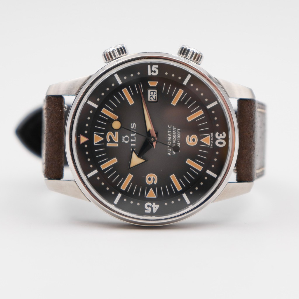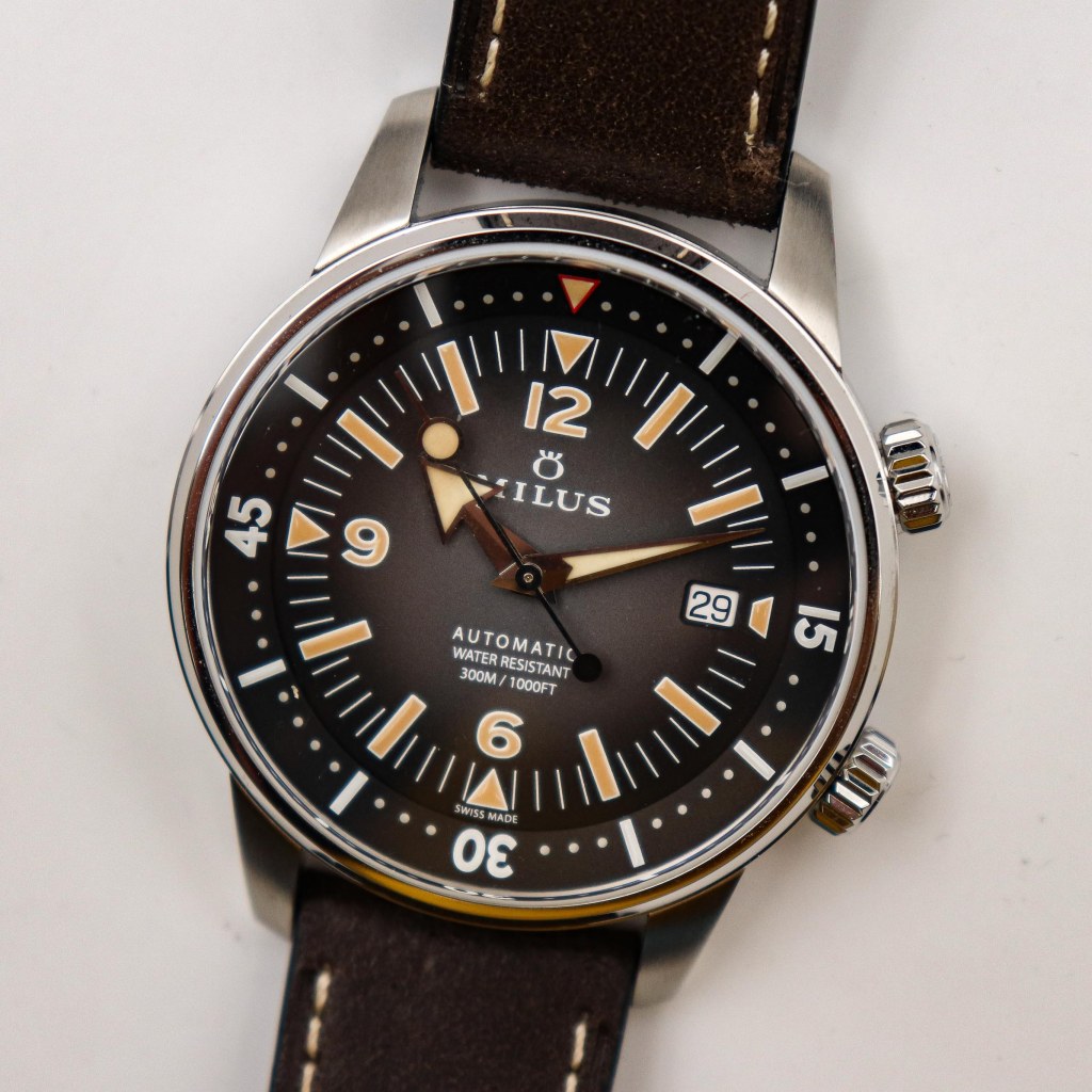 The dial is mostly similar to all inner rotating bezel watches. Around the dial we have a concaved inner rotating bezel with lumed triangle at 12 o’clock that has a red outline. There is also a minute track printed on it. The middle dial is kind of a fume dial with middle part beeing in this sand colour and the uoter colour is dark grey/black. The hour markers are printed with white outline and faux vintage lume. Around the dial we also have a minute/second’s track in white. At 3 o’clock we have a rectangular date window with white date wheel, I just wish they matched the colour of the date wheel with the dial as it would look much better. The Longines Legend Diver for example has a colour matched date wheel and it looks stunning that way. At 12 o’clock we have a Milus logo at 6 o’clock we have a writings “Automatic, Water resistant and 300m/1000ft” and under that we have a “Swiss Made” right on the edge of the dial. The “Broad Arrow” hands are diamond cut & rhodium-plated with applied faux vintage SuperLuminova. The lume is really good, it lasts about 2-3 hours which is more than enough for a diver. The finishing on the dial is really good compared to Longines and even higher end watches like Omega or Breitling. The finishing on the hands, the print crispness and everything is made just like it should for a watch at this price range or even higher.