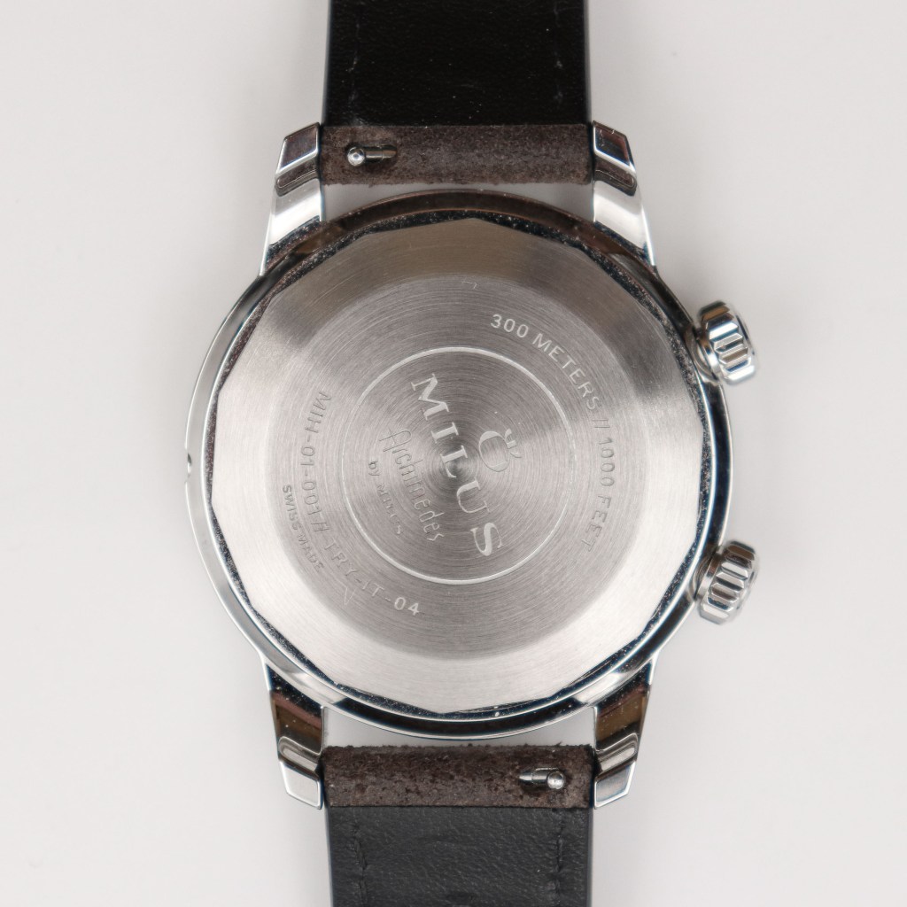 Inside the Archimedes is an automatic self-winding, ETA 2892-A2 (TOP) calibre, 21 jewels, 42-hours power reserve. It has a pearlised and snailed bridges, blue screws, and rotor with Milus logo open-worked. As this is a loaner watch I can’t tell my watchmaker to open it for photography, but Milus was kind to send me a photo of the movement and I must say, it is really well decorated, it looks really nice! The ETA 2892 is kind of a gold standart for movements and that’s no wonder cause it is kind of based on the 2824 and is it’s higher end movement. I tested my watch with the Lepsi watch scope for 10 days straight and it runs at around +1 to +2 second’s a day which is really good! I actually haven’t got more to say about this movement, cause it is really good!