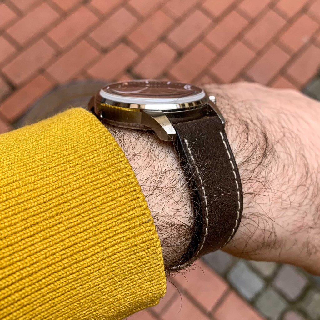 The strap is a dark brown leather strap which has a contrasting stitching in white. The strap is really good, supple right out of the box and feels very expensive. It is quite similar to the Tudor leather straps actually in leather and how they are finished. The buckle is a veru nice stainless steel tang style buckle with satin brushed top and polished sides. and signed on top with Milus logo. The strap is 20mm wide at the lugs and 18mm wide at the buckle. The strap is fitted with a quick release spring bars which is really nice to see in a bit higher end brands too. While the strap is really good, I actually think that it needs to be on a rubber strap and especially super compressors, I think fit really good on a tropic rubber strap or something, it would be nice if they could atleast include it as a second strap. But anycase the strap is really nice!
