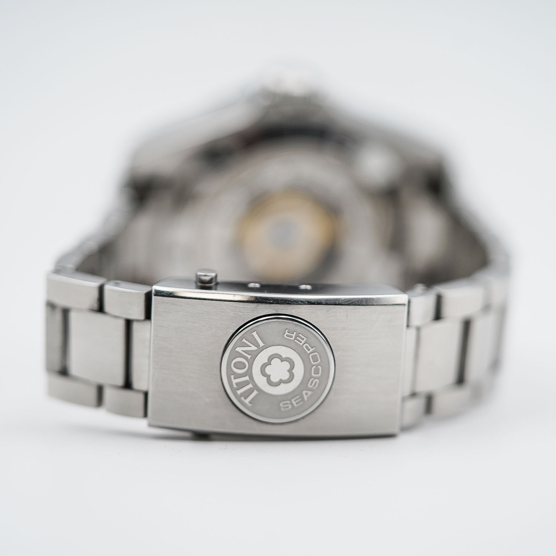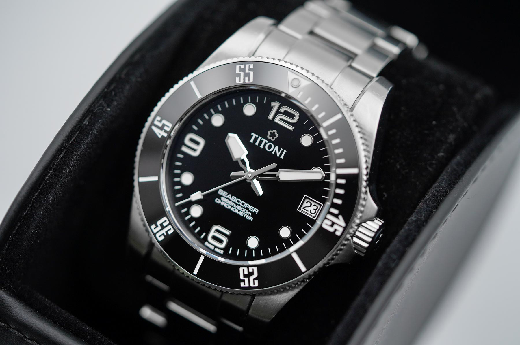 The Titoni Seascoper is an exceptional Swiss-made dive watch that combines high-end finishing, technical innovation, and practical design. It offers features rarely seen at this price point, including an in-house COSC-certified movement, a 600-meter water resistance rating, and a high-quality bracelet with a micro-adjustable clasp.