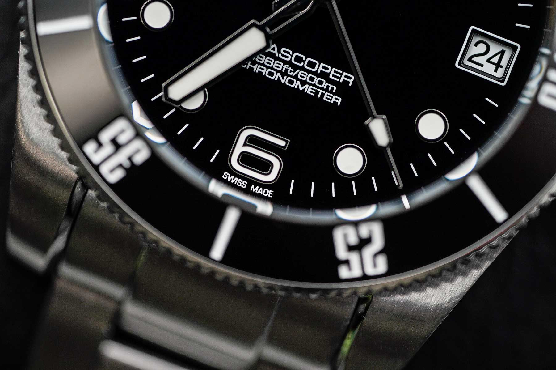 A standout feature of the Seascoper is its unidirectional ceramic bezel, specifically designed for professional diving use. The ceramic insert is highly scratch-resistant and offers a smooth, precise rotation with 120 clicks, ensuring accurate time tracking during dives. The engraved numerals and markers on the bezel contrast sharply against the ceramic, making them extremely legible, even in low-light conditions, which is a crucial element for any serious diver.