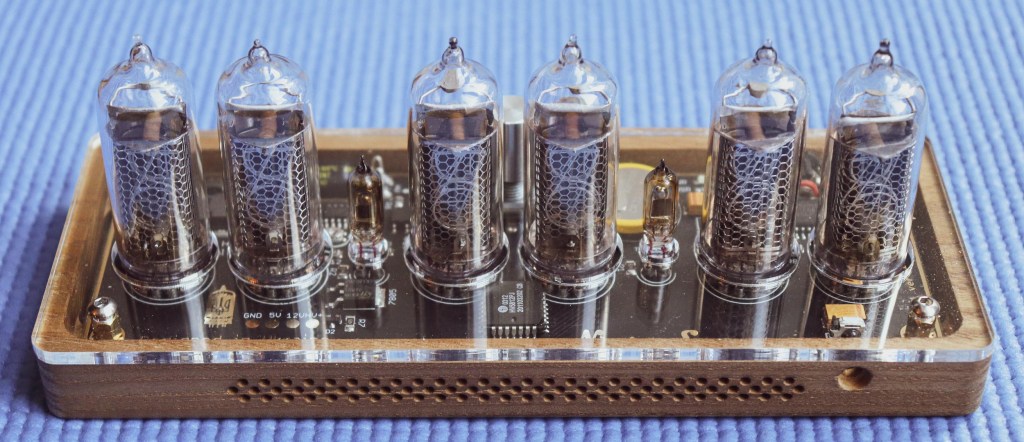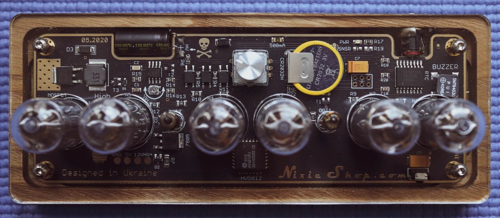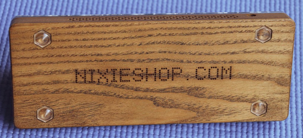 Set up process was pretty easy. Especially with the remote control and the instruction beeing very easy to understand. The clock itself is made of walnut wood with a plexiglass top cover, which actually I think is better replaced with a regular glass as with time it could get scratched and plexiglass also gets yellow tint to it after some years of heat and light. On the front portion we have some perforated holes design with one hole that has the motion sensor. Basically when you go past the watch it turns on and when you are not in the room moving it turns off. Actually a really nice feature that can prolong the life of the Nixie tubes because the lifespan on average is 5-30 years on each tube. On the back we have the hole for the power adapter and on top we have six IN14 Nixie Tubes which are actually free moving which I guess is to change them more easily. Also behind the tubes on top we have a knob that allows you to manage all the settings. Knob click changes menu position and rotations adjusts the value. Under the plexiglass cover we can see the custom NixieShop.com circuit board with very interesting details, my watchmaker actually makes these Nixie clocks too and has a lot of knowledge in repairing circuit boards and all kind of electronics and he said that it is very well made! On the underside we have a Nixieshop.com laser etched writing and rubber feet so that the clock sits stable and don’t slide all over the table.