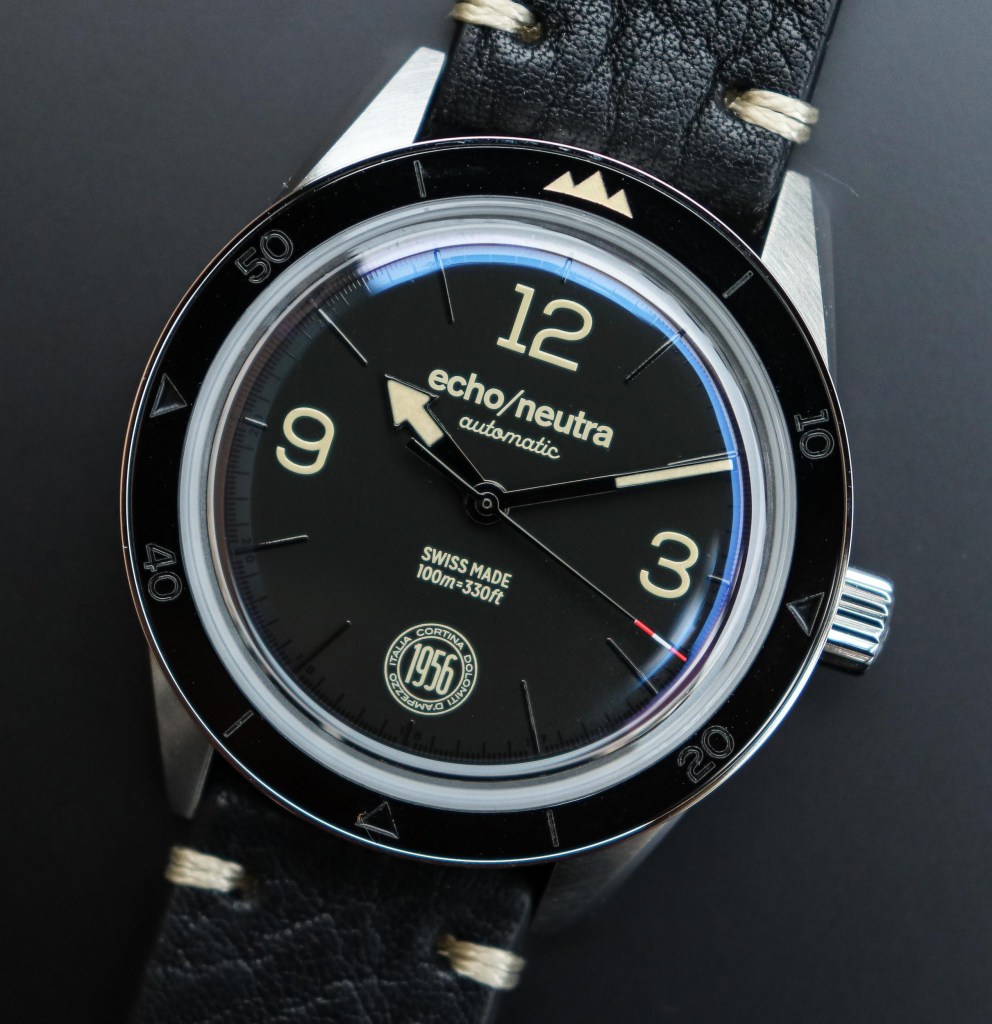 The brand is called Echo/Neutra. The brand is based in Italy. Founded by Nicola Callegaro, Designer and Communication Consultant, and Cristiano Quaglia, Aerospace Engineer with a specialization in Propulsion Systems. Following the Averau Collection that Echo/Neutra released on Kickstarter 2 years ago, the Italian microbrand Echo/Neutra launched a second series to honour the 1956 Winter Olympics VII, held in Cortina d’Ampezzo, Italy in 2020. These games had the largest number of participating countries at the time, 32 nations, and were the first Winter Olympics televised to a multi-national audience. The new vintage-styled collection draws inspiration from 1950s sports watches with Italian design and Swiss hearts. A three-hander and limited edition chronograph bring refinement and maturity that belie their accessible prices and show that this relatively new brand is here to stay and can bring something original to microbrand world! But recently Echo/Neutra updated their Cortina 1956 3H line with a new model called “Deep Black” which is basically a blacked out version of the Cortina and I think it looks amazing in the “new colours”!