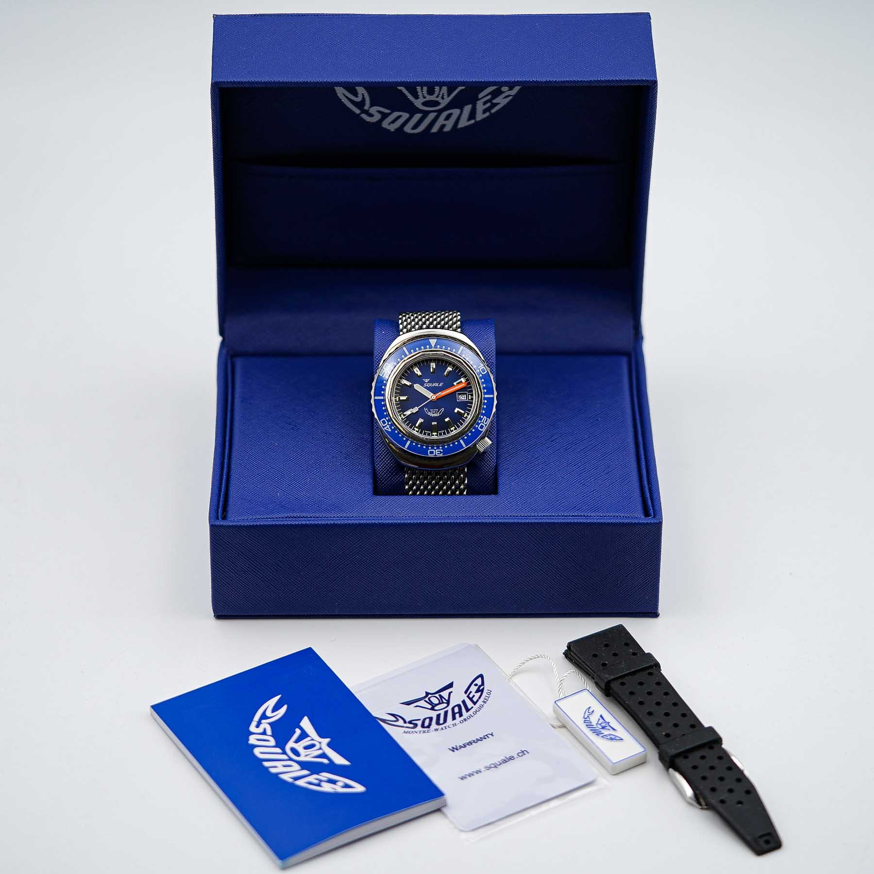 The watch arrived in a blue, vinyl-wrapped clamshell box. It came fitted on a tropic rubber strap, but Squale also included the shark mesh bracelet for testing. My initial impression of the packaging was underwhelming; it does not exude the premium feel expected from a watch priced above €1,000. It is reminiscent of packaging from more affordable watches found on AliExpress. I personally preferred Squale’s previous packaging, which included a watch roll. Not only was this a more sustainable option, reducing excess cardboard waste, but it was also practical for travel.