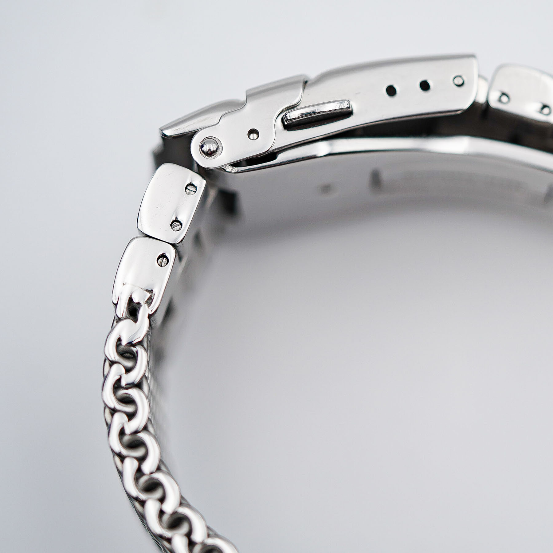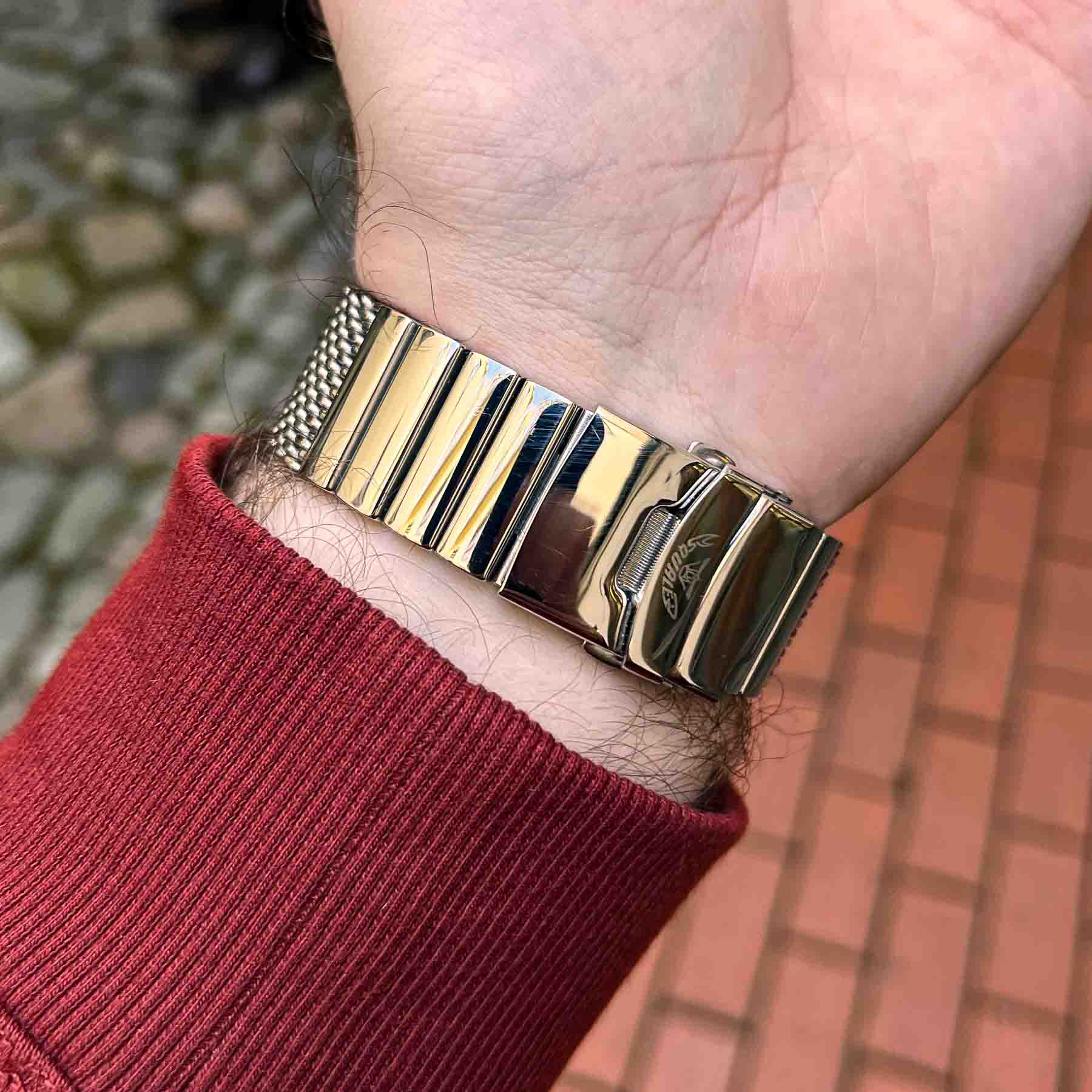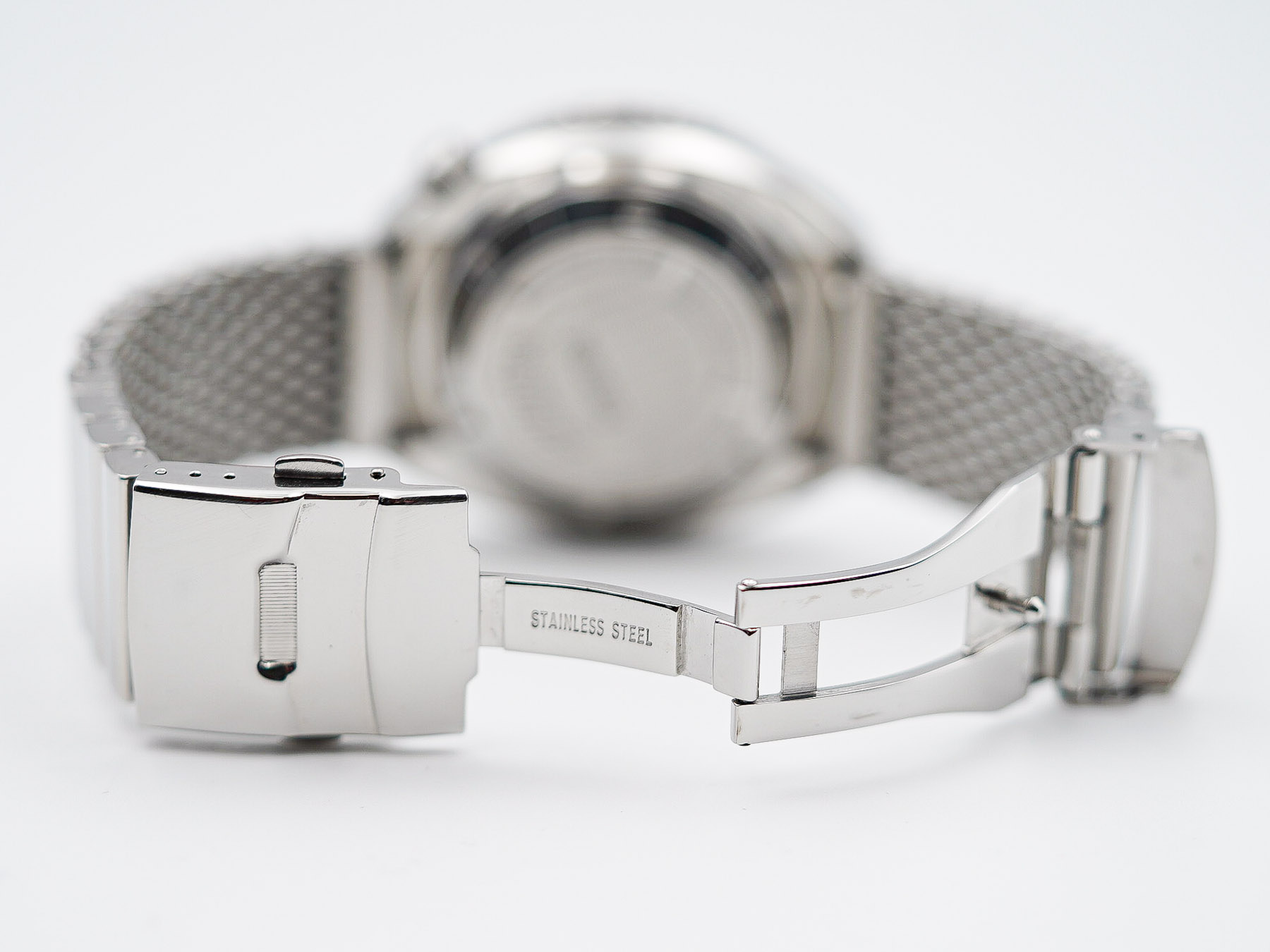 The shark mesh bracelet is robust and features removable links for size adjustment. While the edges of the links could be better finished, the overall quality is acceptable. However, the bracelet lacks a diver’s extension, which is surprising for a professional dive watch. The milled clasp has a polished finish, which, while visually appealing, is highly prone to scratches. Given its €211 price tag (including VAT), I would recommend exploring alternative mesh bracelets from Germany or Switzerland, or even more affordable options from AliExpress.