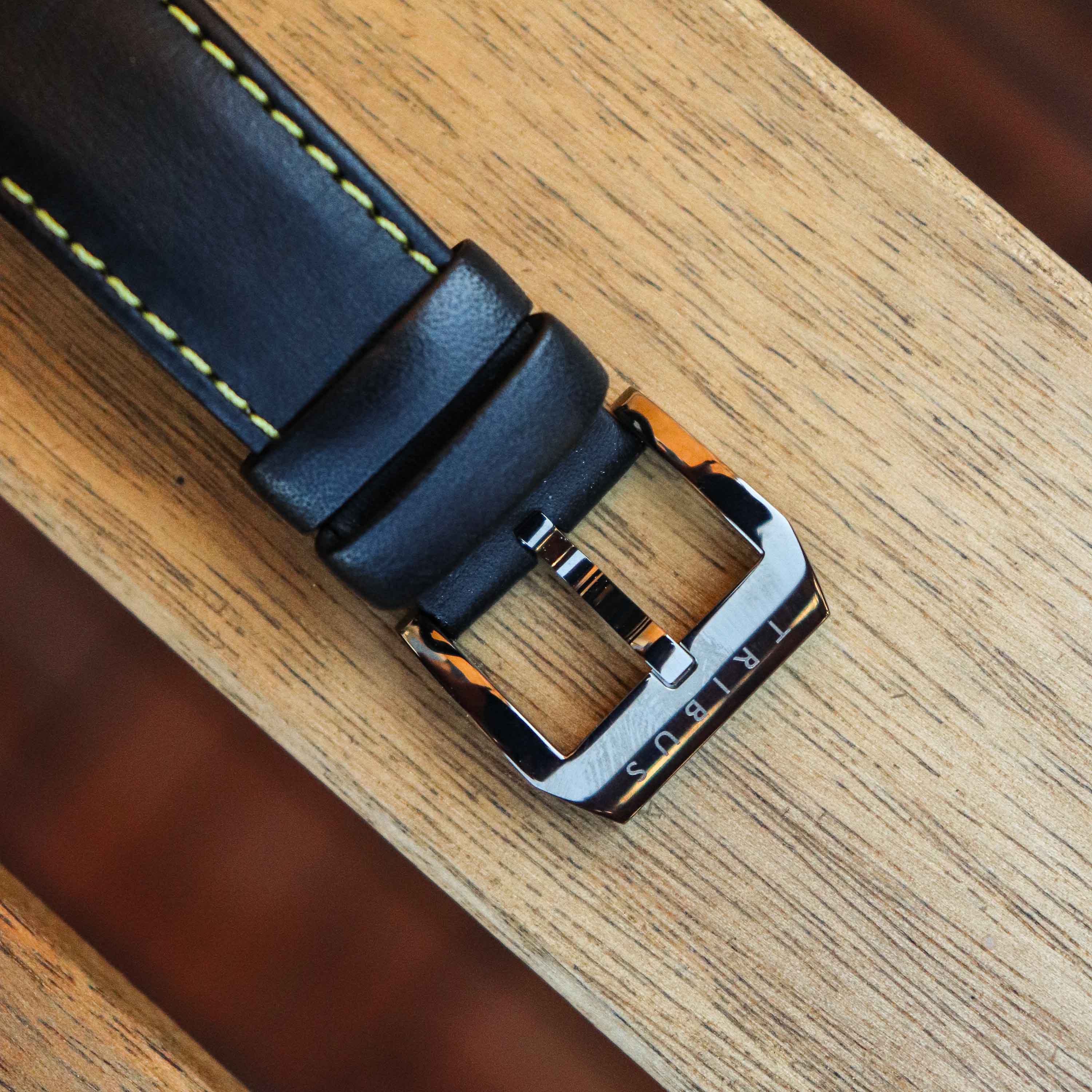 The strap on my particular watch is the black leather strap with contrasting yellow stitching. The strap is made from Italian leather. The strap is super supple and very comfortable on wrist right out of the box. The strap also features the quick release spring bars which I just love and think that they need to be in every strap! It just makes changing straps super easy and fast process. The tang style buckle that came on this watch was a bit plain in my opinion, I was thinking that the watch will come with a clasp atleast. The tang style buckle is made of 316L stainless steel and also is coated in the same gunmetal colour PVD coating as the case. The buckle is signed with Tribus logo and is finished in polished mirro like finishing.