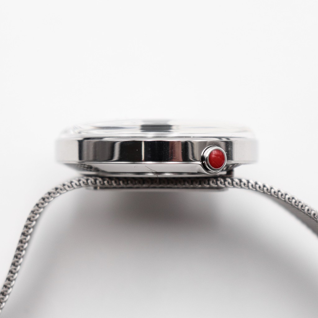 So the case of the KLOK-01 is made of 316L stainless steel. The case is very well manufactured, it is basically the same case, but with minor changes to the strap securing mechanism and how the water resistance is achieved. The case I would say is made better than the first Klokers watches had on them, but that is understandable. The case is mainly polsihed and only on the caseback we have a satin brushed finishing. The finishing is done pretty good. At 3 o’clock we have the same push-pull crown which is pretty big and slim, but yet very easy to grap and change time. The crown is signed with “K” and it is pretty deeply engraved in the crown, much better than on the first one. On the left side at 8 is a pusher/button with a red inlay that detaches the watch from the strap. No spring bars or screws, rather a simple to use, but likely complex to make mechanism for swapping straps. When you flip the watch over, you see the case back. It features a milled out slot, in which you have a flange where you slide in the straps and other accessories. The case is basically the same size only difference is the thickness. The case of the KLOK-01 is 44mm in diameter and the thickness is 12,5mm (11,5mm on the original one). The watch may seem big on paper, but due to lack of the lugs, it wears much smaller than it is. For me it feels like a 40mm watch easily. On top of the watch we have a transparent polymer with built-in magnifying lens(x1,4). I would love to see a sapphire crystal one day on these as the polymer one scratches super easily. The watch on the back says it is water resistant, but by no means it is a watch to go swimming with it, it can resist some light hand wash or rain, but nothing more.
