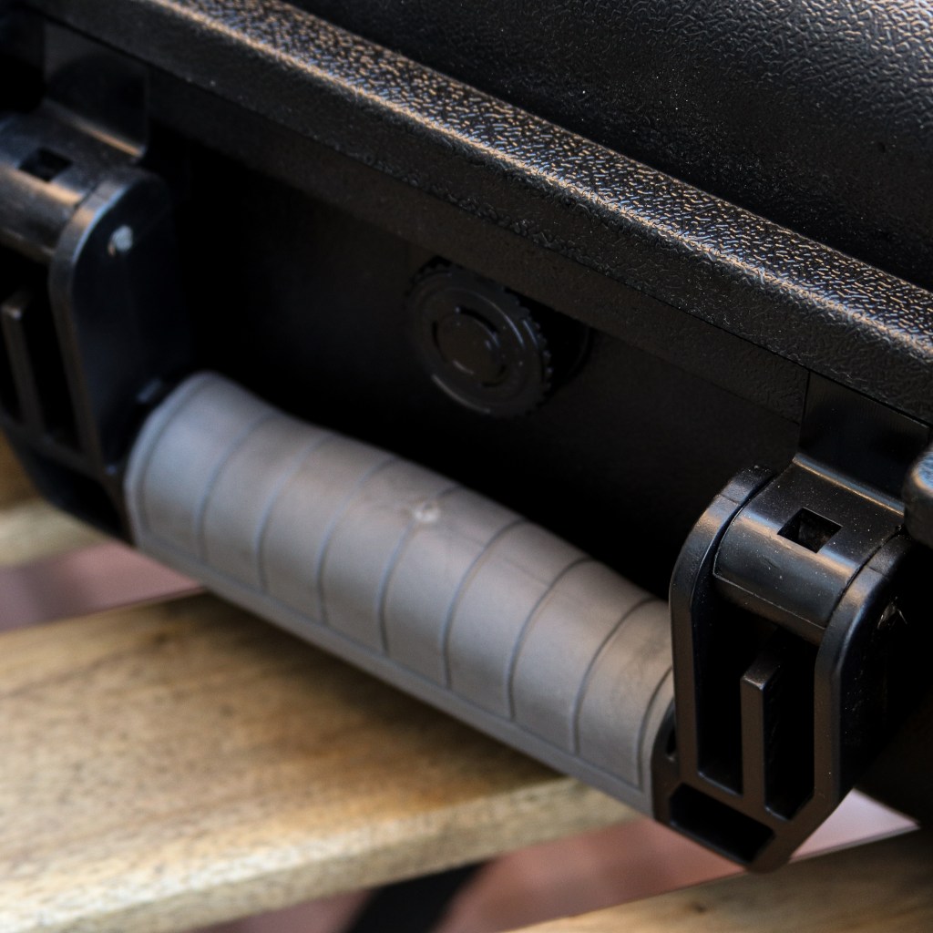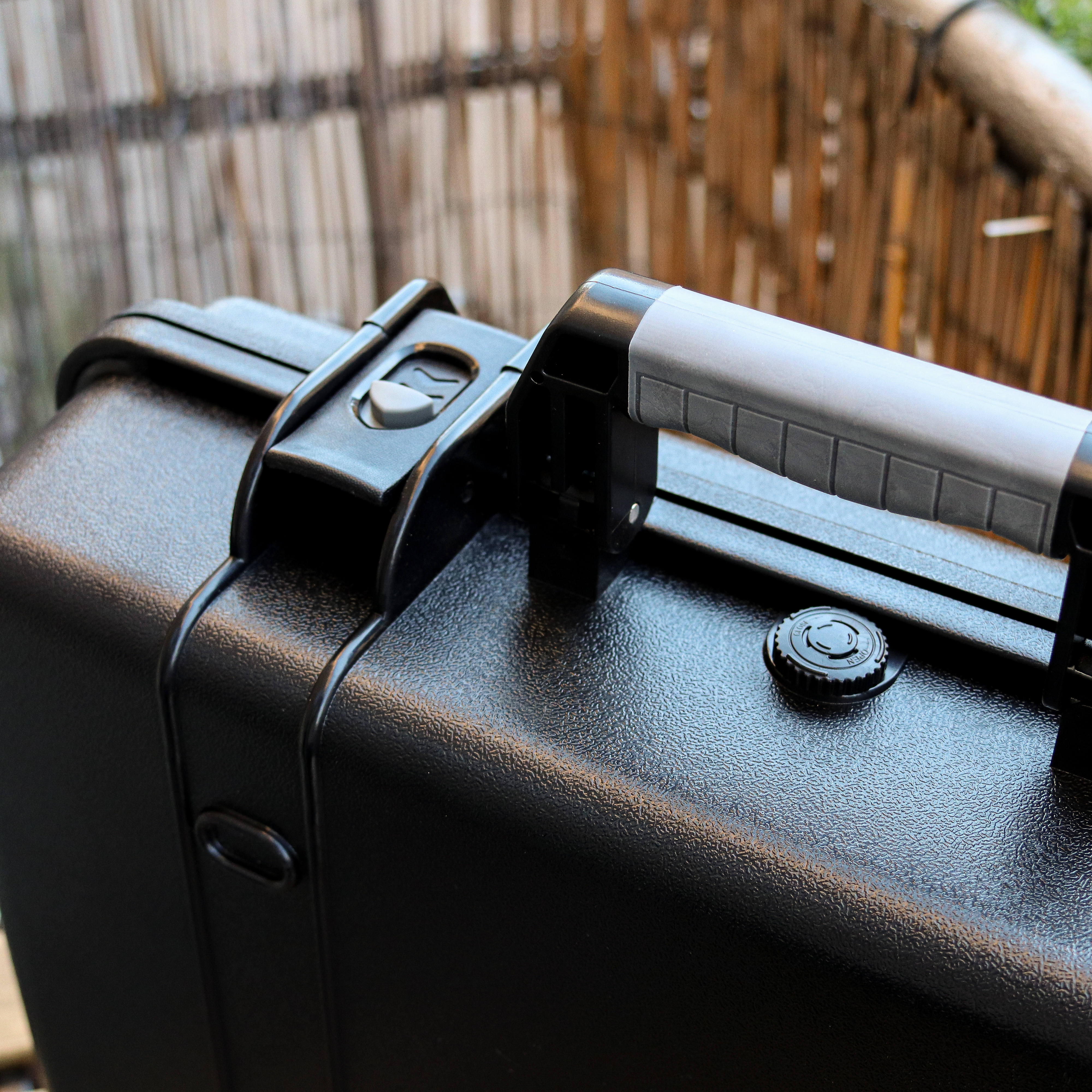 When you buy the case you get the case, shoulder strap and some papers. The case looks like any regular pelican case would looks like in black plastic. The plastic feels pretty rigid and it feels like it wouldn’t break even if you drop it from 2 meters. On top of the case we have a metal plate with “Kronokeeper” logo which is a nice addition. On the front part we have a handle with rubber grip, two flip locks that also can be closed more securely with small locks. Also under the handle we have air valve for water tightness. On the both sides we have slots for the shoulder strap. You open the box and you immedeately see how tough and well made it is as it has full rubber gaskets around the top lid sides. And also the top lid has a stopper that stops the top lid from opening all the way and it stays in place.