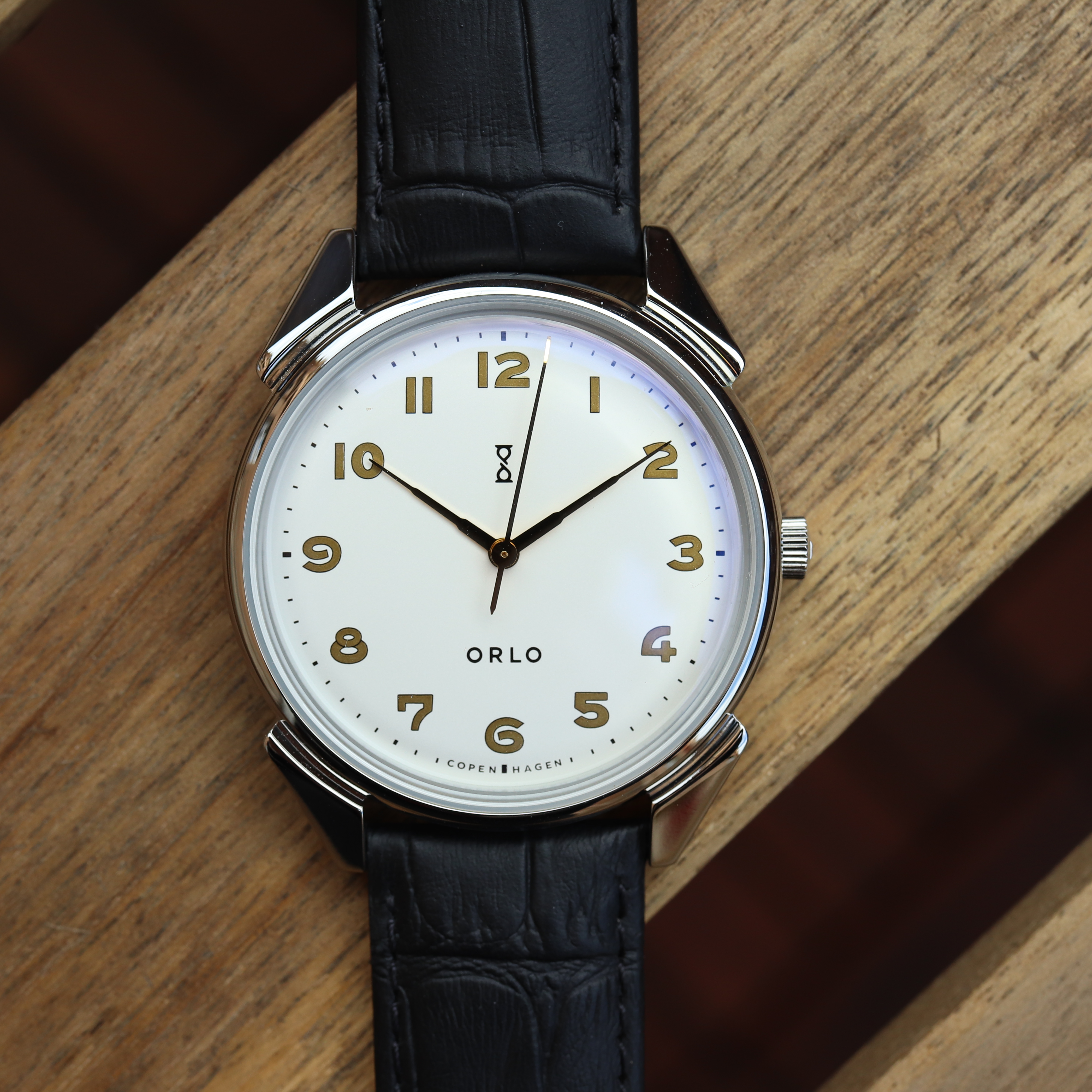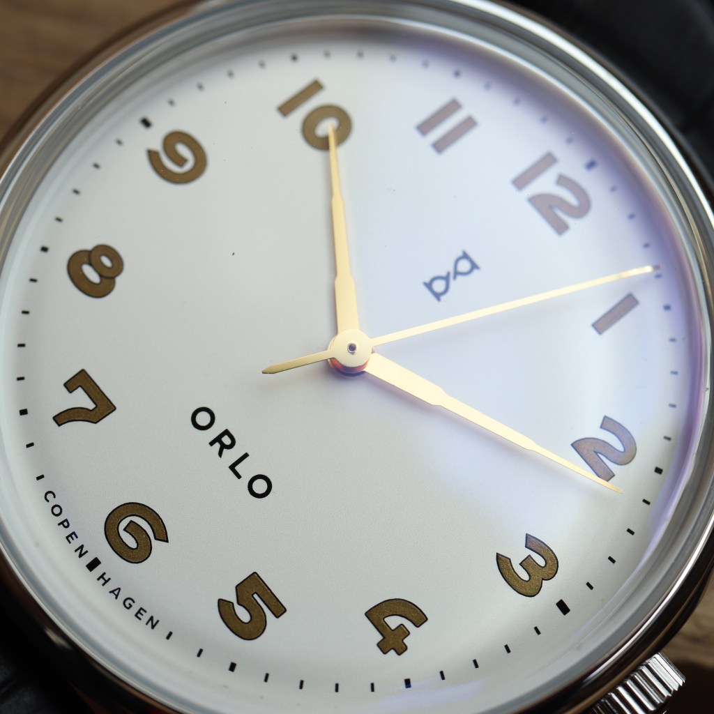 The dial has a curved edges of the dial and it is in matte white colour. The dial marking are printed on the dial in black colour. The arabic hour numerals have Art Deco styling and I really like the gold colouring and the thin black line it has. The whole watch actually looks very vintage inspired and I quite like that as there aren’t many microbrands mimicking 1920-1940s watches. The hour and minute hands are also Art Deco inspired and look like skyscraper by the way. The seconds hand is just a regular stick shaped and the edge is bent so that it kind of wraps the domed dial. All the hands are in yellow gold colour. At 12 o’clock we the Orlo logo that looks like a sand clock. At 6 o’clock we have the Orlo name and under that just at the edge of the dial “Copenhagen”. The dial is really well made in my opinion and pretty legitimate too. These are my main two things I think every watch dial needs to follow “looks” and “legitimatimacy” and this watch definitely fits the bill!