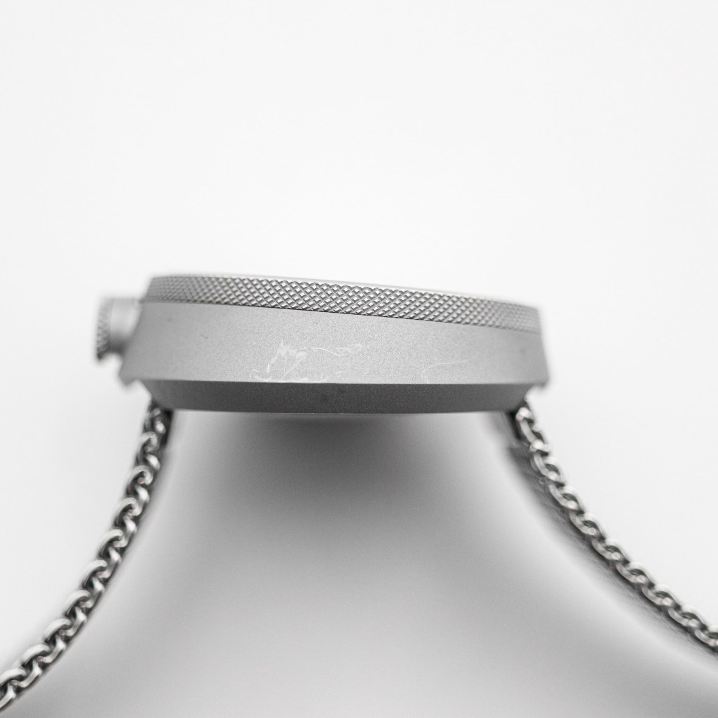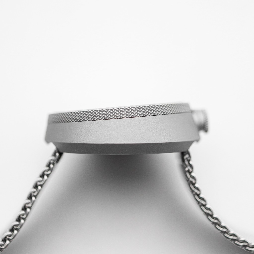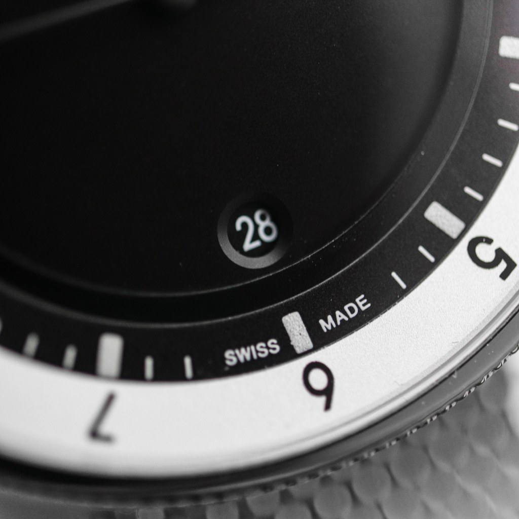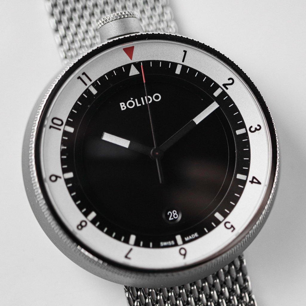 Pierre Nobs, the designer and co-founder of Bolido, didn’t want to create a boring dial either, which many minimalist watches can tend to have with sometimes taking minimal too far. All the Bolido X dials have a slight touch of red or yellow on the dial and hands. My version sports a red second hand tip that matches the red triangle on the slide bezel for GMT function. The slide bezel has a silver look to it, thanks to the galvanized metal, which matches the finely beat blasted case perfectly. The black inner dial and and hands have a very subtle texture to them, but it can only be seen in very bright light looking close. I actually like these small details and that just shows why this watch is worth 1024€. The thing that I like the most are the hour and minute hands, as only the tips are white, sometimes in darker or very bright sun conditions it looks like the hands are floating in the air. The minute track is layered above the base dial, which helps give the watch a little depth, and the final touch of depth is definitely the date window at 6 o’clock right in the center, just how I like it. And I like that the date wheel is black colour matching the dial. The big beveled edge helps give some sense of depth, as opposed to just a simple cut-out hole. When it comes to text on the dial, it is kept simple with Bolido logo at 12 o’clock and “Swiss Made” at 6 o’clock. Bolido really made a very good dial that is just straight to the point. It is legible and functional, just like a watch dial should. You don’t need cluttered dial as the main thing of the watch is to tell time.