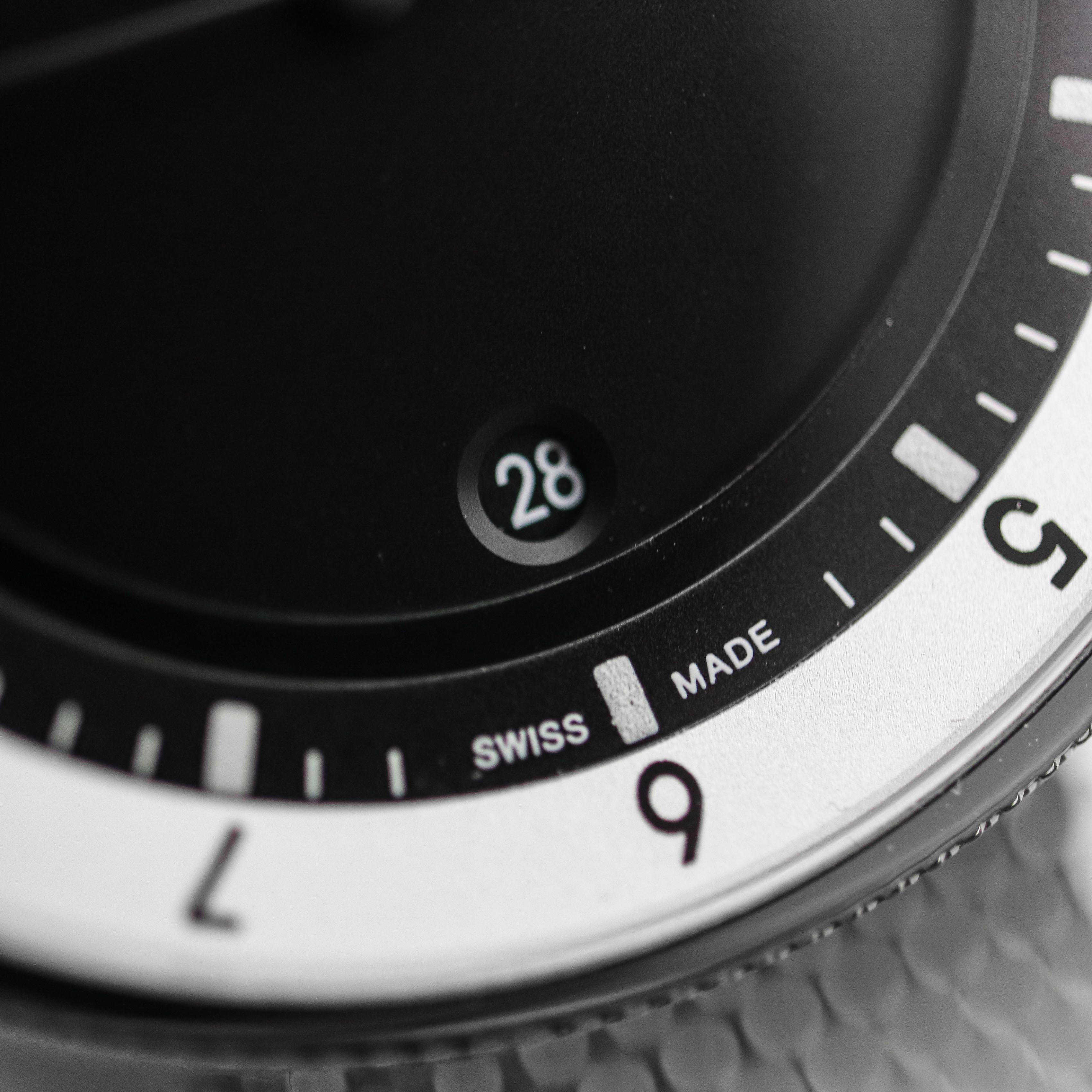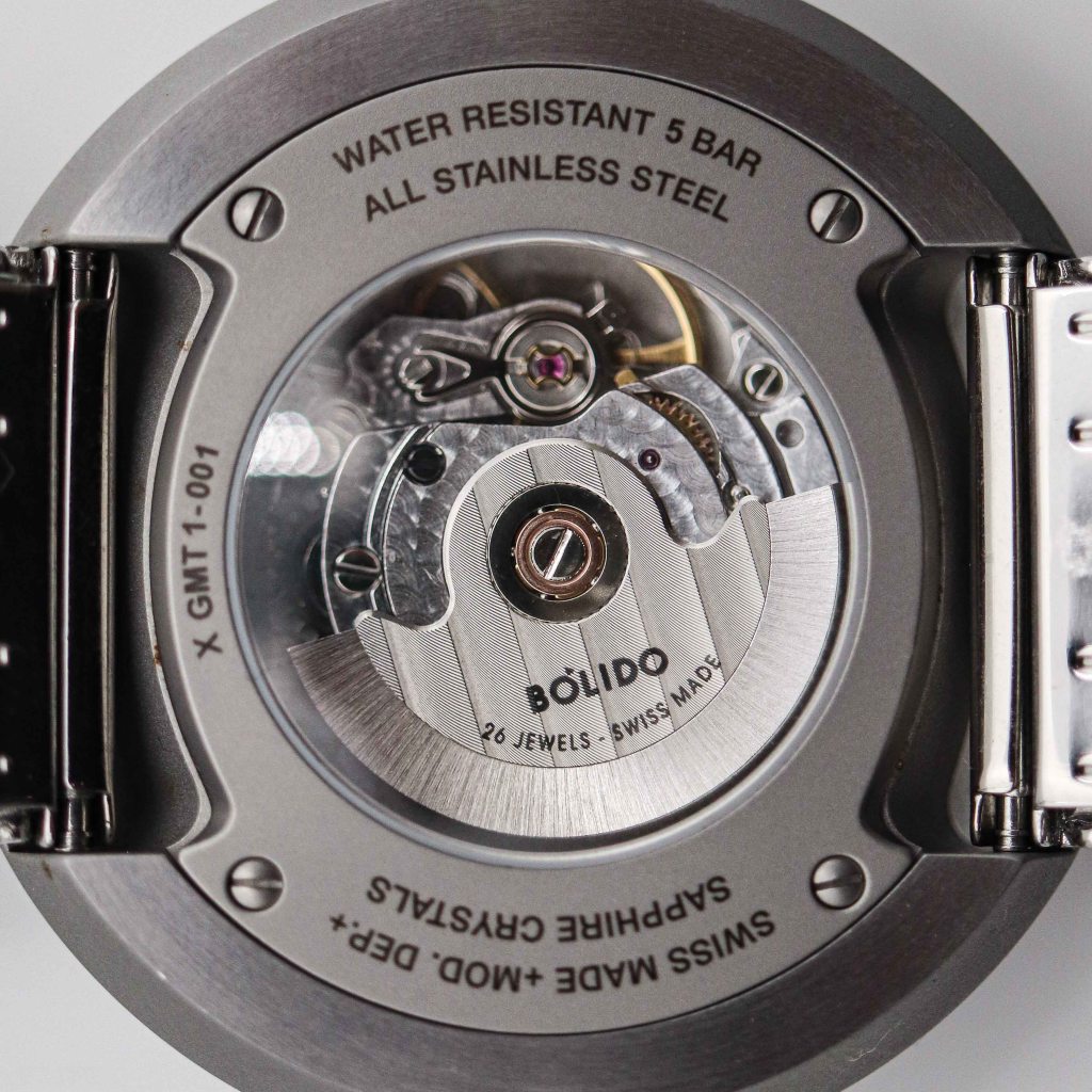 The case is made of 316L stainless steel. The machine work is really exceptional and super precise. The finishing on the case is sandblasted and the top of the bezel is polished. The finishing is also done really good although the sandblasted part scratches very easily as you can see I already have made some scratches. The case shape is designed by Pierre Nobs who when creating the design for the case remembered that the most cost-effective manufacturing method has always been automatic precision lathing – a very competitive industry in Switzerland – and began the search of using this advantage to comply with the new Federal law in 2016 stipulated that the minimum of 60% of Swiss content had to newly include the case to qualify for the designation «Swiss Made». Manufacturers in the middle and lower price segments got into serious difficulties, as the majority of the Swiss case production had migrated to Asia for cost reasons. The linear lathing produces very banal ring shapes; discussing this problem with designer Simon Husslein, the idea of adding to the lathing process a conical shape and second axis was born and thus Bolido went into production. With this model Bolido has kept their award winning case design, but sized it up a bit while keeping the same strap width. The case width (at its widest) and dial has gained 2.5mm, so they are now respectively 45.5 and 40.5 mm. It’s also slightly taller coming in at 11.6mm at the lowest and 14.1 and the highest. This makes the incremental height bigger, as it increases by 2.5 mm, while the previous model increases by 2mm. It’s barely noticeable as the width, in a side by side comparison, is what stands out. But as you already understand the non existing lugs is an advantage here as this watch is 45,5mm, but it wears more like a 42mm one. On top of the watch at 12 o’clock we have a push pull crown with knurled sides and polished top. Actually the crown itself is only the knurled part if you look from the side making it quite thin. but relatively large in diameter. The crown isn’t the easiest to grip and use, but it does it’s job well and it has a nice action to it. On top we have the sliding bi-directional bezel which is the best one I have seen of this kind. The action is super smooth and very precise. Most times these bezel are looser than they need to be and can turn on accident, but not this one, you need to give it some force to turn it. The exhibition caseback is held in with 4 small screws. The case back features a domed sapphire crystal which is an interesting detail. Around the case back you will find the Bolido logo, reference and some specifications laser etched on it. I also like that Bolido changed with the new, bigger case size the process how the movement goes in. Previously it wen’t through the front so it was pretty hard to take it apart to service, now you can easily open the case back and service the watch. On top of the watch sits a slightly domed sapphire crystal. Water resistance is 50m (5ATM) which is more than enough for splashes, rain, hand wash etc. just remember that you can’t swim with it.
