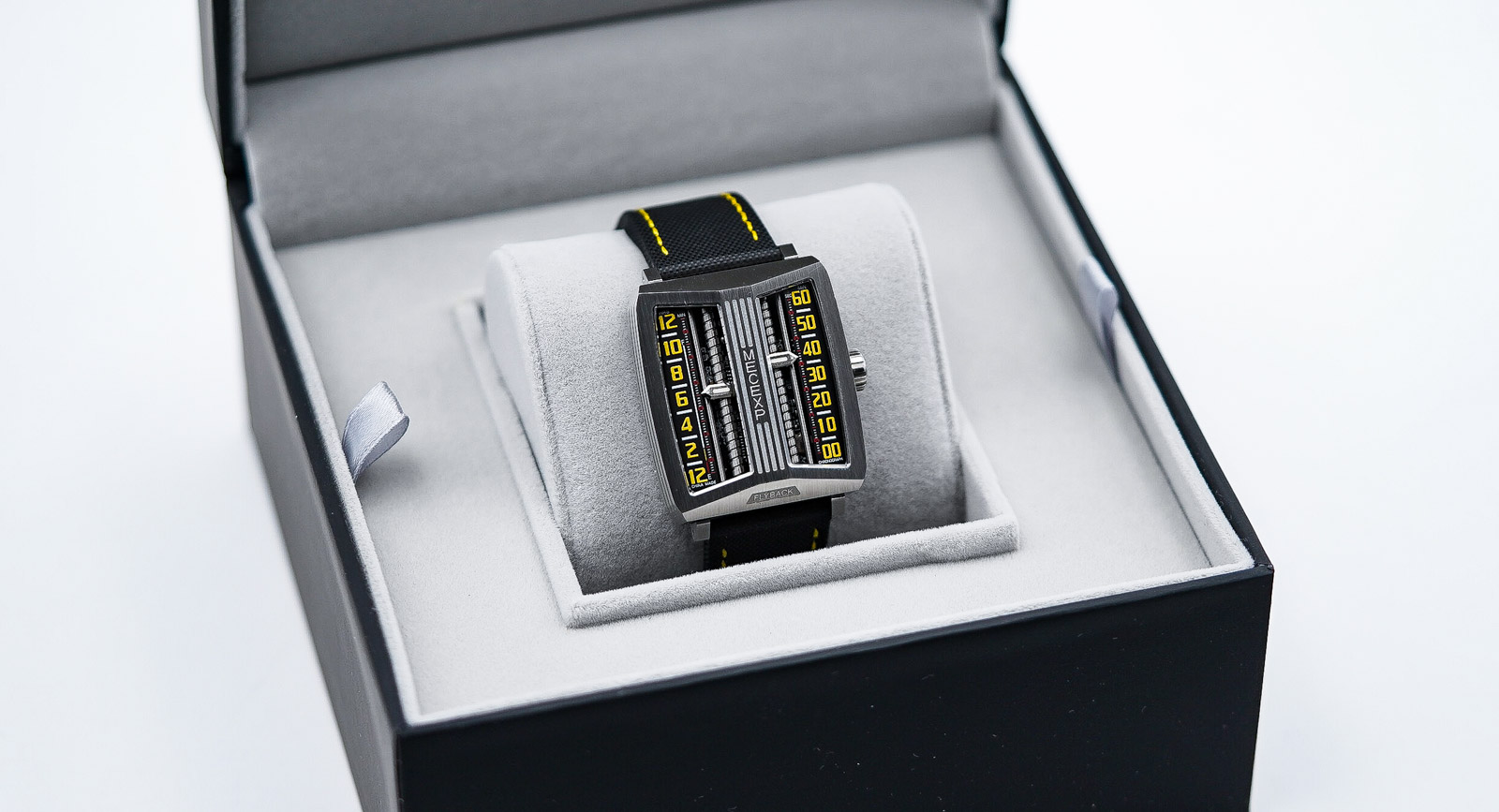 The “dial,” if we can call it that, consists of two rectangular sapphire-glass-covered windows. One displays the hour, the other the minutes. Inside, you’ll see the leadscrew and rail system that guides the indicators, which act as hands. The hour and minute indices are in yellow, matching the accents throughout the watch, and both the markers and indicators are lumed for nighttime legibility. A small OCD detail I noticed: the “hands” or as they are called by MECEXP: “Indicators” do wobble slightly when stationary—this is due to the design of the leadscrew rail system. While it doesn’t impact function, it’s worth noting for those who demand absolute precision in alignment.