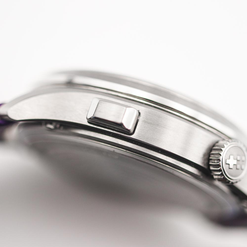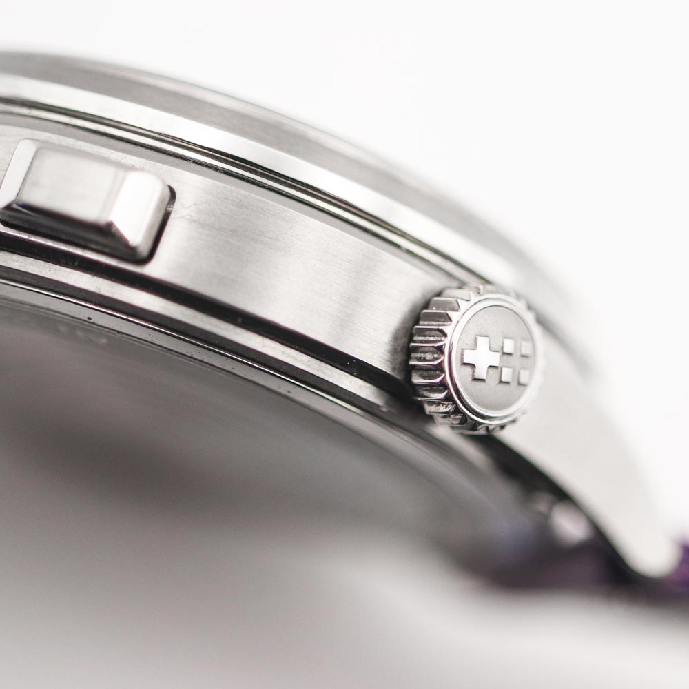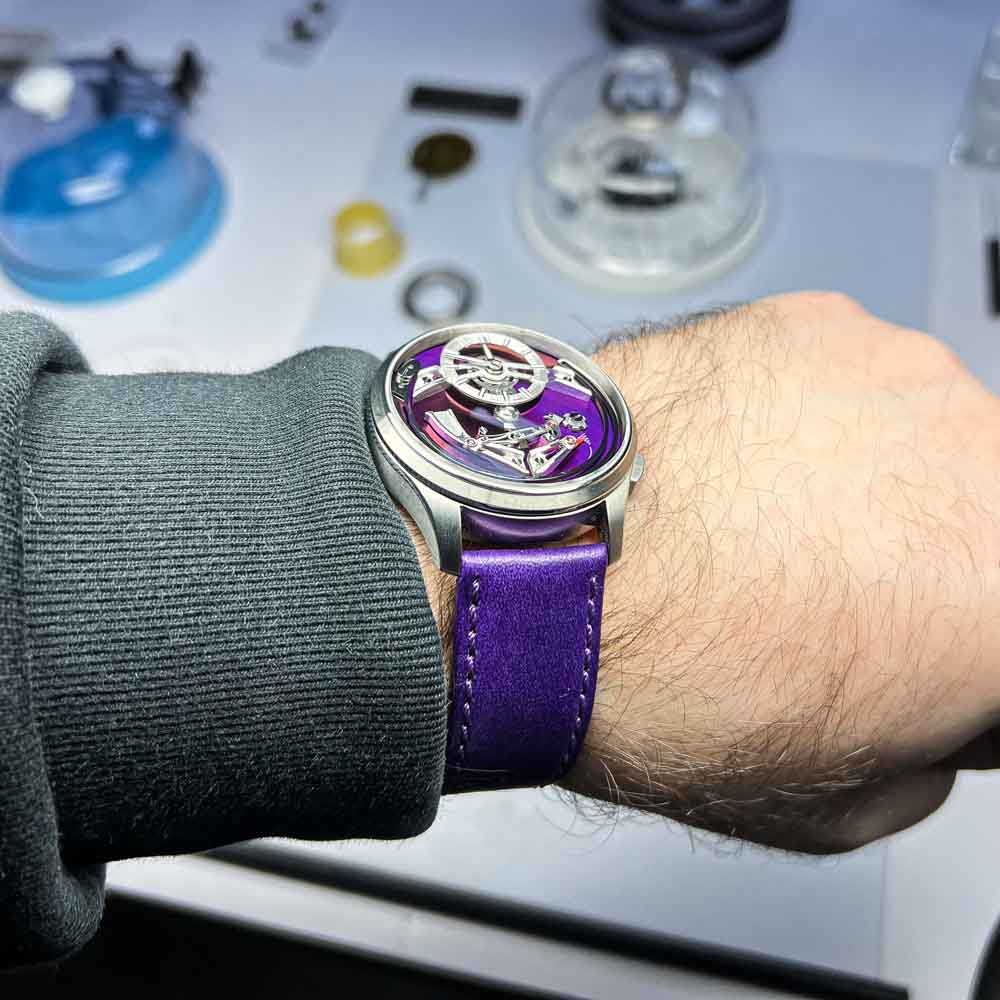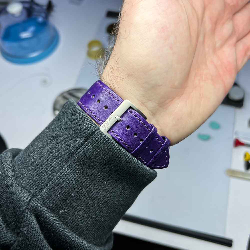 One area where I believe Christopher Ward missed an opportunity is the strap. In my view, they should have considered pairing the watch with a purple or grey ålcantara/suede strap, enhanced with purple stitching and a colorful accent, perhaps yellow, to add a striking visual contrast. While the original strap supplied with the watch—a Vacona leather strap in purple—is of undeniably high quality, it lacks the same “wow factor” that the watch itself delivers. The strap is equipped with a Grade 5 titanium tang-style buckle, which, while functional and robust, could have been elevated by offering a deployment clasp instead. Christopher Ward does provide additional strap options, such as a titanium bracelet and rubber straps, allowing for a degree of personalization. However, none of these alternatives quite resonated with me. Regarding the titanium bracelet, I find that it adds bulk to the watch, shifting its aesthetic toward a more sporty appearance—perhaps at the expense of the refined character the timepiece embodies.