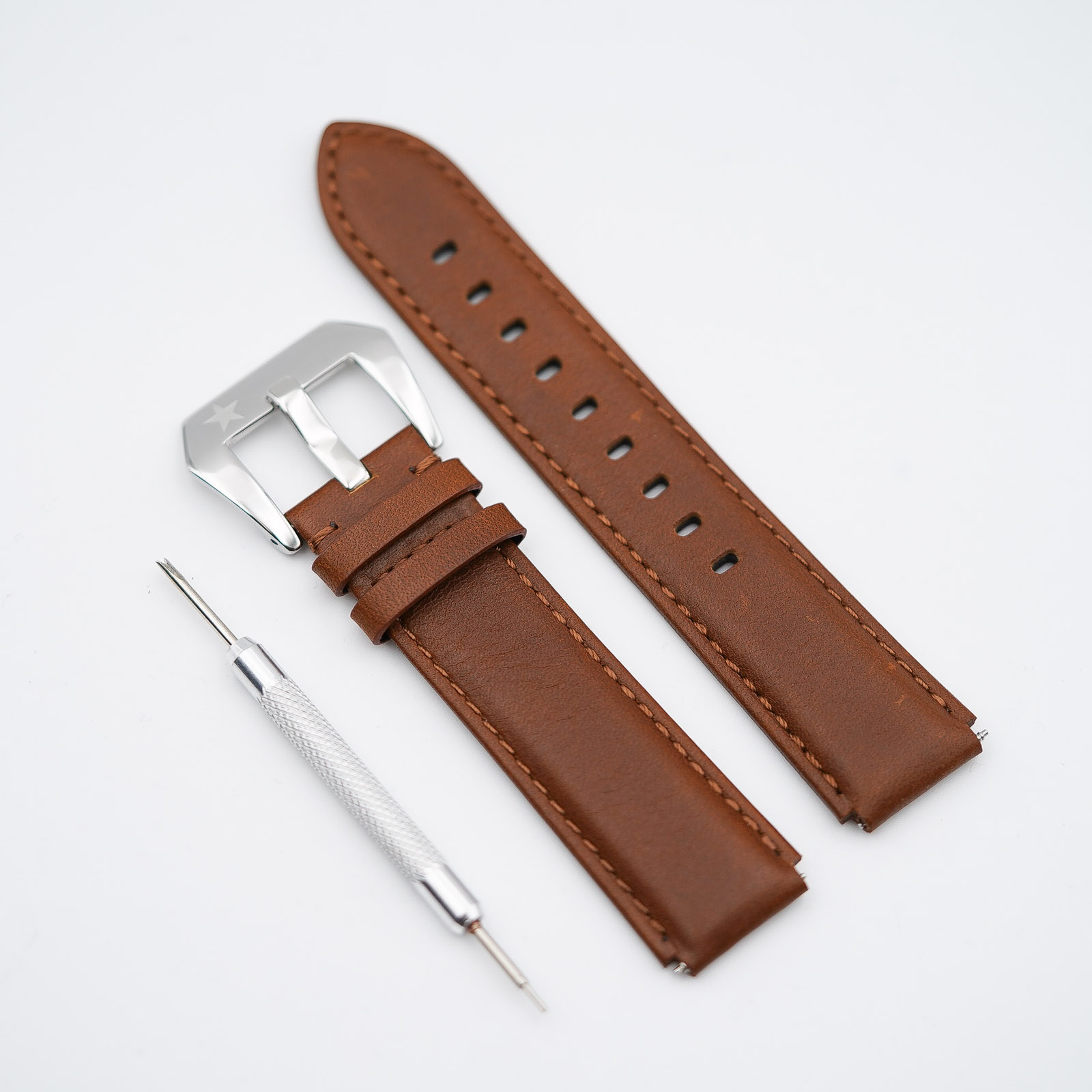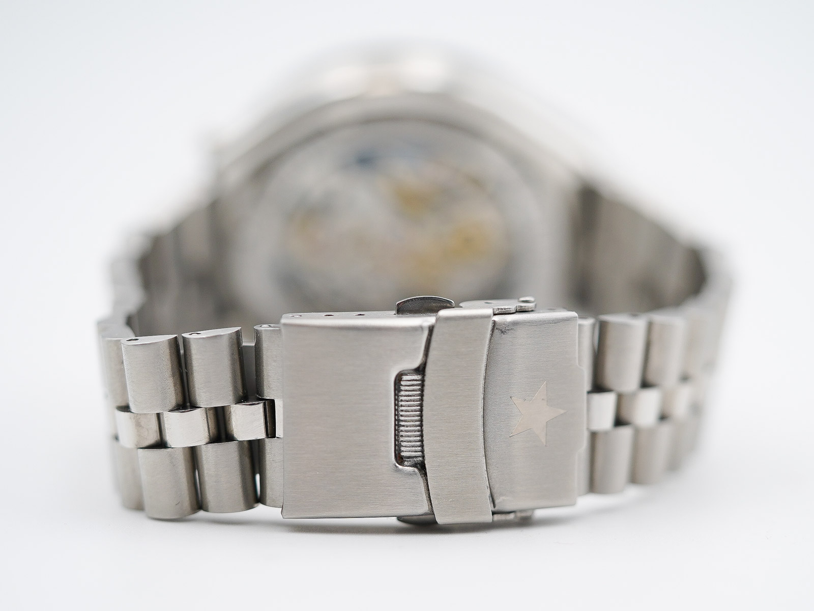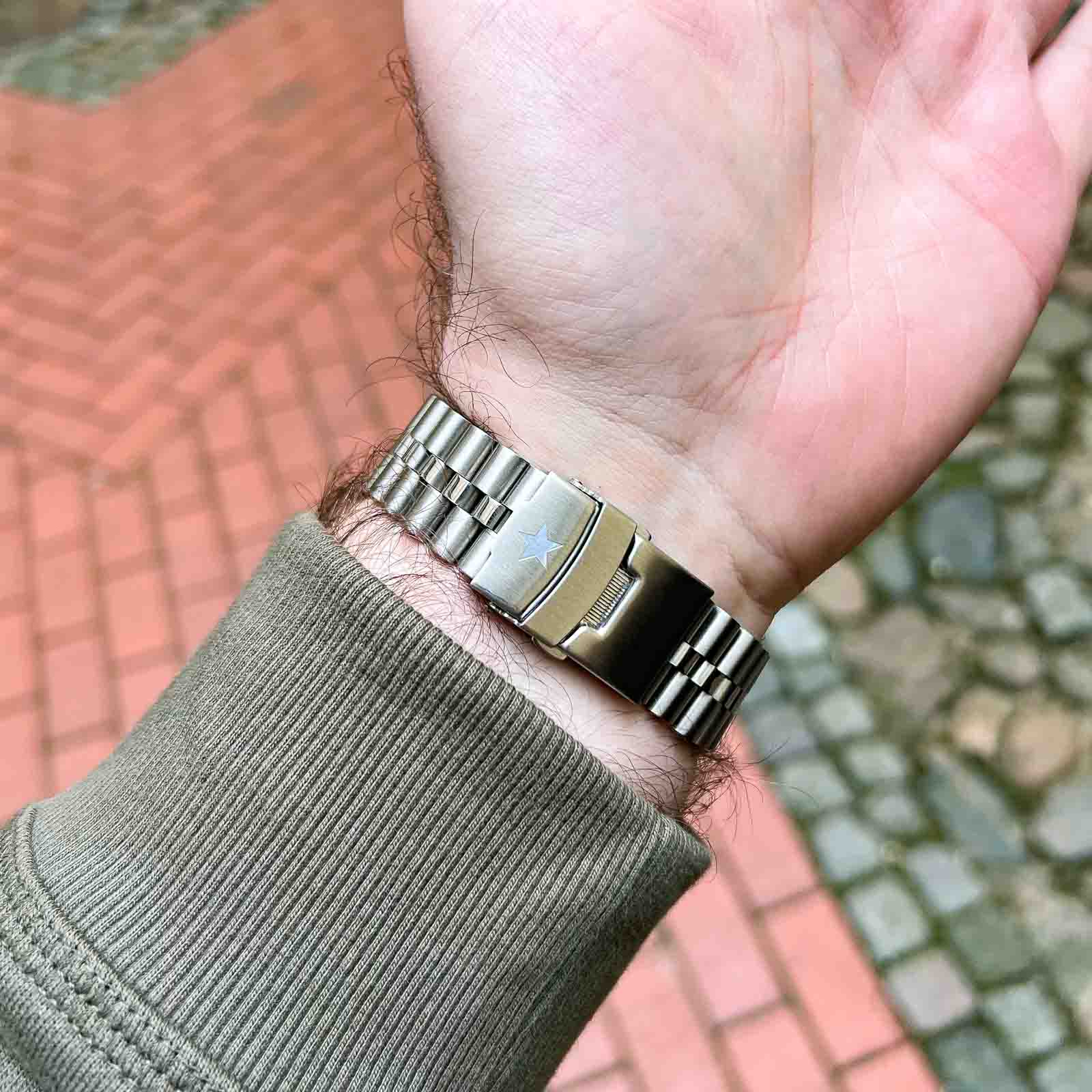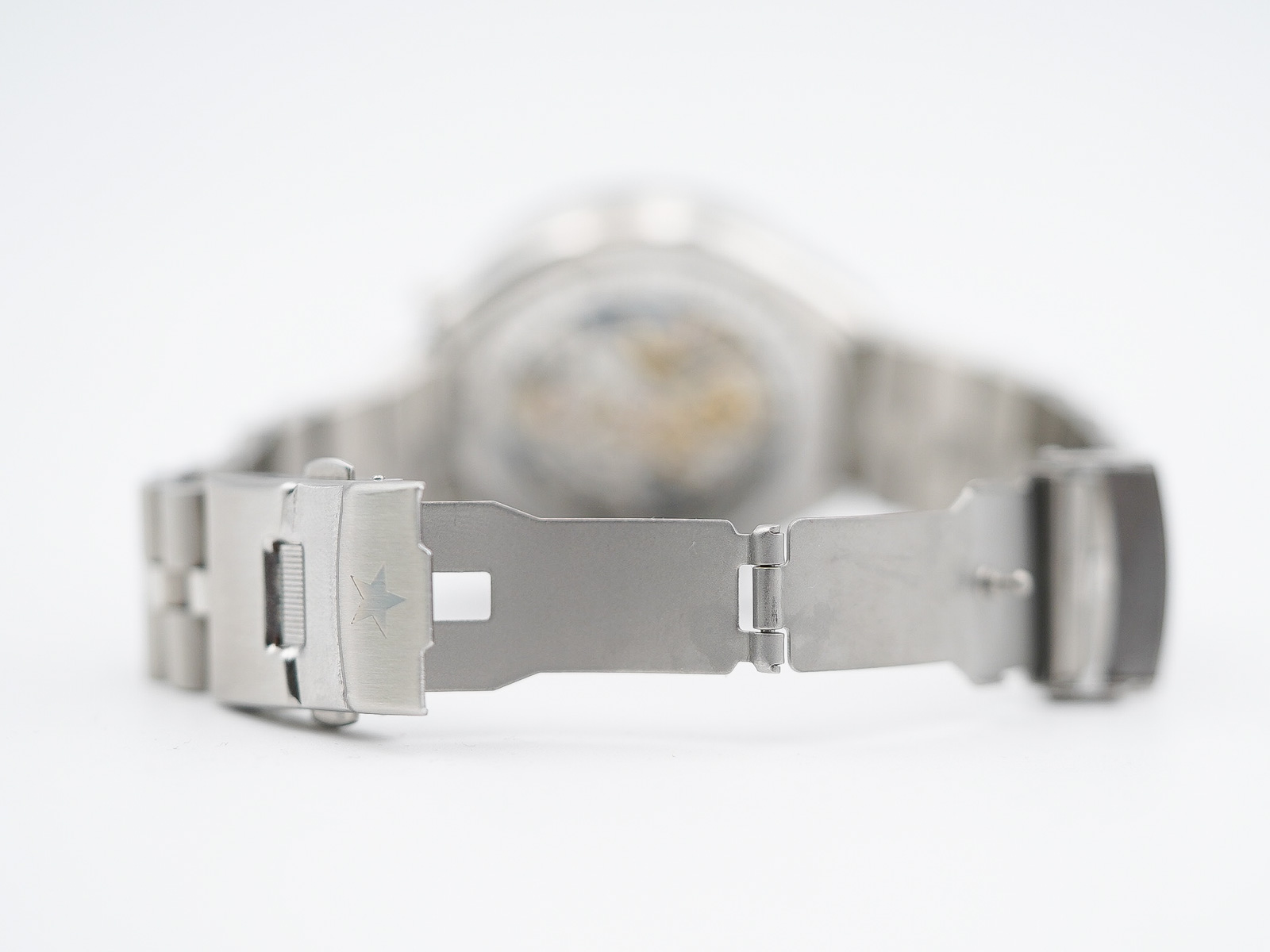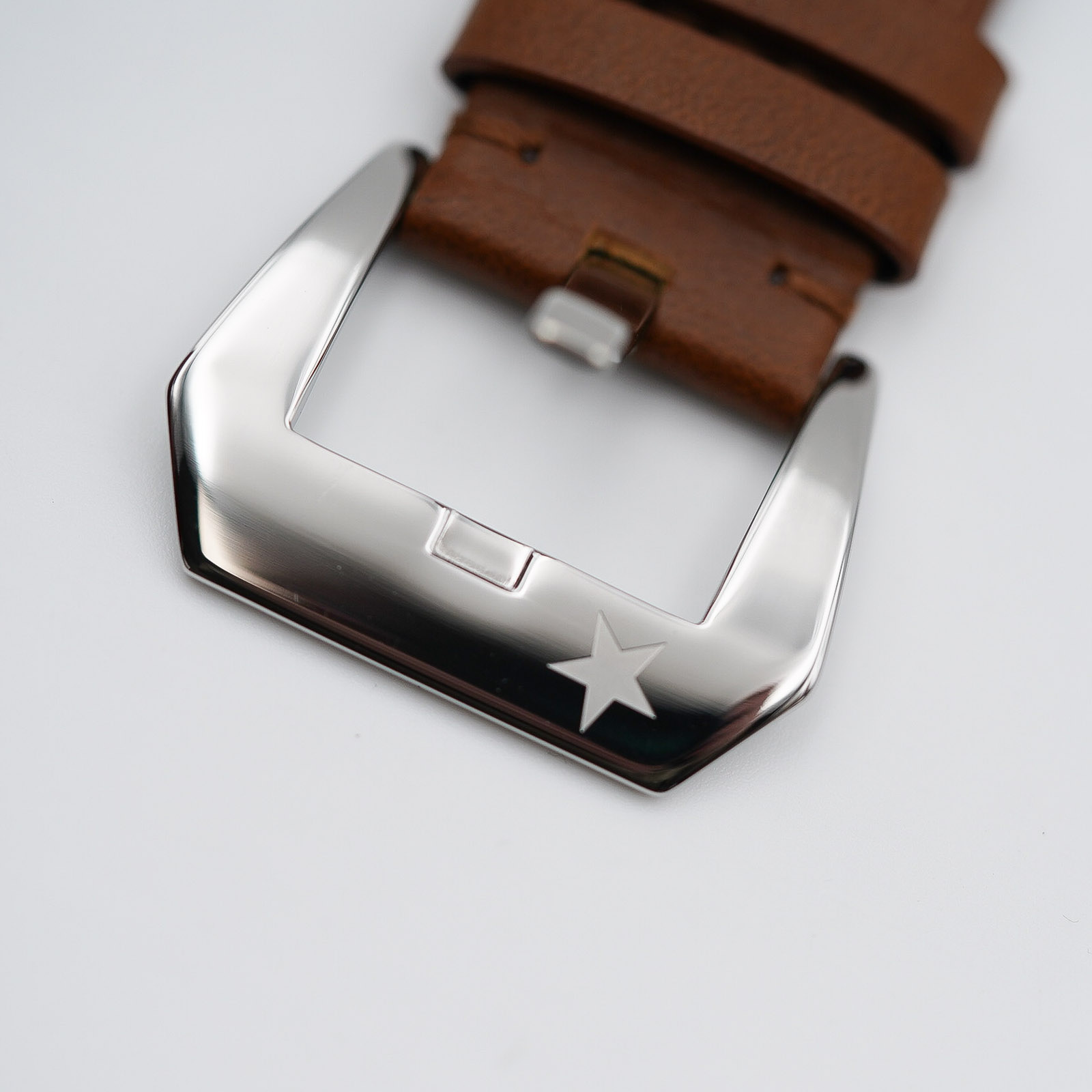 The bracelet, however, is a bit of a letdown. It’s a three-link design with polished center links and brushed outer links, assembled with push pins and fitted with a stamped clasp. The overall construction feels cheap and rattly — reminiscent of aftermarket bracelets found on budget watches. That said, it is surprisingly comfortable on the wrist and does include three micro-adjustments for a better fit. Thankfully, Red Star also includes a high-quality brown leather strap with quick-release spring bars (though oddly, only one side had the quick-release mechanism). The strap is soft, features edge stitching, and is paired with a signed Panerai-style buckle — a significantly better option in terms of comfort and aesthetics.