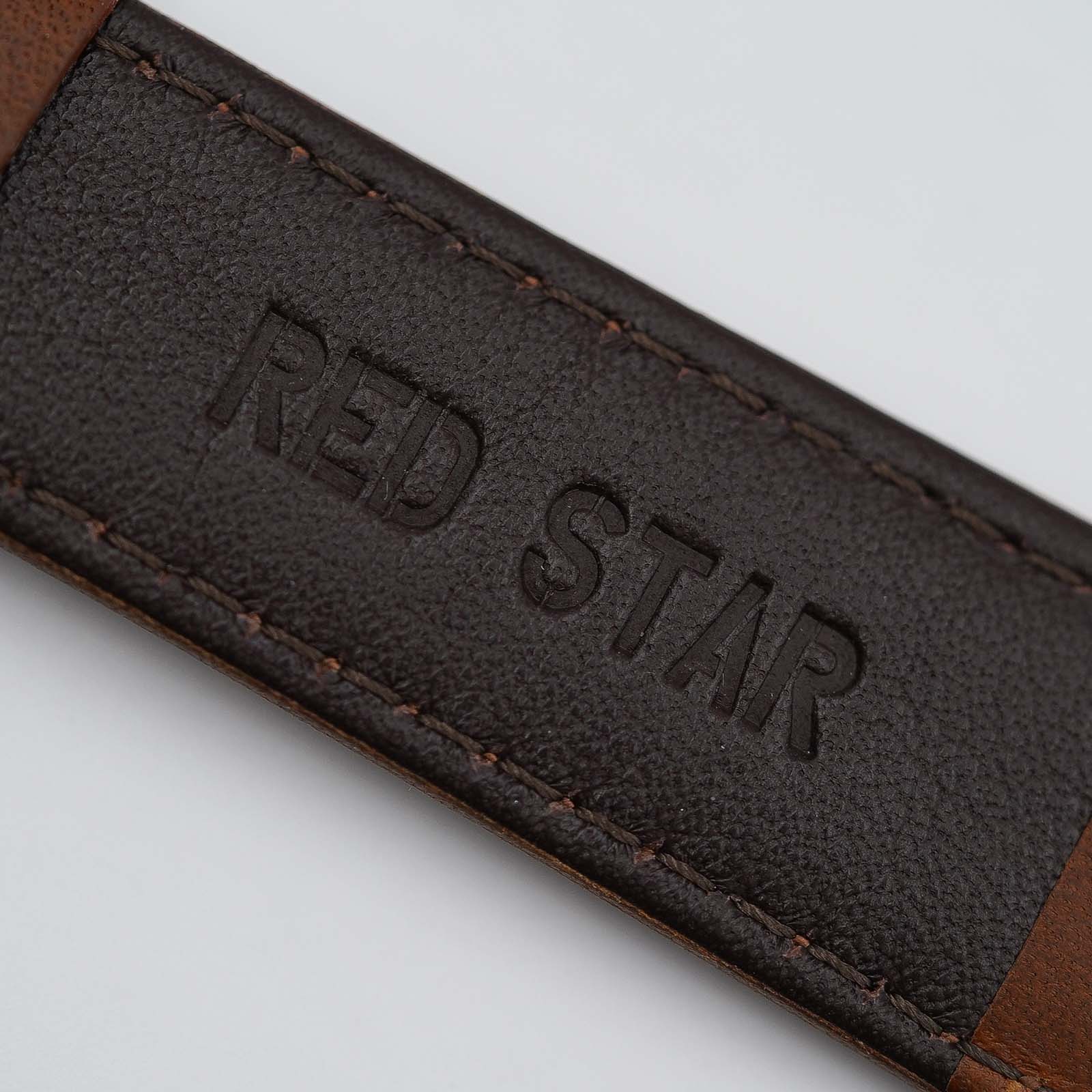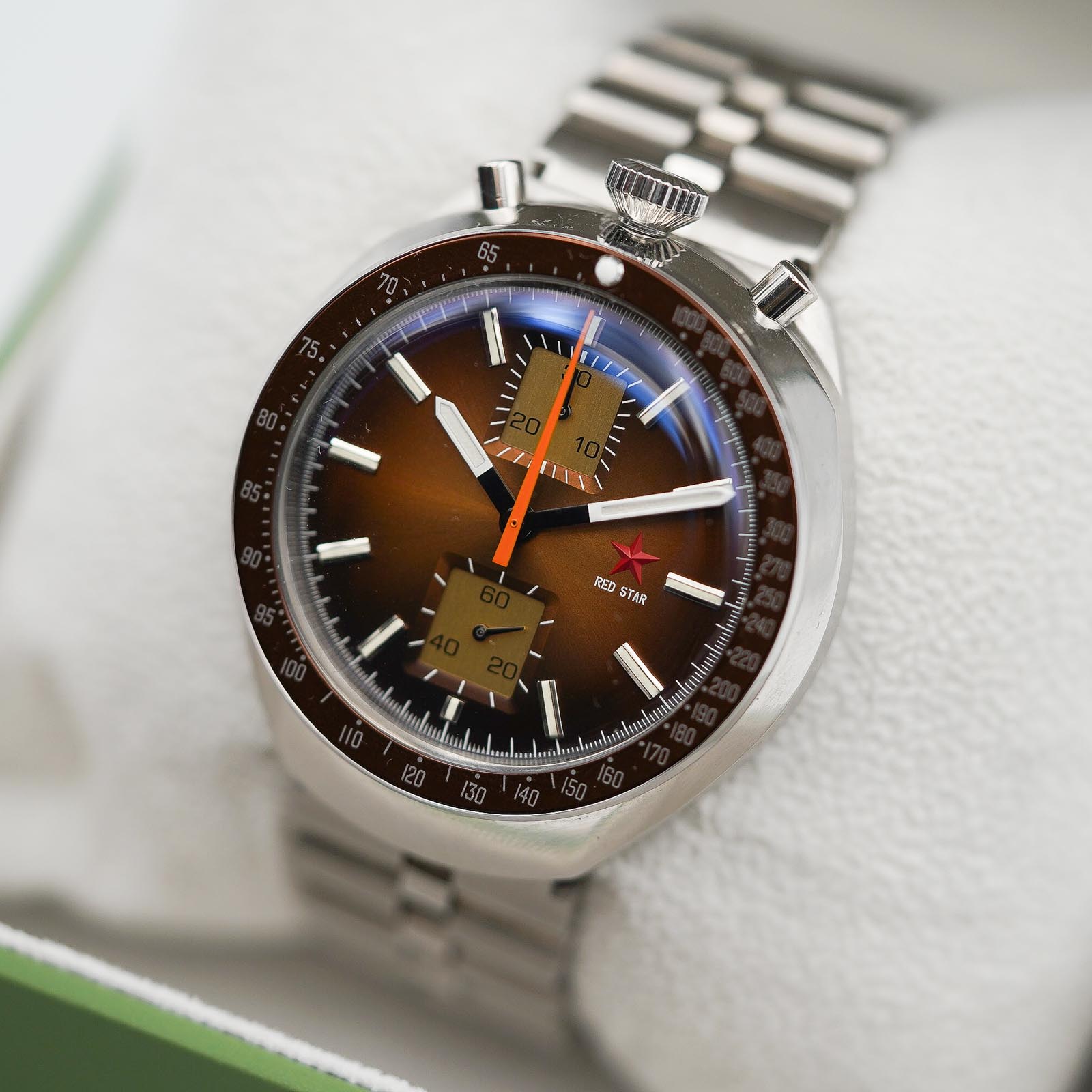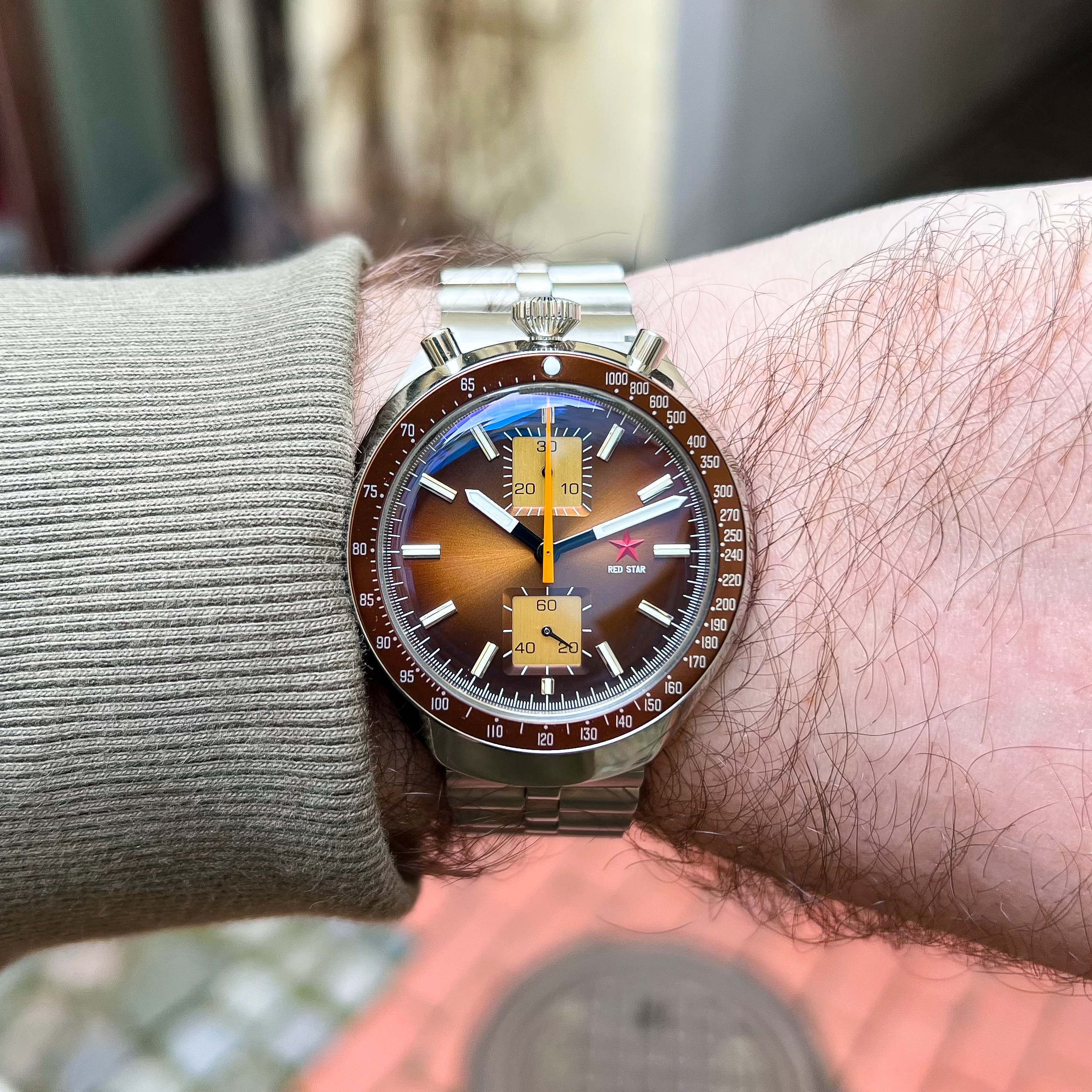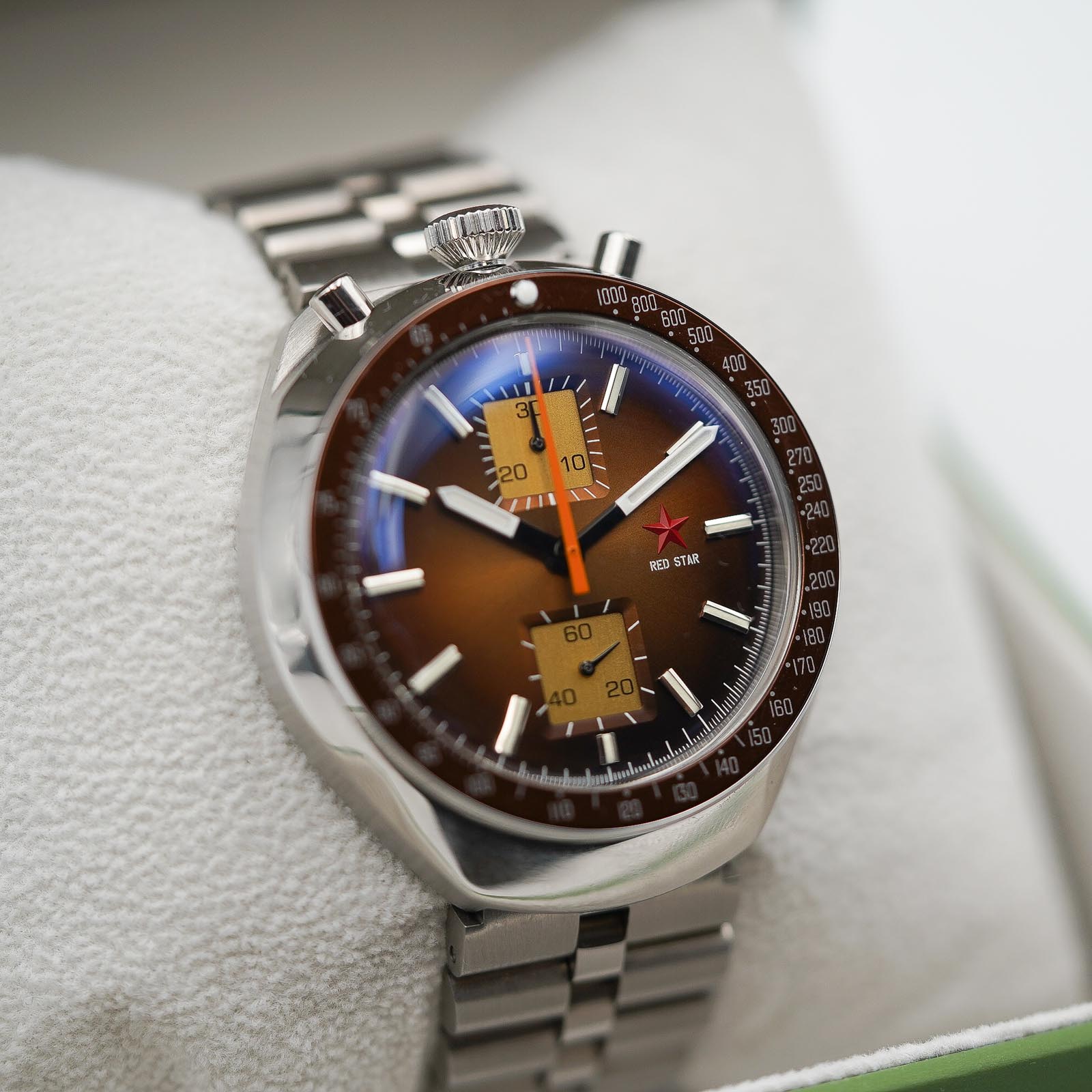 The dial is undoubtedly the showstopper. The rich, matte brown sunburst surface pairs beautifully with the applied gold-tone chronograph subdials, located at 12 and 6 o’clock. Hour markers are applied and filled with lume, though the luminous performance is relatively short-lived — around 15 minutes of glow, based on my experience. The hour and minute hands feature black bases with white luminous tips, while the chronograph seconds hand is rendered in a vibrant orange, adding a burst of retro color. The Red Star logo at 3 o’clock is a nice finishing touch that completes the composition.
