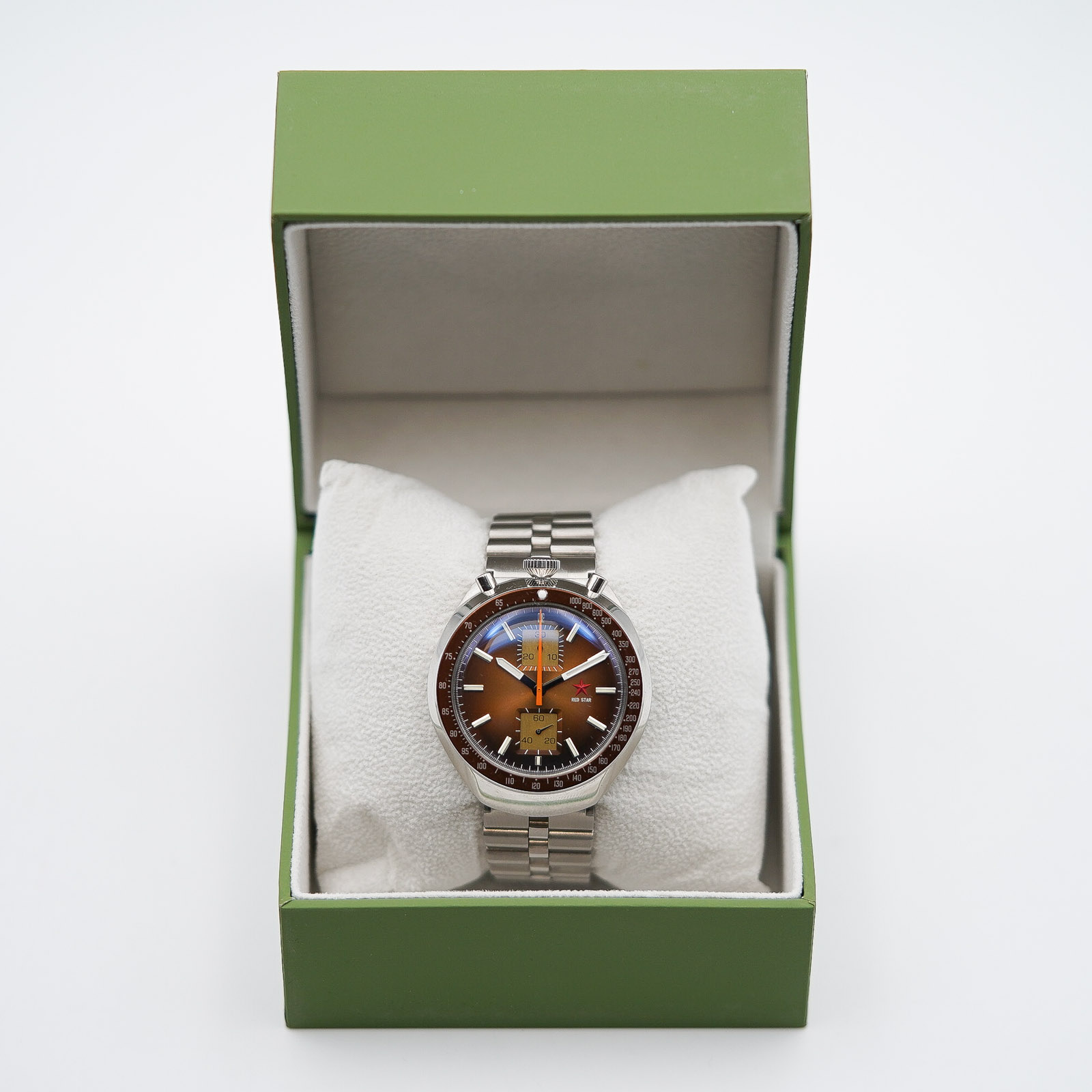 Upon opening the box, my initial reaction was one of pleasant surprise. The Bullhead immediately gives the impression of a much more expensive watch. The brown dial, highlighted by gold-tone square subdials and housed in the distinctive bullhead case, delivers a striking visual impact. The retro inspiration is unmistakable, and as someone who deeply appreciates 1970s watch designs, I was genuinely impressed.