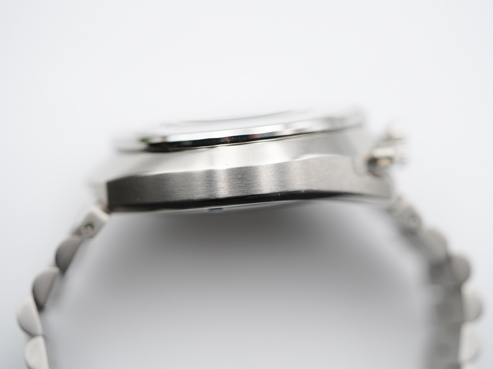The case is constructed from 316L stainless steel and measures 42mm in diameter, with a lug-to-lug length of 45mm and a thickness of 12.7mm. On paper, the watch may seem large, but due to its unique configuration — including hidden lugs and the crown and pushers located at 12 o’clock — it wears more like a compact 39mm on my 18cm wrist. The finishing on the case is quite remarkable at this price point, with satin-brushed sides and a polished top that reflect light beautifully, reinforcing the vintage aesthetic. The watch features a fixed brown tachymeter bezel with a lume pip at 12, adding both functionality and a touch of flair.