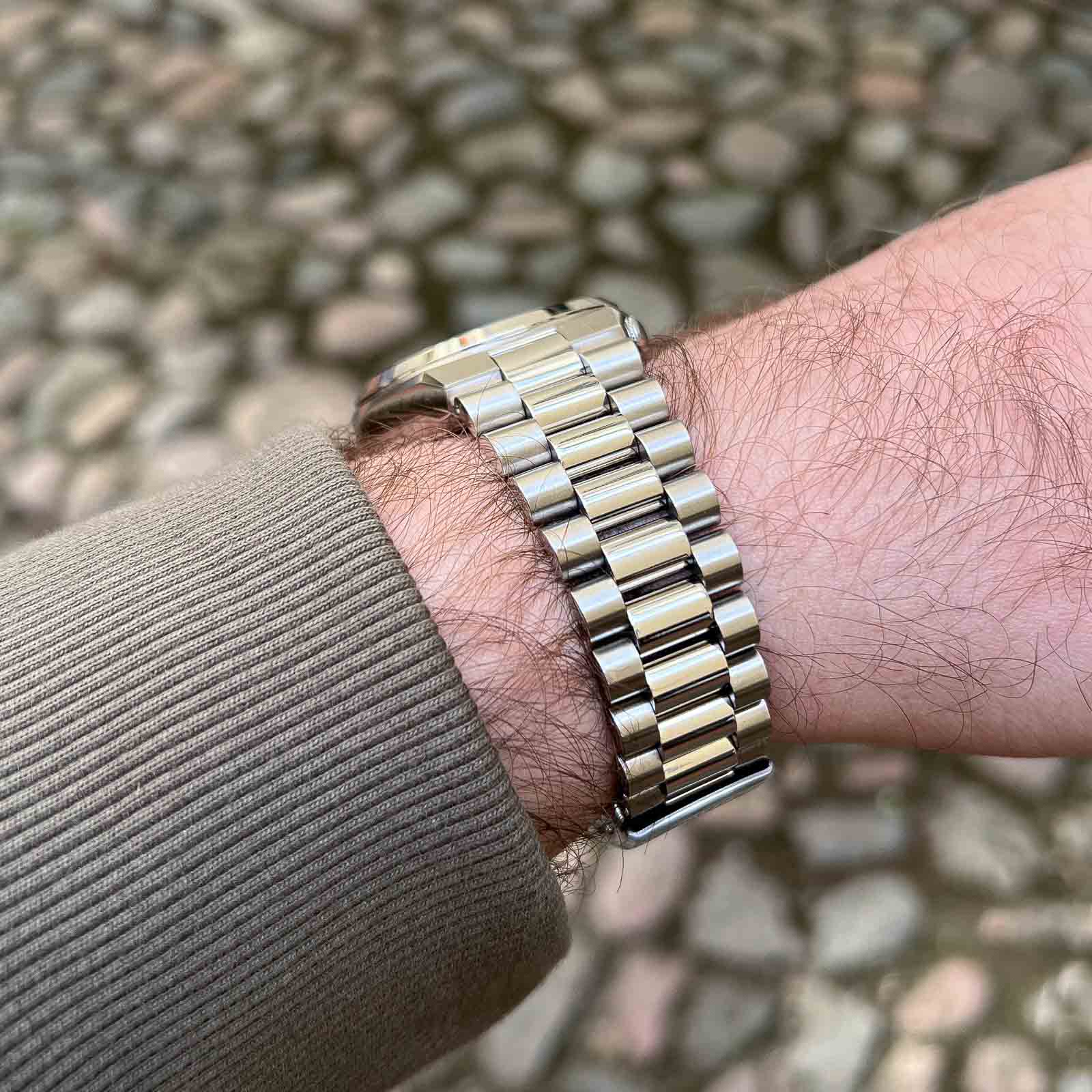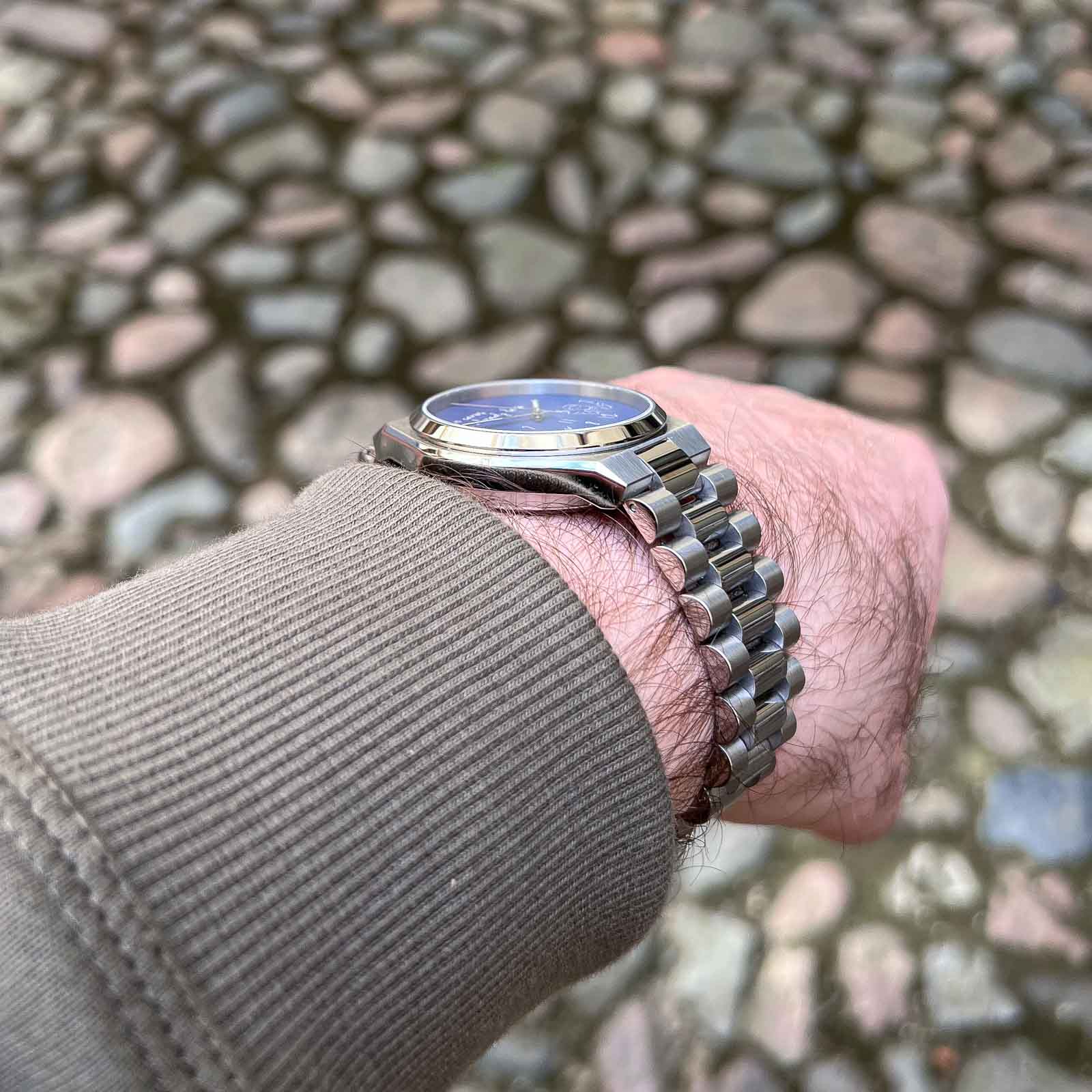 The stainless steel bracelet is integrated into the case and features solid end links and a stamped foldable clasp. The clasp offers 3 micro-adjustments, the overall comfort is excellent thanks to the watch’s slim profile and balanced weight. The bracelet feels solid and complements the case design well, though seasoned enthusiasts might wish for solid end links or a more refined clasp in future iterations. Design actually resembles the Rolex president bracelet which is one of my favourite bracelet designs.