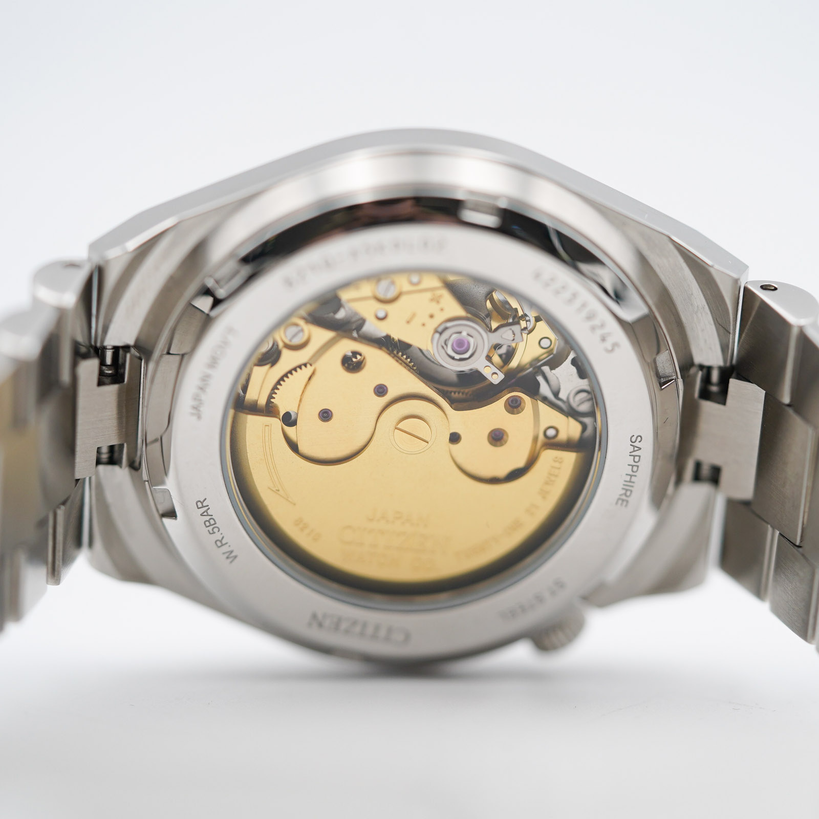 Inside, the Tsuyosa houses Citizen’s caliber 8210, a dependable automatic movement with a 45-hour power reserve. It beats at 21,600 bph and can be seen through the exhibition caseback, which offers a nice view of the rotor and movement architecture—even if the finishing is industrial rather than decorative. The movement is hacking (the seconds hand stop when you pull out the crown), it does support hand-winding and has proven to be accurate and reliable in daily wear. Serviceability is also a strong point—parts for the 8210 are readily available, and most watchmakers are familiar with it.