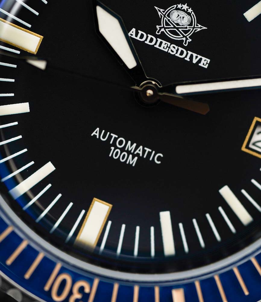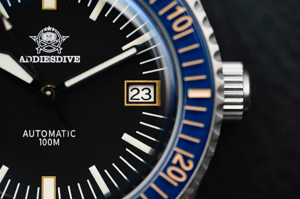 Text on the dial is minimal, with the Addiesdive logo at 12 o’clock and “Automatic & 100M” at 6 o’clock. The layout closely resembles the modern Certina DS PH200M, and the overall legibility is excellent. For a watch that hints at dive watch heritage, even with the limited water resistance, it gets the job done in terms of function and readability.