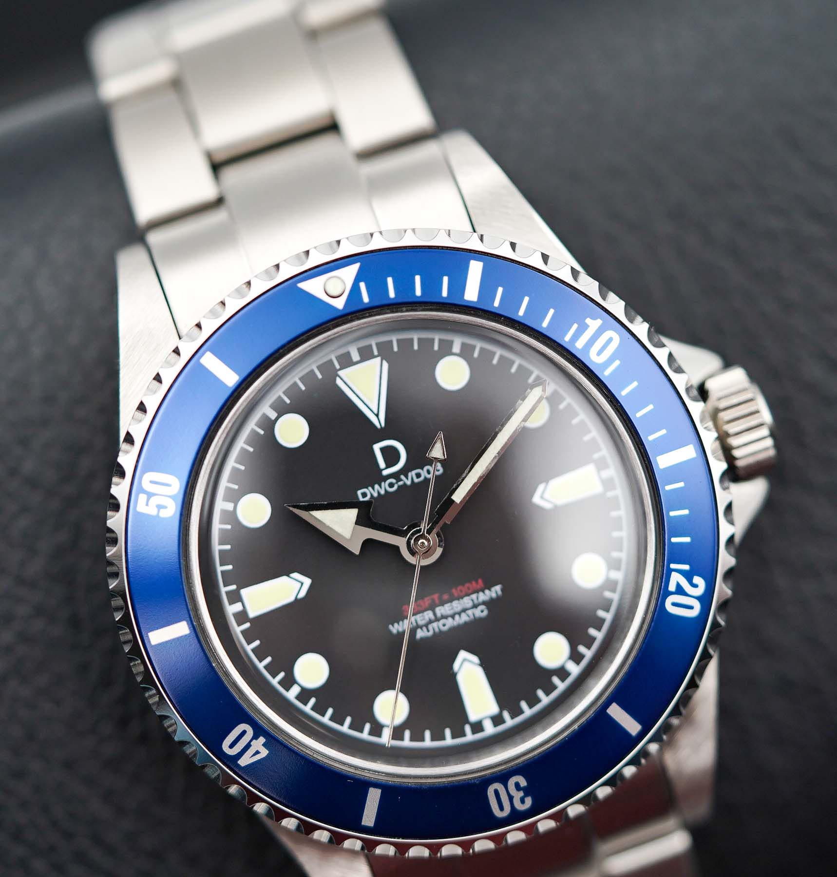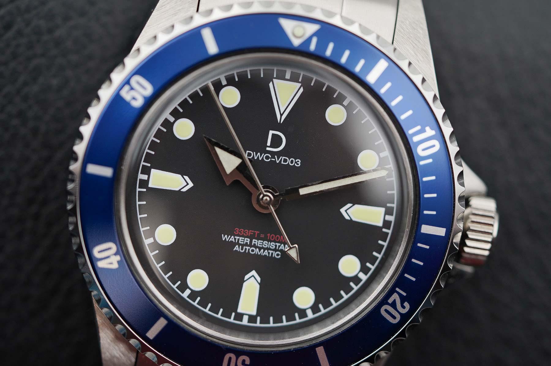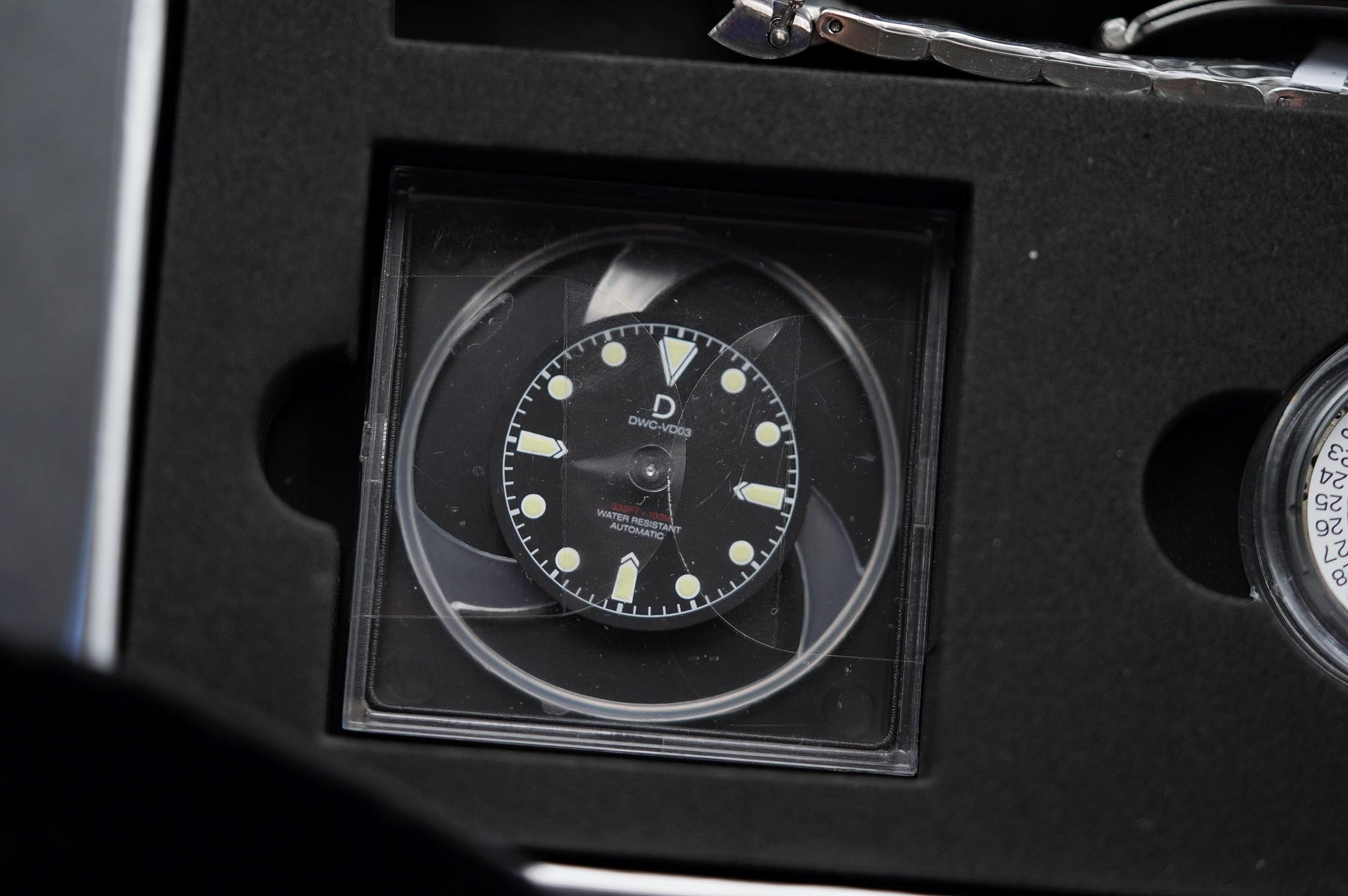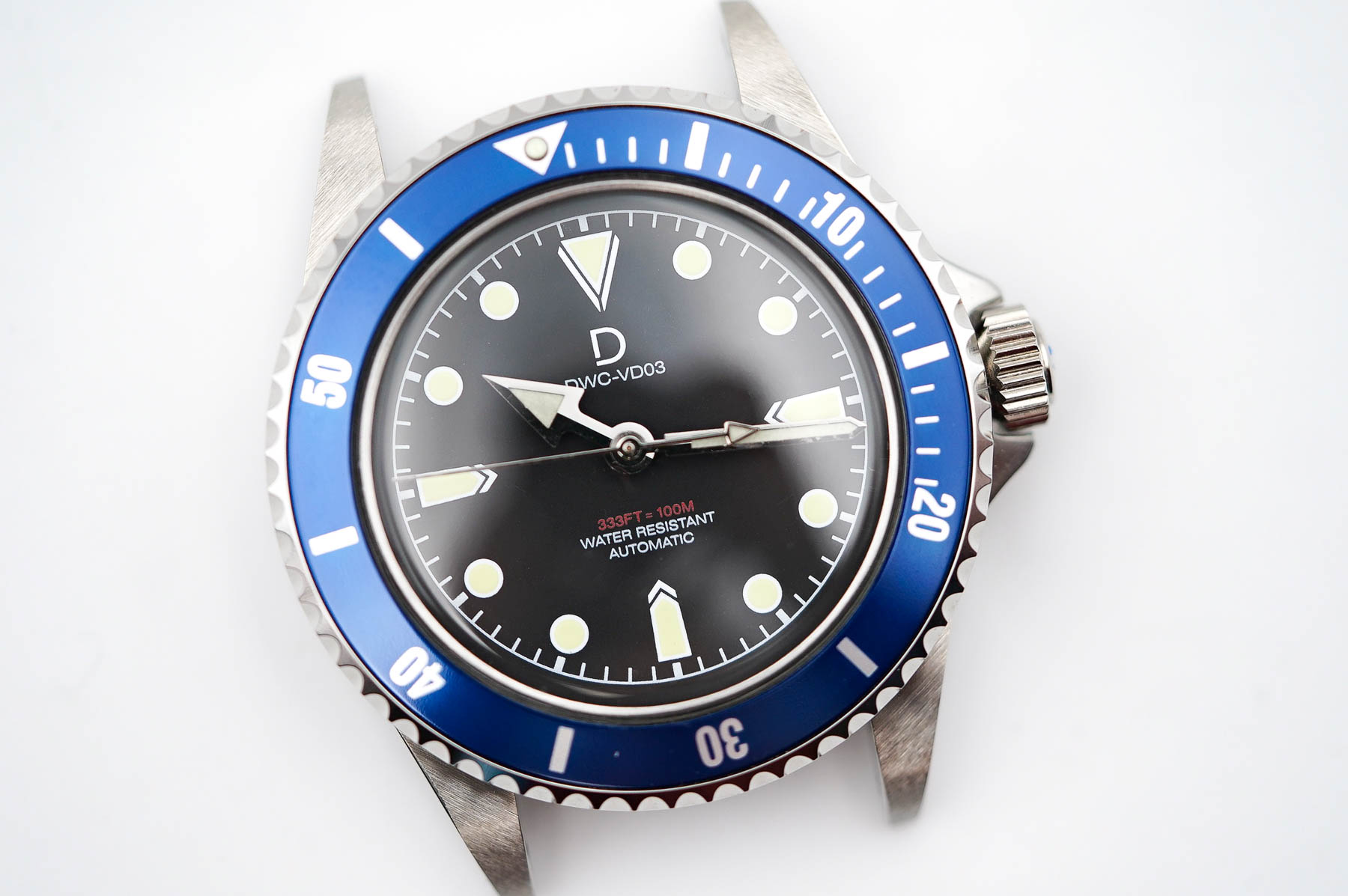 The dial features a clean, matte black finish with white printed hour markers filled with lume for low-light visibility. Its design clearly pays tribute to the classic Rolex Submariner aesthetic, offering a timeless and familiar look. A white printed minute track runs along the outer edge of the dial, enhancing legibility without cluttering the layout. At the 12 o’clock position, the DIY Watch Club logo is prominently displayed, with the model name “DWC-VD03” printed just below it. At 6 o’clock, the text indicates the watch’s water resistance and “Automatic” movement designation, all in simple red/white print that maintains the overall minimalistic approach.