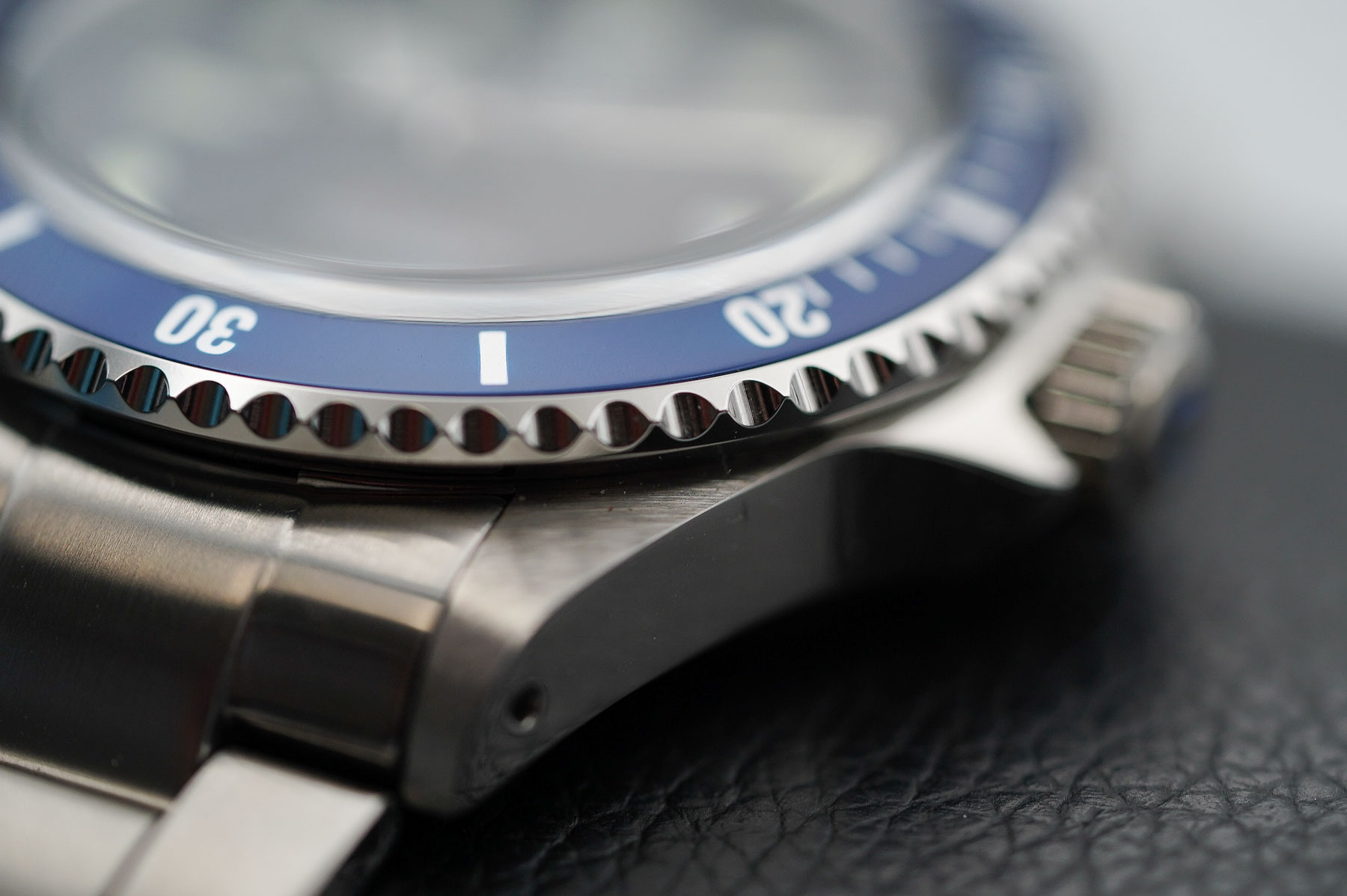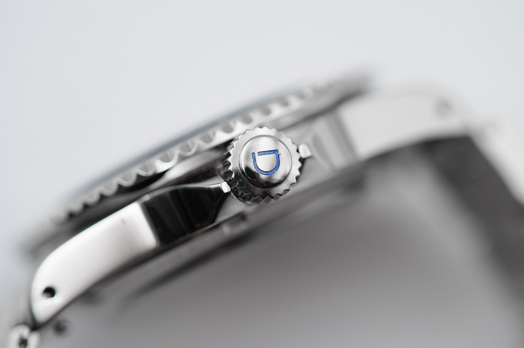 At the 3 o’clock position, you’ll find polished crown guards flanking a signed, polished push-pull crown. As I mentioned earlier, I would have preferred a screw-down crown, especially given this is a dive-style watch—a screw-down crown would improve water resistance and stay more true to the genre. On top, there’s a 60-click unidirectional bezel. While the action is decent, I’d personally prefer a 120-click bezel for more precise alignment. There’s also a bit of play in the bezel, which is likely due to the lower click count. The blue aluminum bezel insert needed to be installed manually using the provided double-sided adhesive—a surprisingly simple and straightforward task.