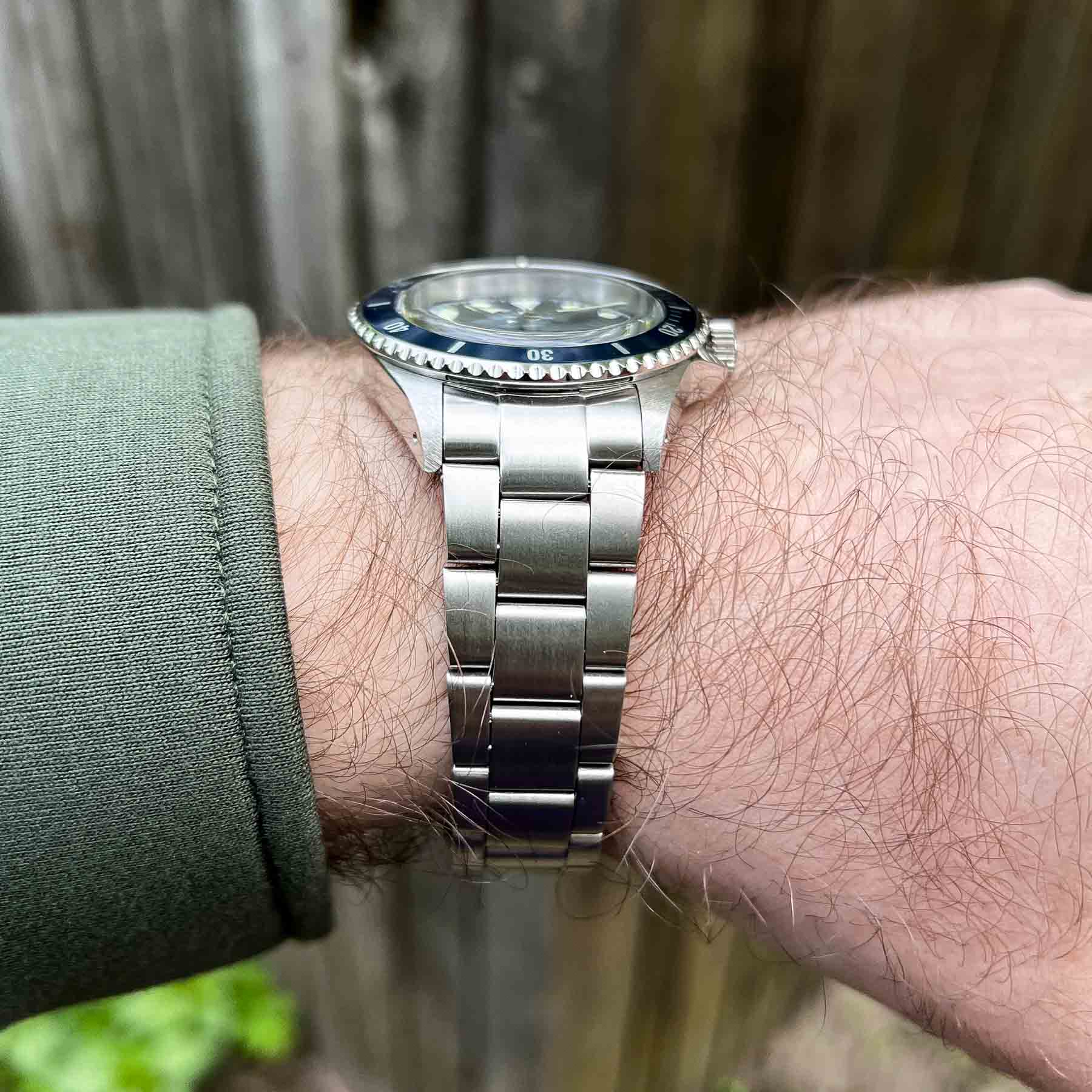 The bracelet is crafted from 316L stainless steel and styled after the classic Oyster bracelet, featuring three-piece links. It has a satin-brushed finish on the top surfaces with polished sides, giving it a refined, vintage-inspired look. The bracelet includes solid end links, and the links themselves are held together with push pins—though I personally would prefer screw-in links for easier and more secure sizing. The clasp is stamped and signed, offering three micro-adjustments to help dial in a more precise fit. One feature I really appreciate is the inclusion of quick-release spring bars, which make swapping between the bracelet and a strap incredibly easy—no tools needed. On the wrist, the bracelet is very comfortable and doesn’t tug at arm hairs, which is always a plus.