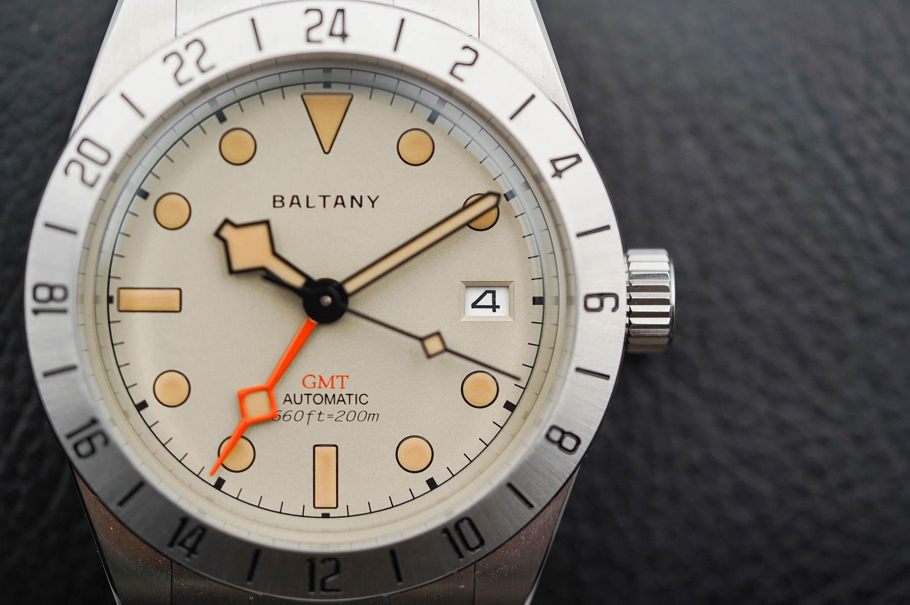 The hands are styled in the distinctive Tudor snowflake design. The hour hand is short, bold, and polished, filled generously with lume. The index shaped minute hand is longer, also polished and lume-filled, offering great visibility. The seconds hand is slender with a lume-filled rhombus (diamond) shape, maintaining the vintage-military vibe. The GMT hand stands out in bright orange, with a matching rhombus tip also filled with lume—easy to spot and visually dynamic. At 12 o’clock, the Baltany logo is crisply printed in black, while at 6 o’clock, you’ll find “GMT” in orange, followed by “Automatic” and “660ft = 200m” in black, all neatly balanced and well-proportioned. The dial is highly legible, thoughtfully designed, and impressively finished. The quality of the printing, lume application, and hand polishing is on par with the already excellent case finishing. It’s clear that Baltany takes quality control seriously, and I’d argue they have some of the best—if not the best—QC among Aliexpress-based watch brands.