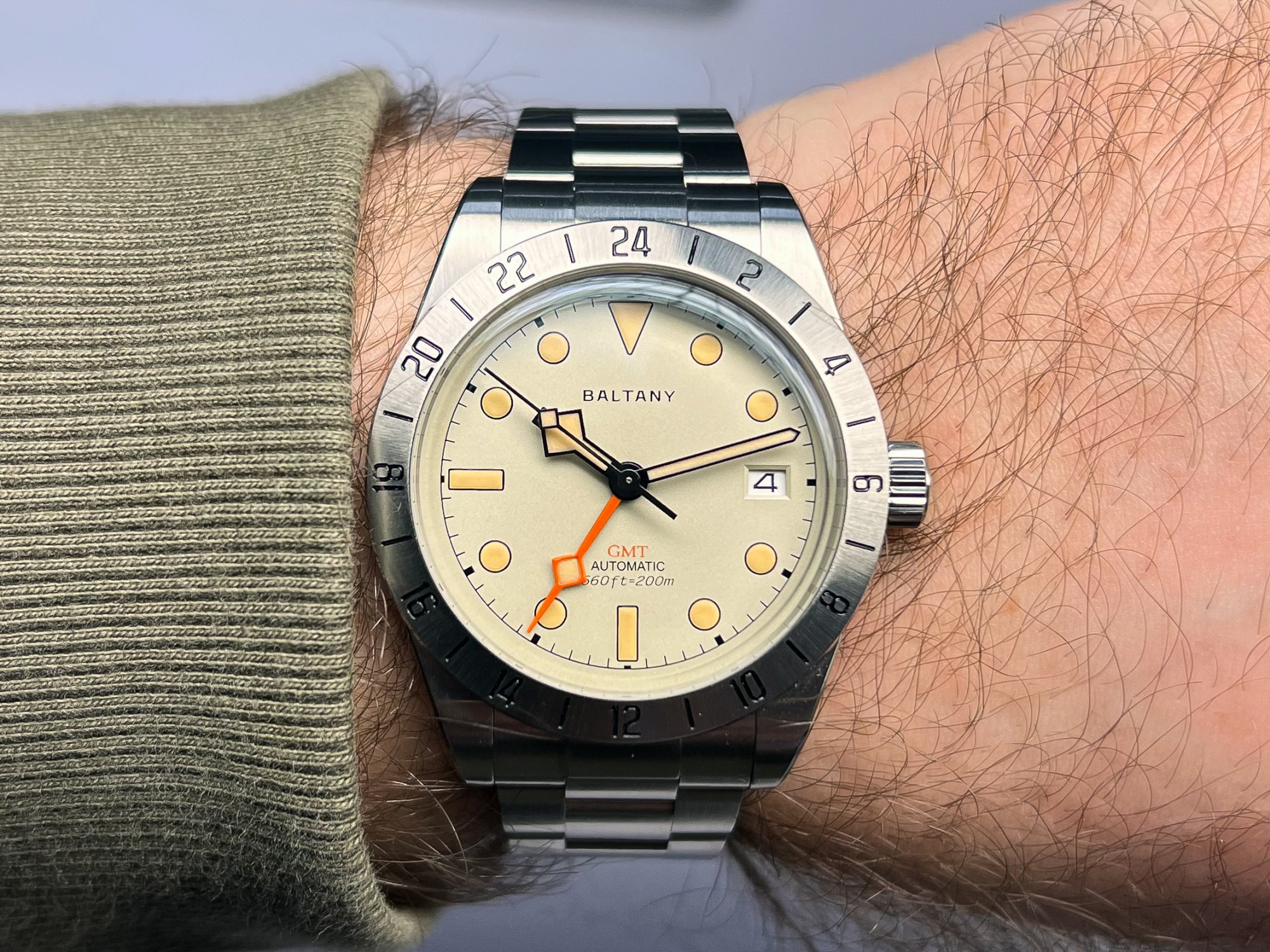 After spending time with the Baltany Retro GMT, it’s clear that this watch is a standout offering in the affordable GMT segment. From the case finishing and vintage-inspired design to the solid bracelet and the reliable Seiko NH34 movement, everything about this watch feels deliberate, well-executed, and far beyond what its $155 price tag suggests. The level of detail is impressive—sharply brushed and polished surfaces, a clean and legible cream dial with bold lume, a high-domed sapphire crystal, screw links, a milled clasp, etc. Even the packaging and presentation reflect a brand that cares about its product and its customers.