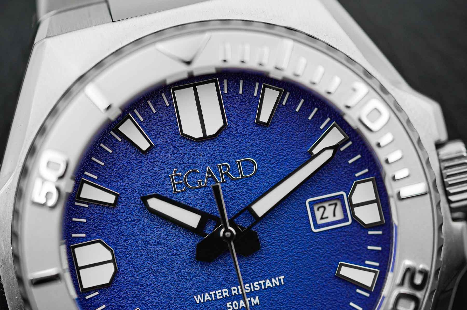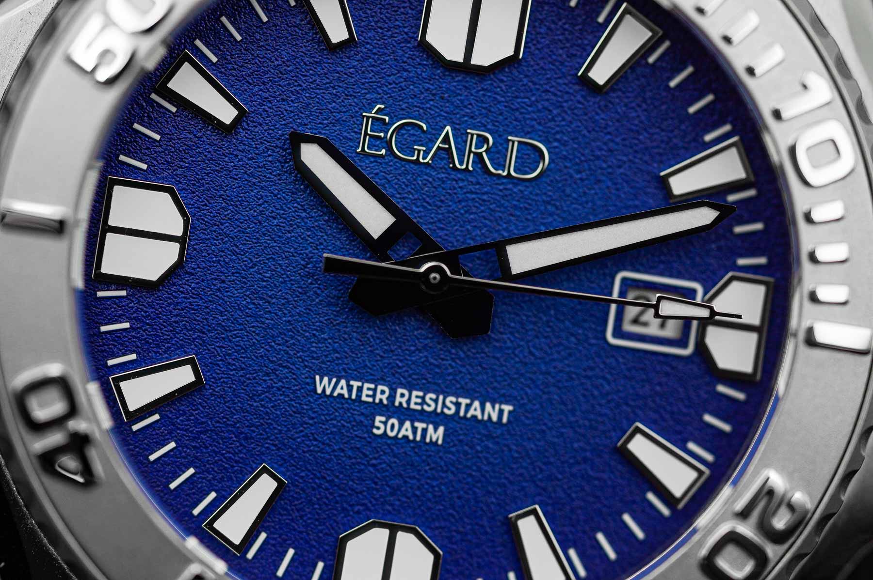 A clean white minute track is printed around the outer edge, adding clarity without clutter. The hour and minute hands are bold, polished, and generously filled with lume for excellent visibility. The seconds hand is spear-shaped with a small arrow tip, also lumed and polished, contributing to the dial’s cohesive and modern aesthetic. At 12 o’clock, the Égard logo is applied in polished metal, adding a premium touch, while the 500M water resistance rating is printed in white at 6 o’clock. The date window at 3 o’clock features a white frame and a matching white date wheel—functional, though its placement slightly breaks the symmetry. Lume performance is solid, making the watch easy to read both during the day and in low-light conditions. Overall, despite the unfortunate misalignment at 12 o’clock, the dial is where the King Ocean makes its strongest impression. It shows that Égard has an eye for bold, appealing design—even if the execution still needs some refining.