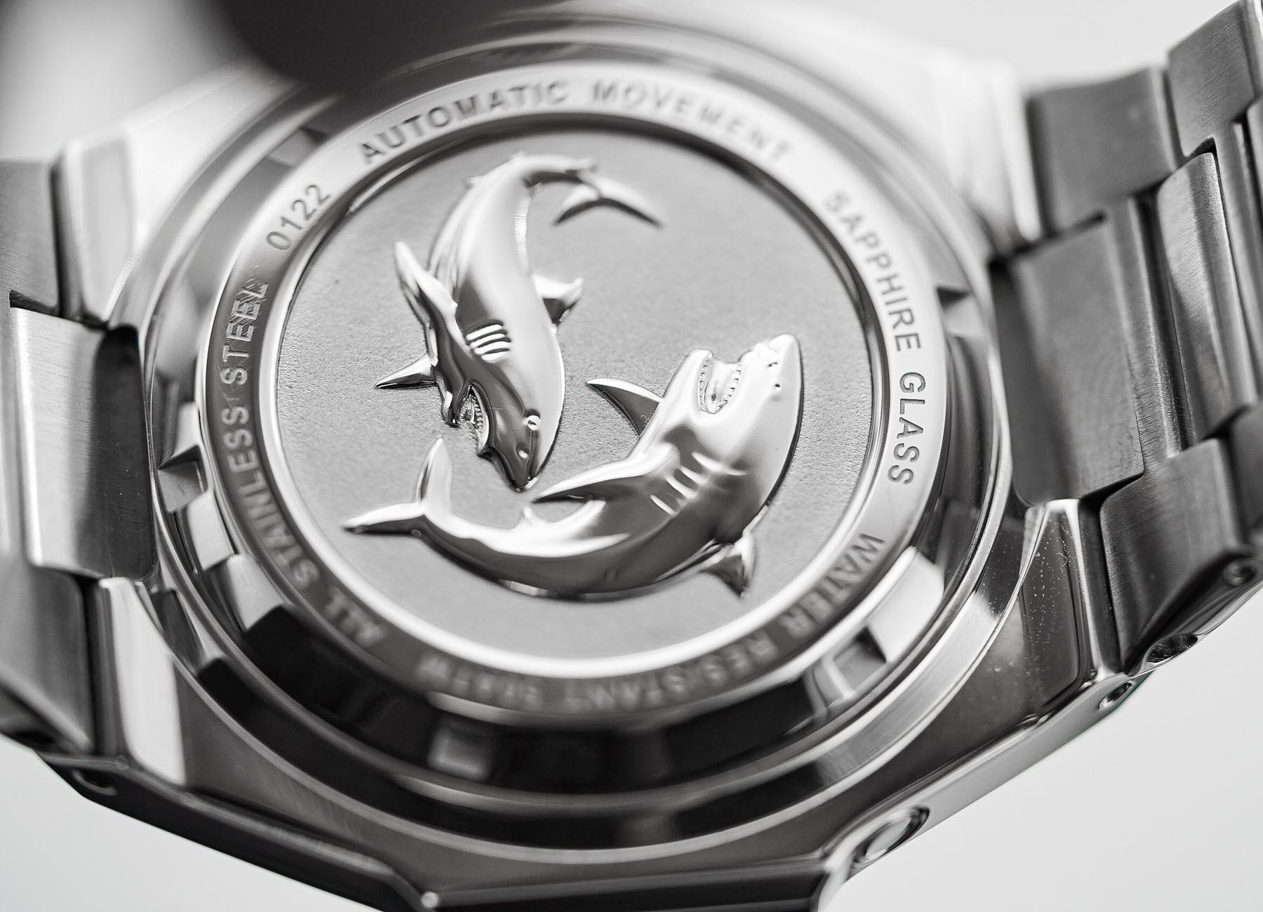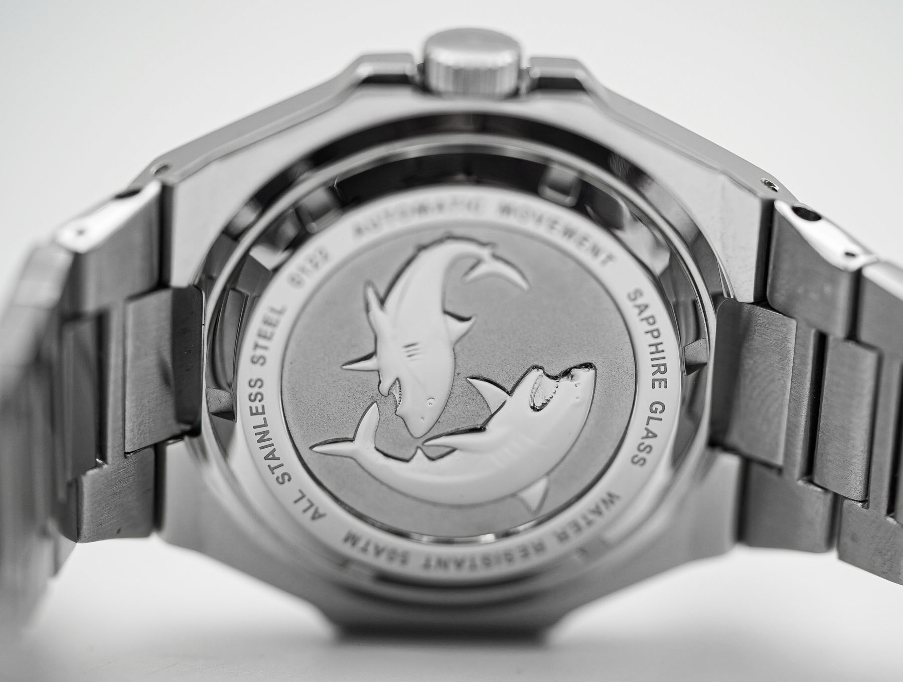 At the 3 o’clock position is a large, polished screw-down crown, signed with Égard’s dual-sword logo. It’s easy to grip and fits the overall chunky aesthetic of the watch. Around back, the solid caseback features two deeply embossed sharks—a fun and fitting detail for a dive watch. However, the execution again suffers slightly: there are small surface dimples, and one of the sharks appears to be over-polished, losing much of its original texture and detail. Protecting the dial is a flat sapphire crystal with anti-reflective coating, and the watch boasts an impressive water resistance of 500 meters (50 ATM), which is more than adequate for any diving or water-based activity.