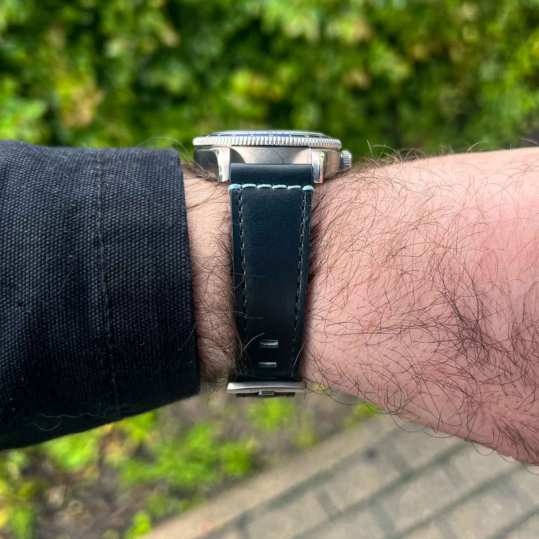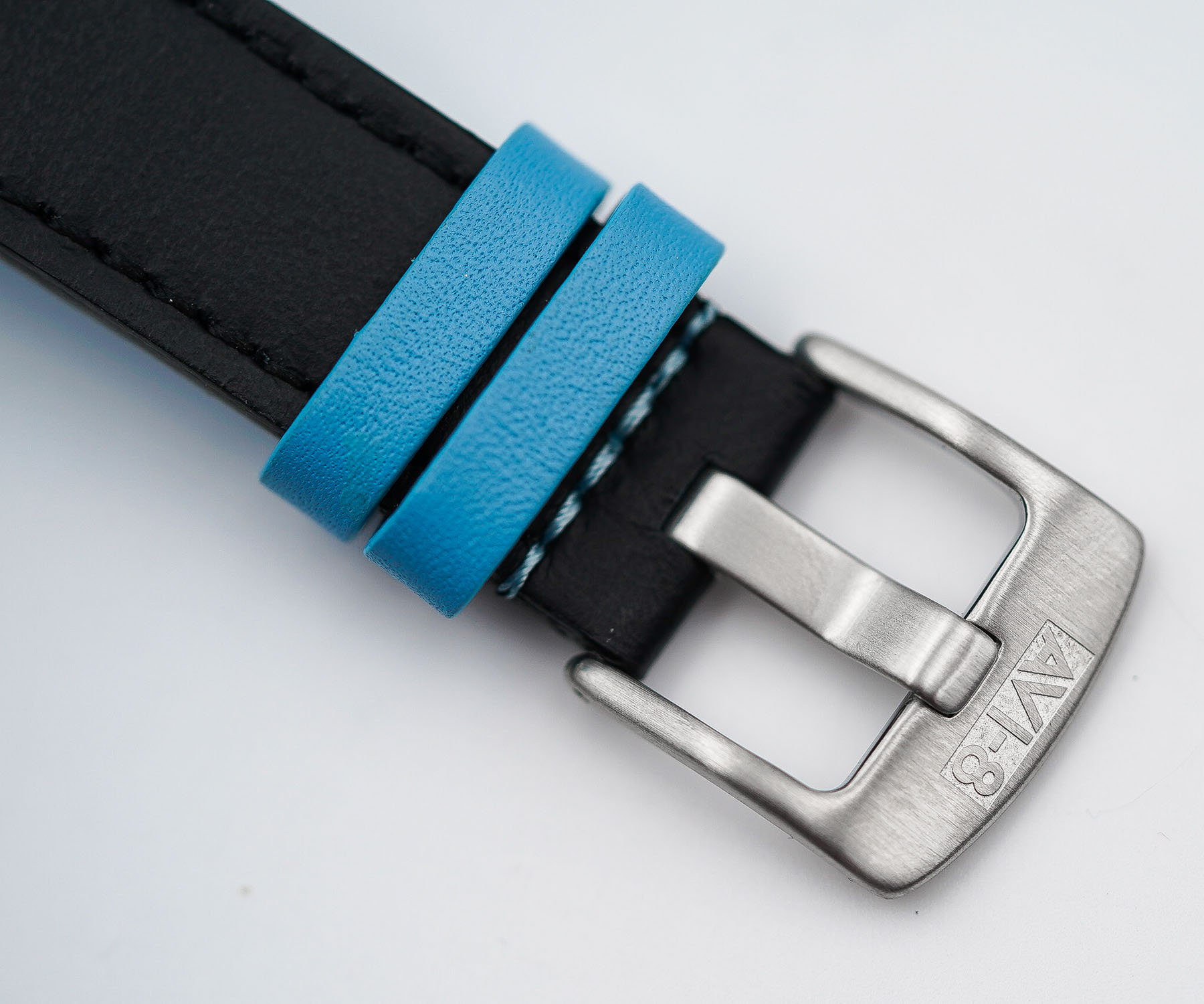 The Airmaster GMT comes equipped with a black leather strap accented with blue detailing—an area where AVI-8 consistently excels. Strap design has long been one of the brand’s strengths, and this example is no exception. The leather is soft and supple straight out of the box, offering a level of comfort rarely found at this price point. The strap features clean black stitching, complemented by subtle blue contrast stitching near the lugs, adding a touch of visual interest without being overbearing. The underside is lined with blue leather, matching the color of the keepers and tying the whole design together cohesively. A brushed tang-style buckle, signed with the AVI-8 logo, completes the look. The buckle is well-made and feels secure, with a finish that matches the overall utilitarian style of the watch. On the wrist, the watch wears exceptionally well thanks to the strap’s immediate pliability and well-proportioned taper—from 20mm at the lugs down to 16mm at the buckle—enhancing both comfort and aesthetic appeal.