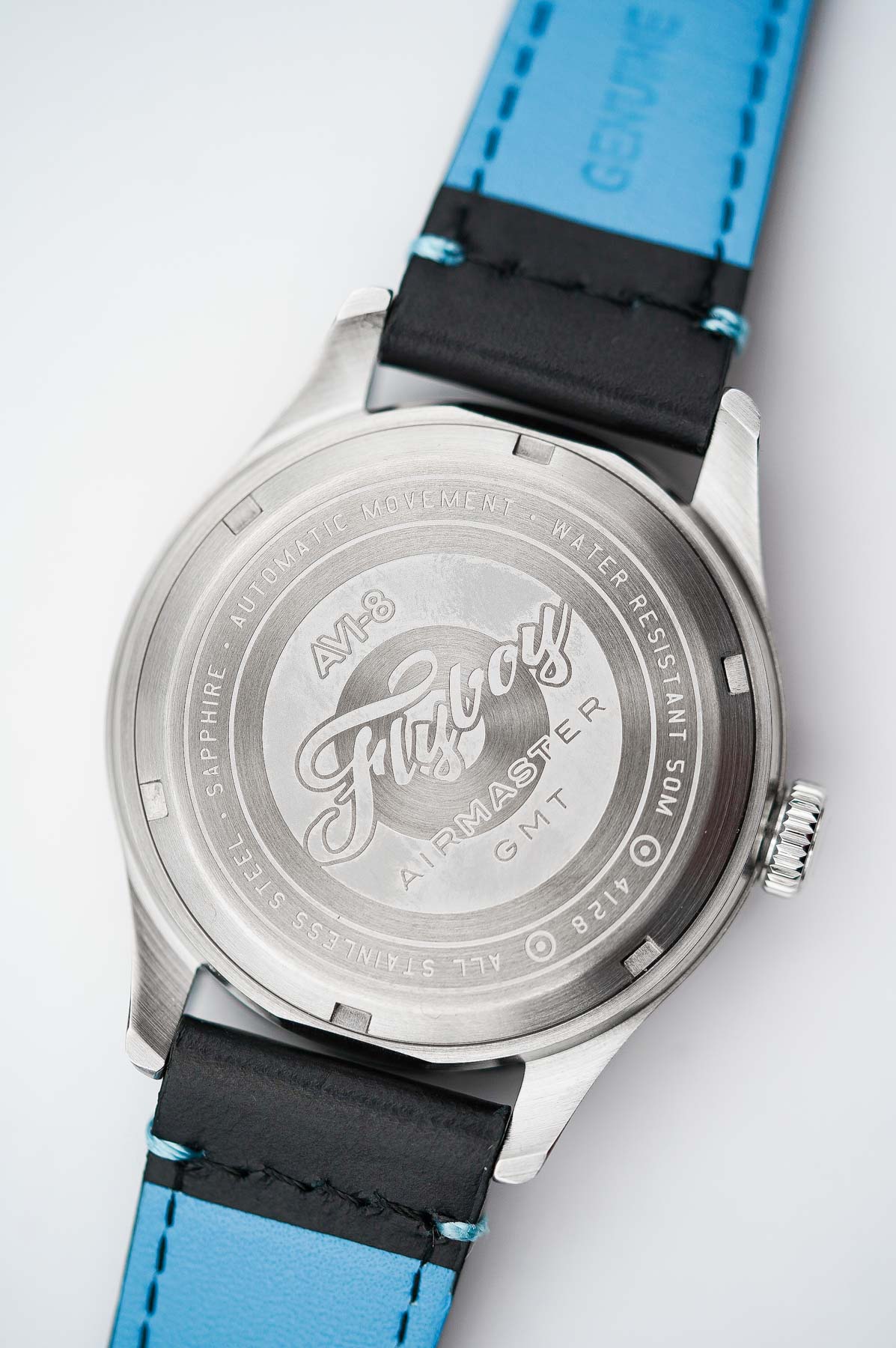Topping the dial is a bi-directional 120-click bezel with a two-part design. The fixed inner section is done in bare stainless steel with an engraved minute track, while the rotating outer ring features a black and blue aluminum insert marked with a 24-hour scale—a practical touch for tracking a second time zone. Positioned at 3 o’clock is a push/pull crown, signed with the AVI-8 logo. The crown offers good grip and tactile feedback, making time-setting a smooth experience. Around the back, the solid stainless steel caseback is engraved with the model name and key specifications, contributing to the overall tool-watch feel. Protecting the dial is a domed sapphire crystal with anti-reflective coating, a welcome addition at this price point. The watch is rated for 50 meters of water resistance (5 ATM)—adequate for everyday use, such as hand washing or exposure to rain, but not suitable for swimming or water sports.