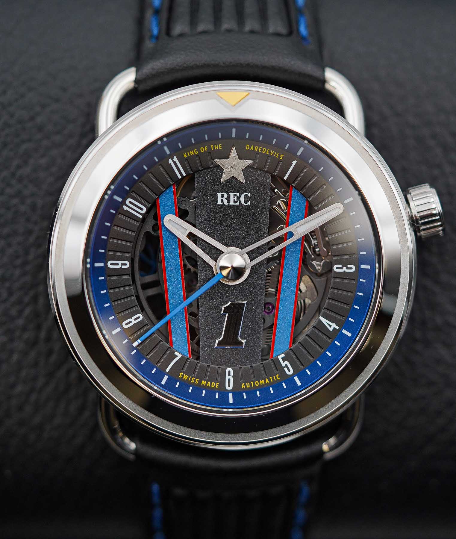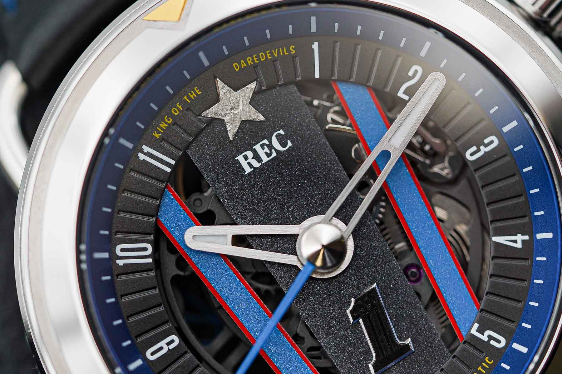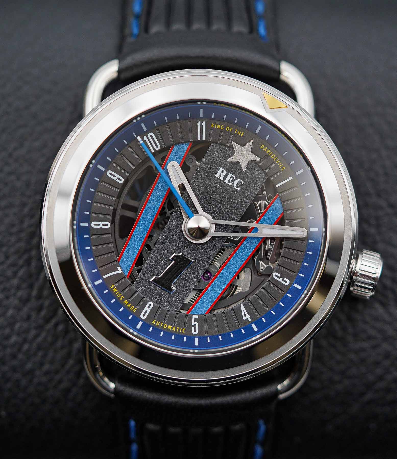 Flanking the dial vertically are angled red and blue stripes, symbolic of the stripes on Knievel’s jumpsuits and helmets. This detail, while relatively simple, reinforces the Americana vibe and injects a sense of movement and energy into the face of the watch. At 6 o’clock, there’s an applied “1” logo—Knievel’s personal branding mark—set against a monochromatic American flag. It’s a nice thematic grounding for the dial, serving as both a literal and metaphorical base. The skeletonized silver hands feature luminous tips for nighttime readability, while the second hand is painted blue to contrast against the dark dial surface. These hands are well-proportioned and fit the aesthetic of the watch, balancing legibility with flair. Cutouts in the dial at 3 and 9 o’clock subtly reveal the skeletonized movement beneath, adding technical intrigue. The entire dial design walks a fine line between homage and excess, and REC nails the execution. It’s exuberant without being cartoonish, thematic without being gimmicky.