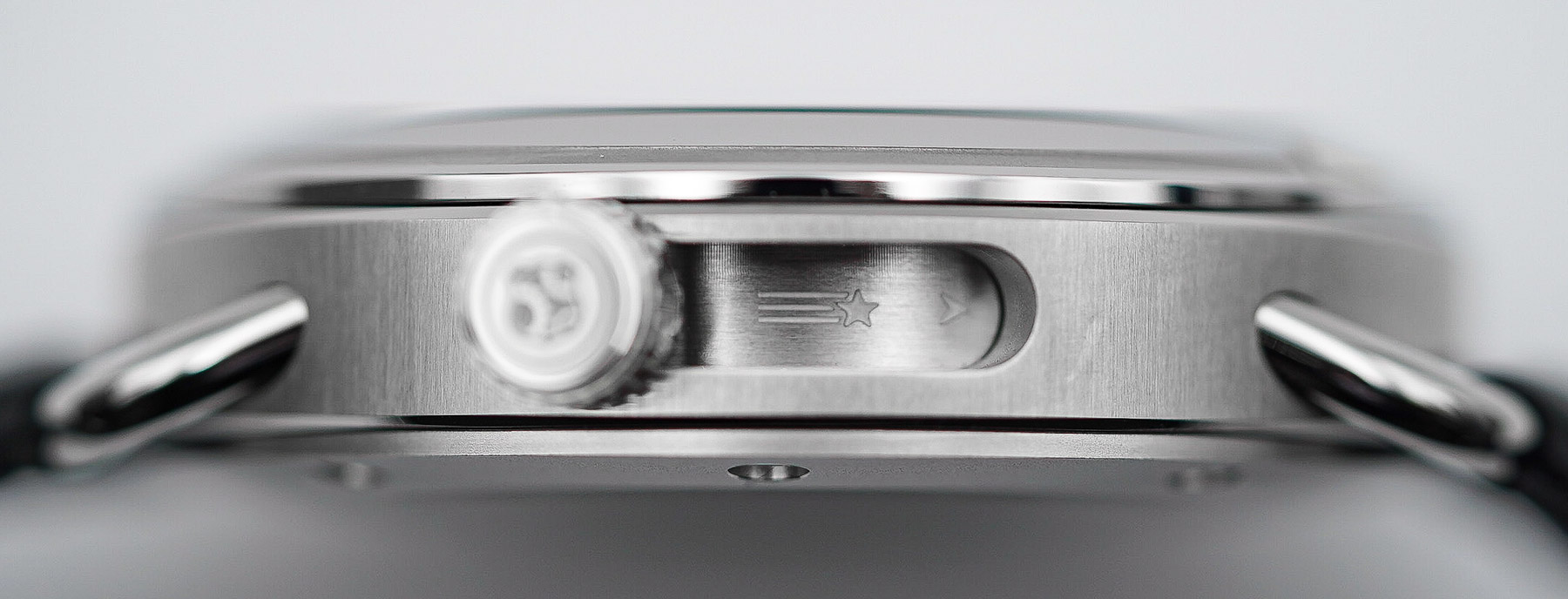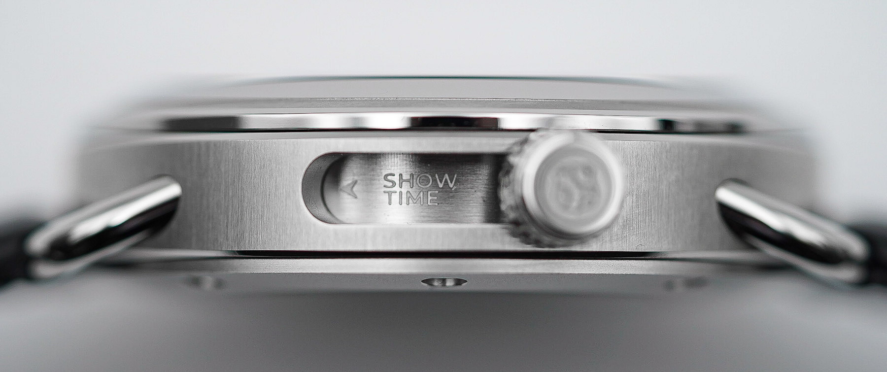 A standout feature is the rotating inner case, which can be adjusted 30 degrees by sliding the screw-down crown along a side cutout. This mechanism allows the wearer to switch between “SHOW TIME” and a stylized engraved star, offering both functional versatility and a nod to Knievel’s showmanship. The bezel combines polished and sandblasted finishes, accented by a gold triangle at the 12 o’clock position, adding a touch of elegance to the rugged design. The blend of finishes across the case is masterful—it reflects light differently depending on the angle, adding visual depth without the need for complex curves or superfluous components.